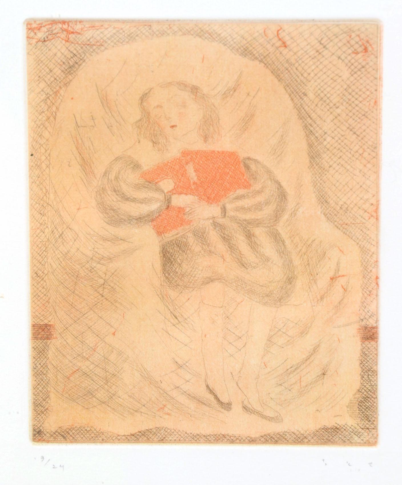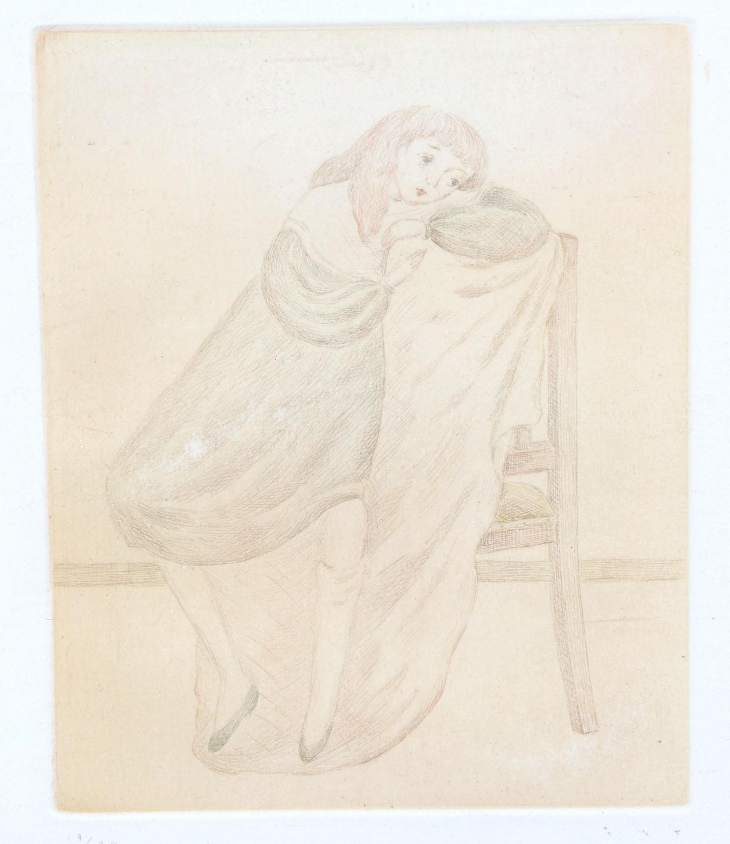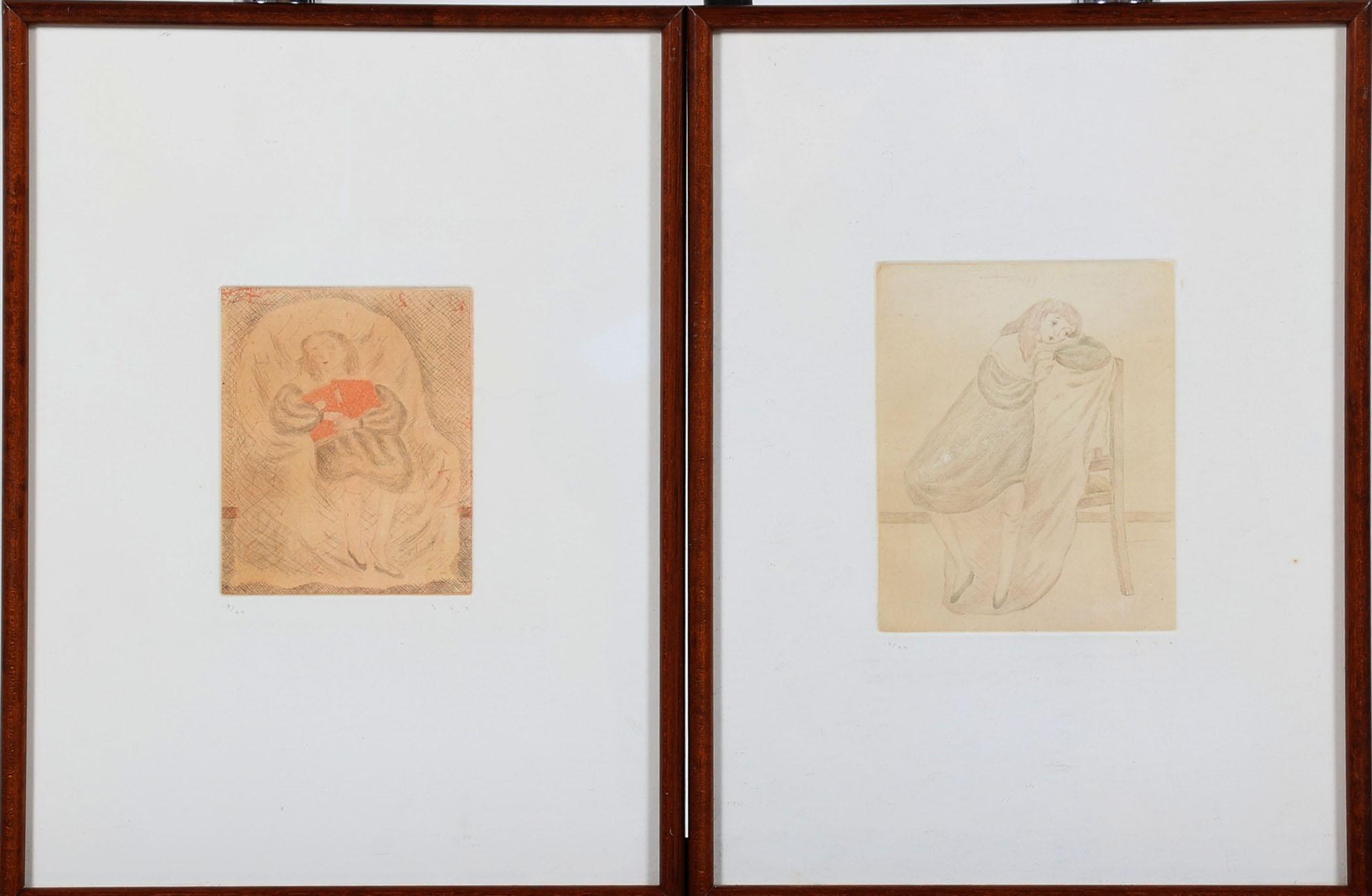 Higuchi Chitose, Meisje op stoel en Jongen met boek, kleurenetsen, genummerd 19/24, 14,5 x 12 cm. en 12 x 10 cm. Provenance: kunsthandel Elisabeth den Bieman de Haas