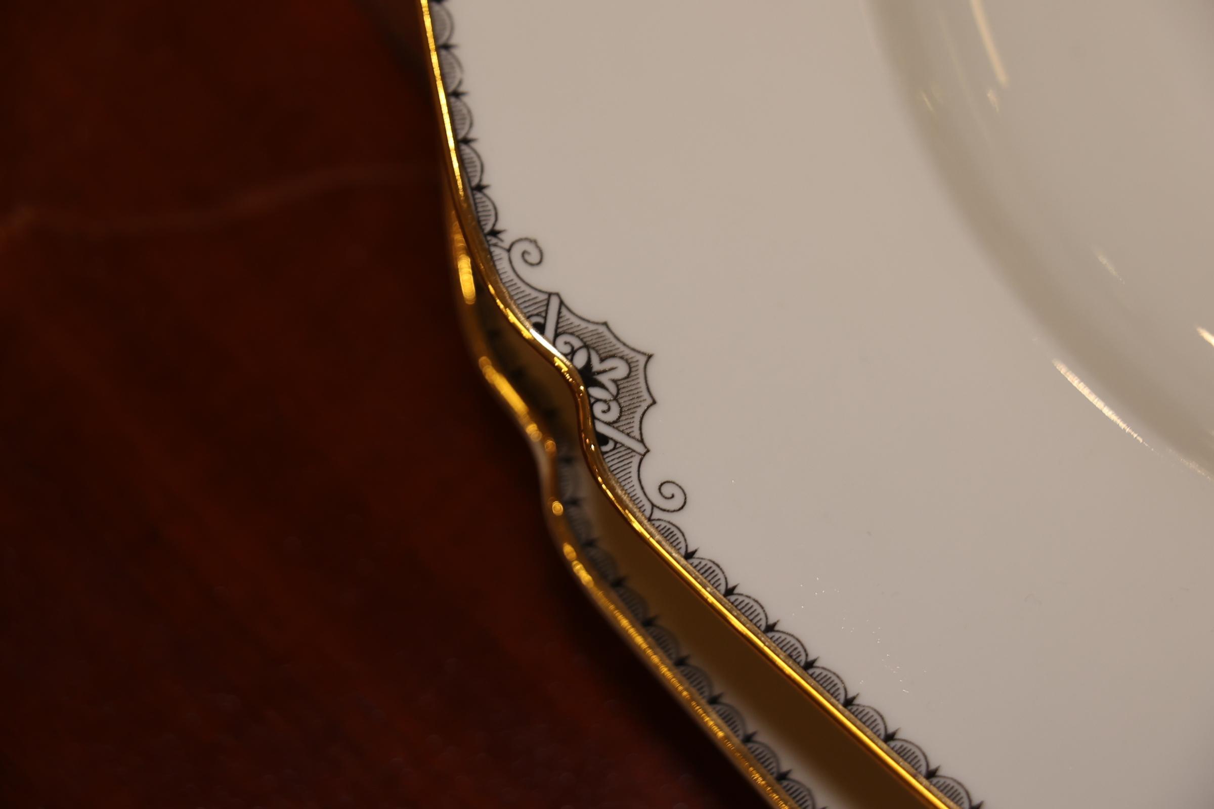 Zeer uitgebreid crèmekleurig porseleinen Hemrich serviesdeel met grijs/witte Art Deco-stijl decoratie en gouden accent afgezet, Bavaria Germany