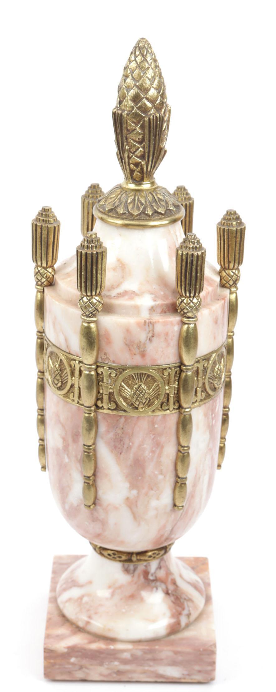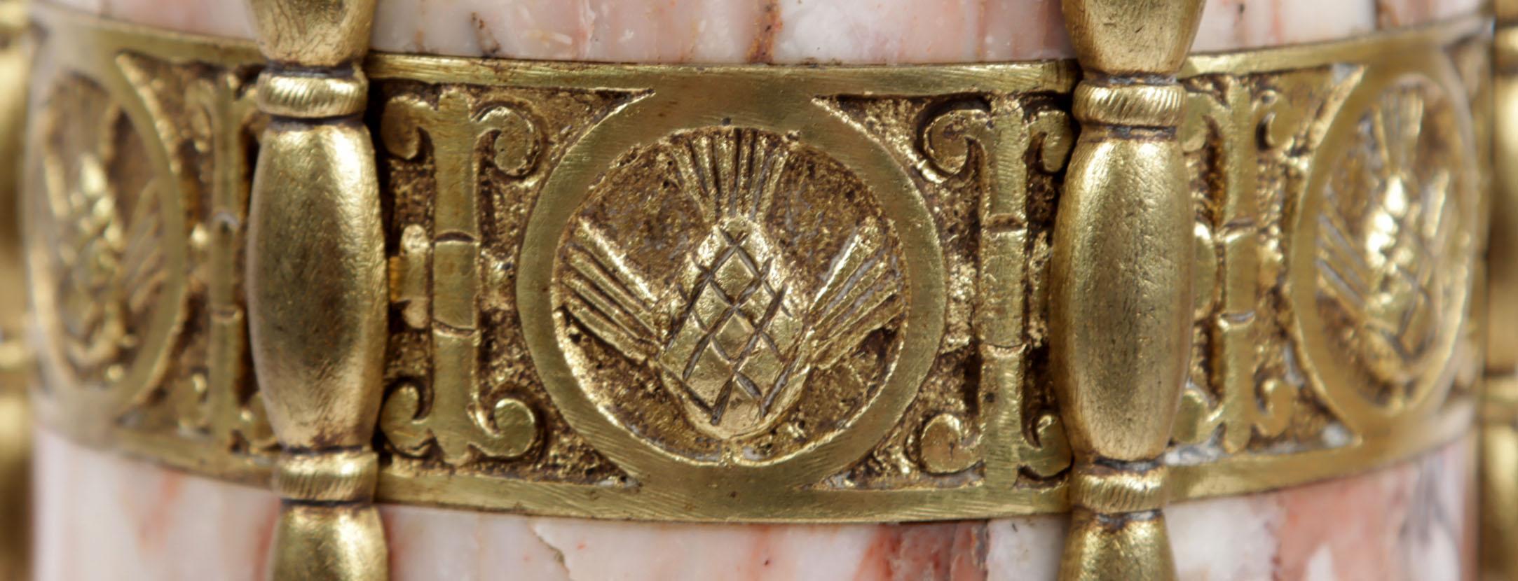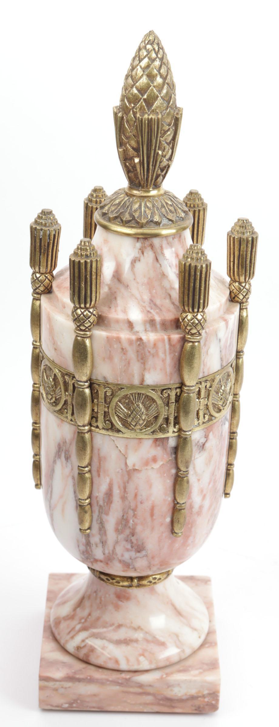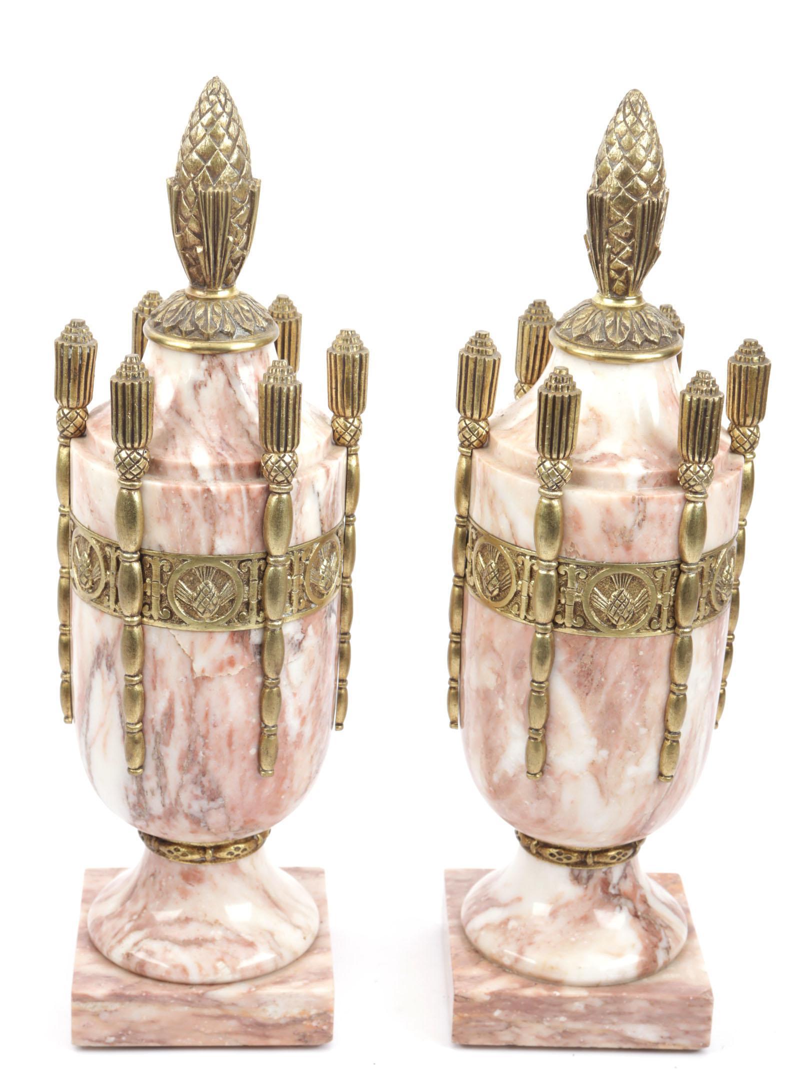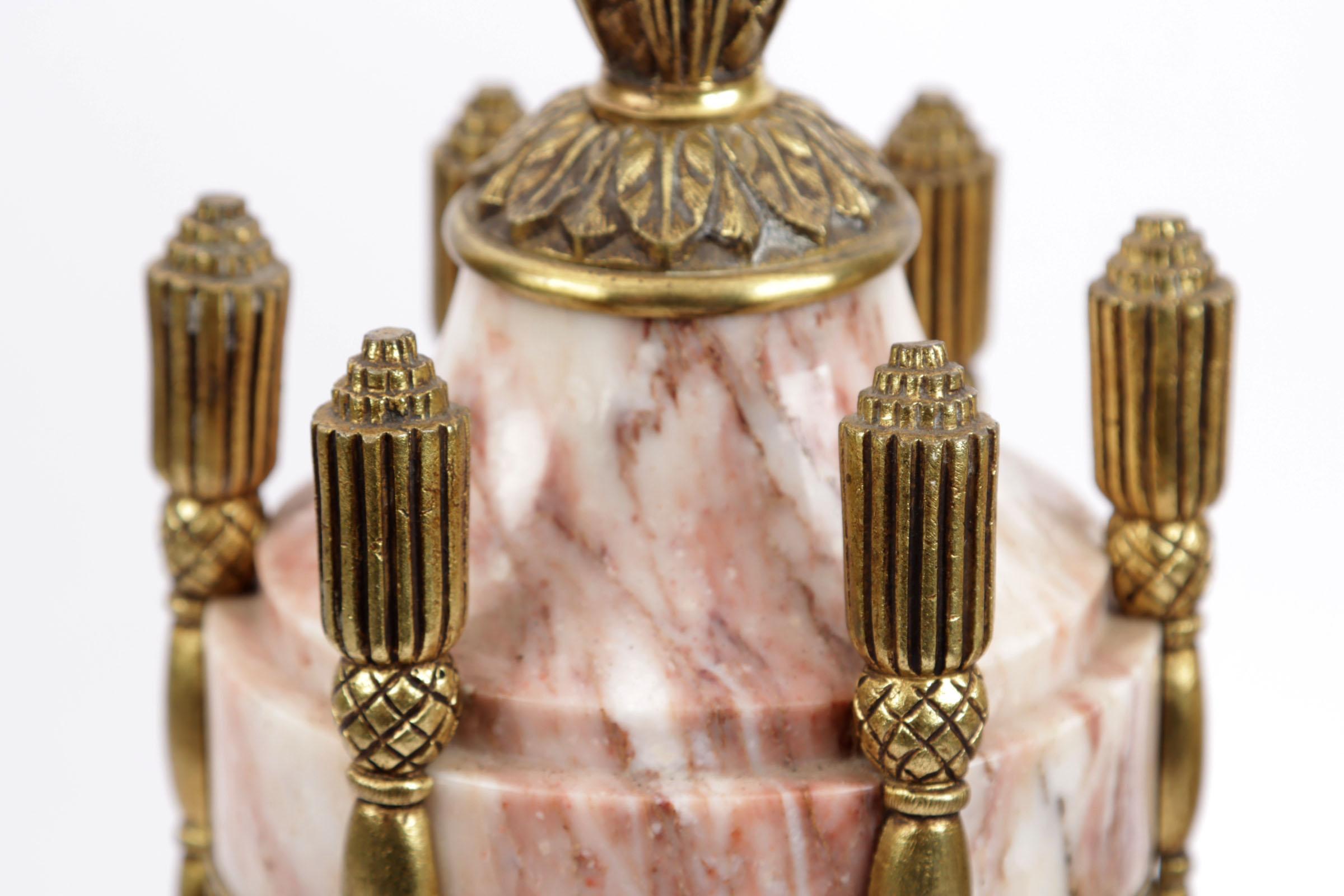 Twee marmeren Art Deco casolettes met koper afgezet, h.43 cm.