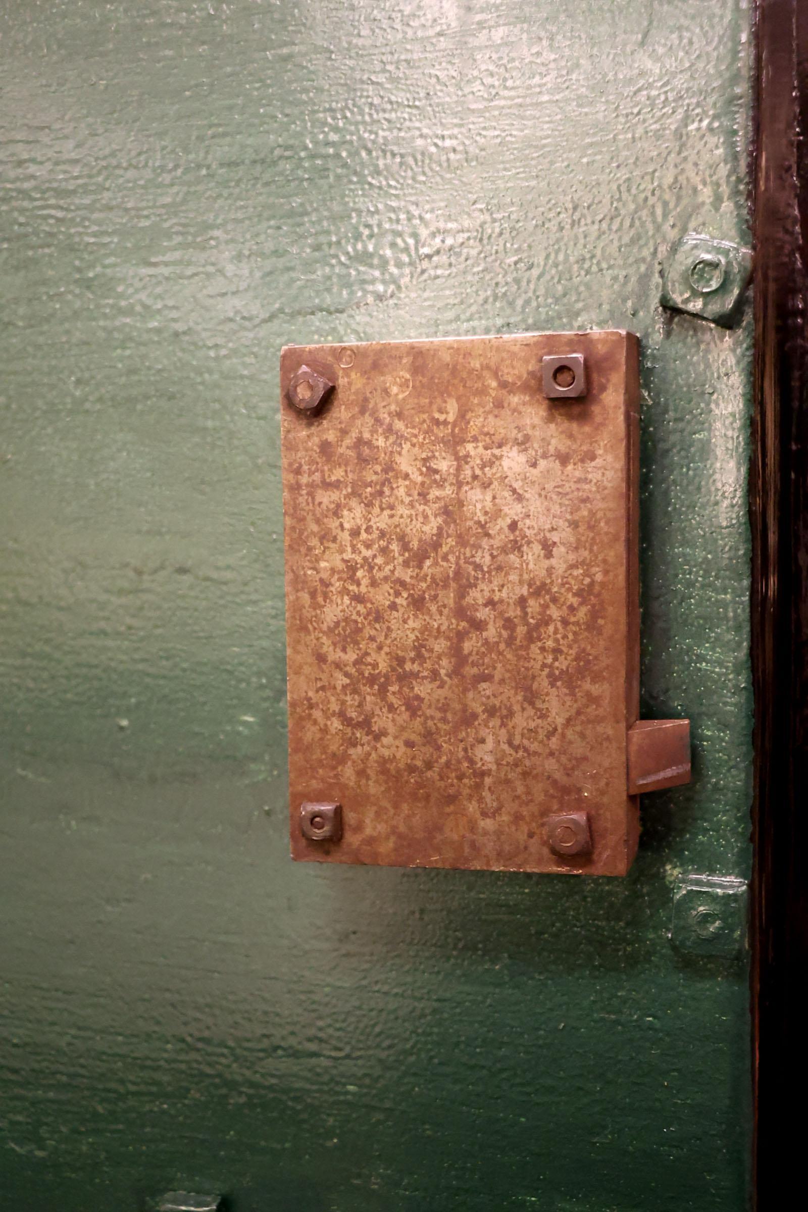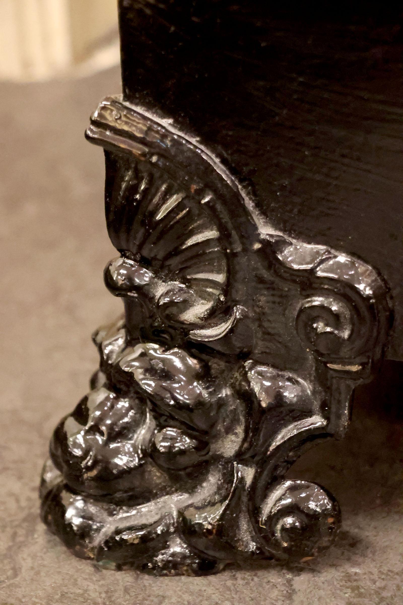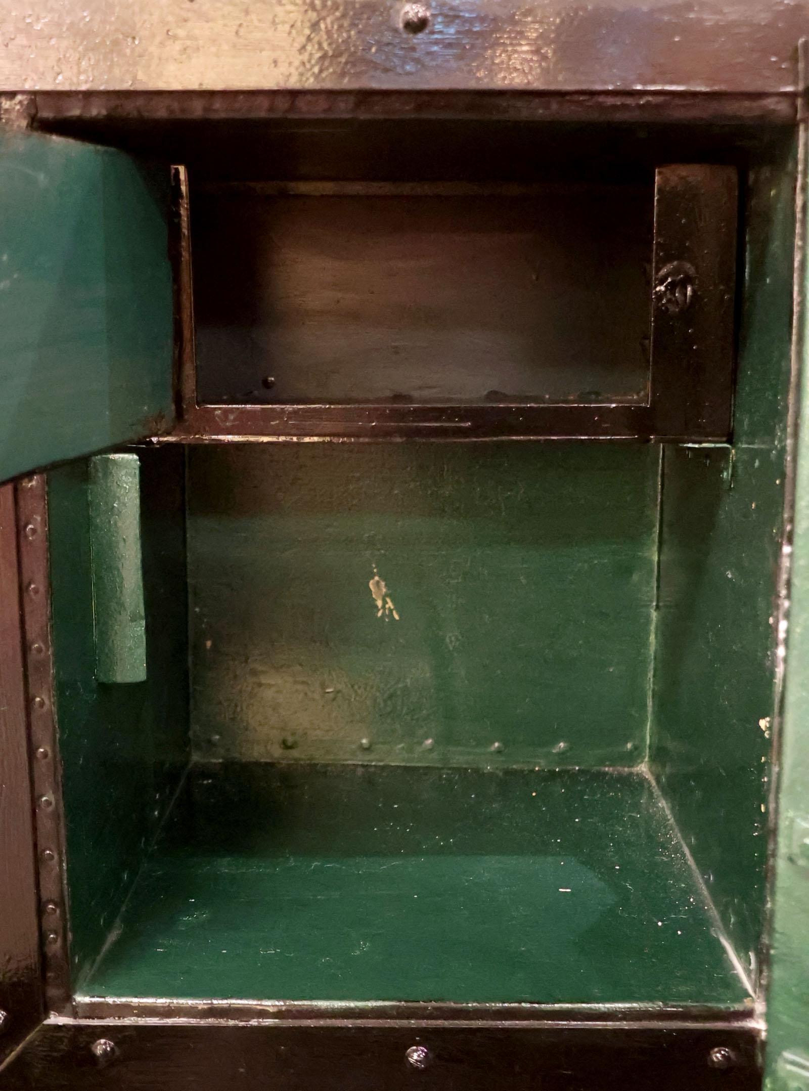 Oude zwart/goud geschilderde ijzeren kluis, h.75 x b.51 x d.42 cm.