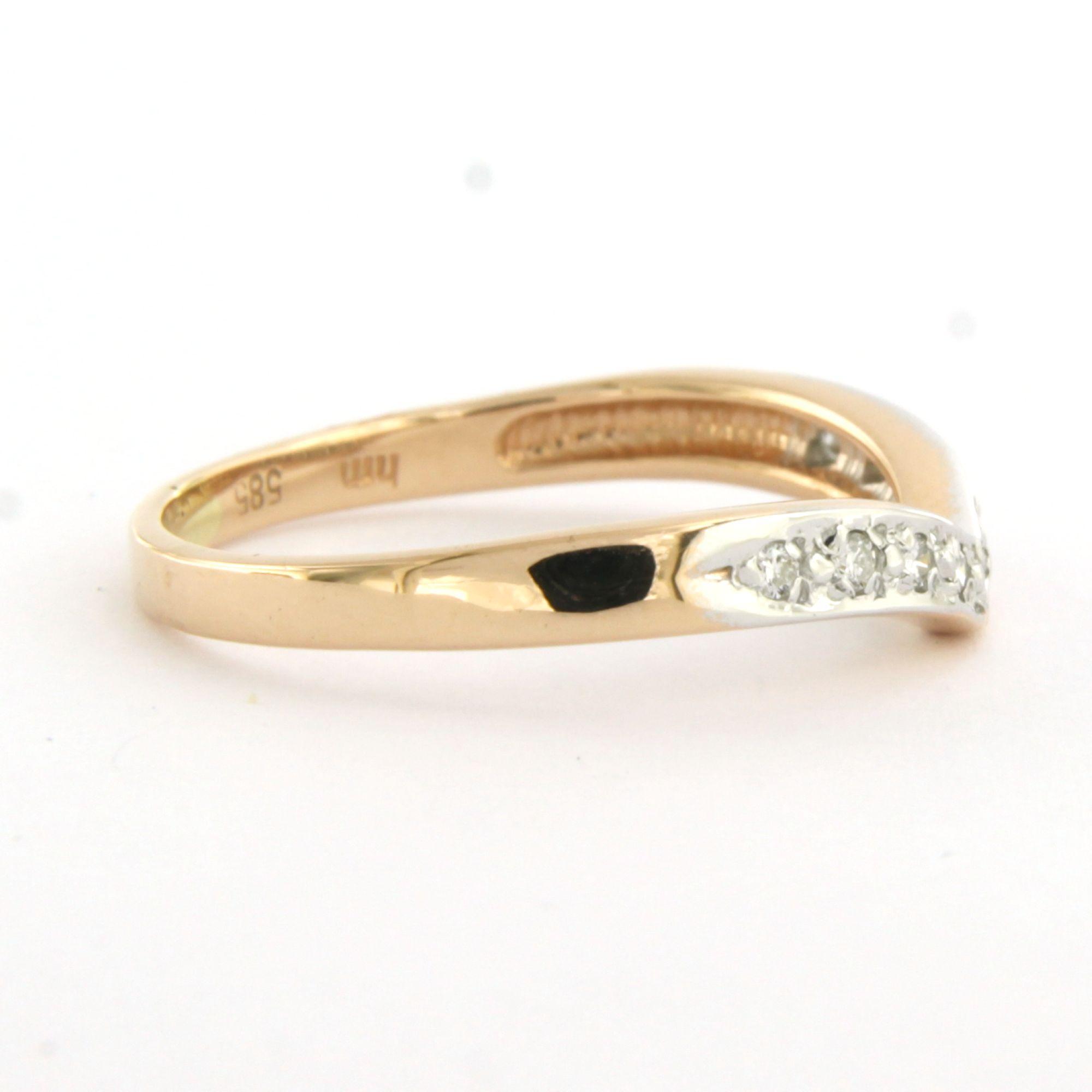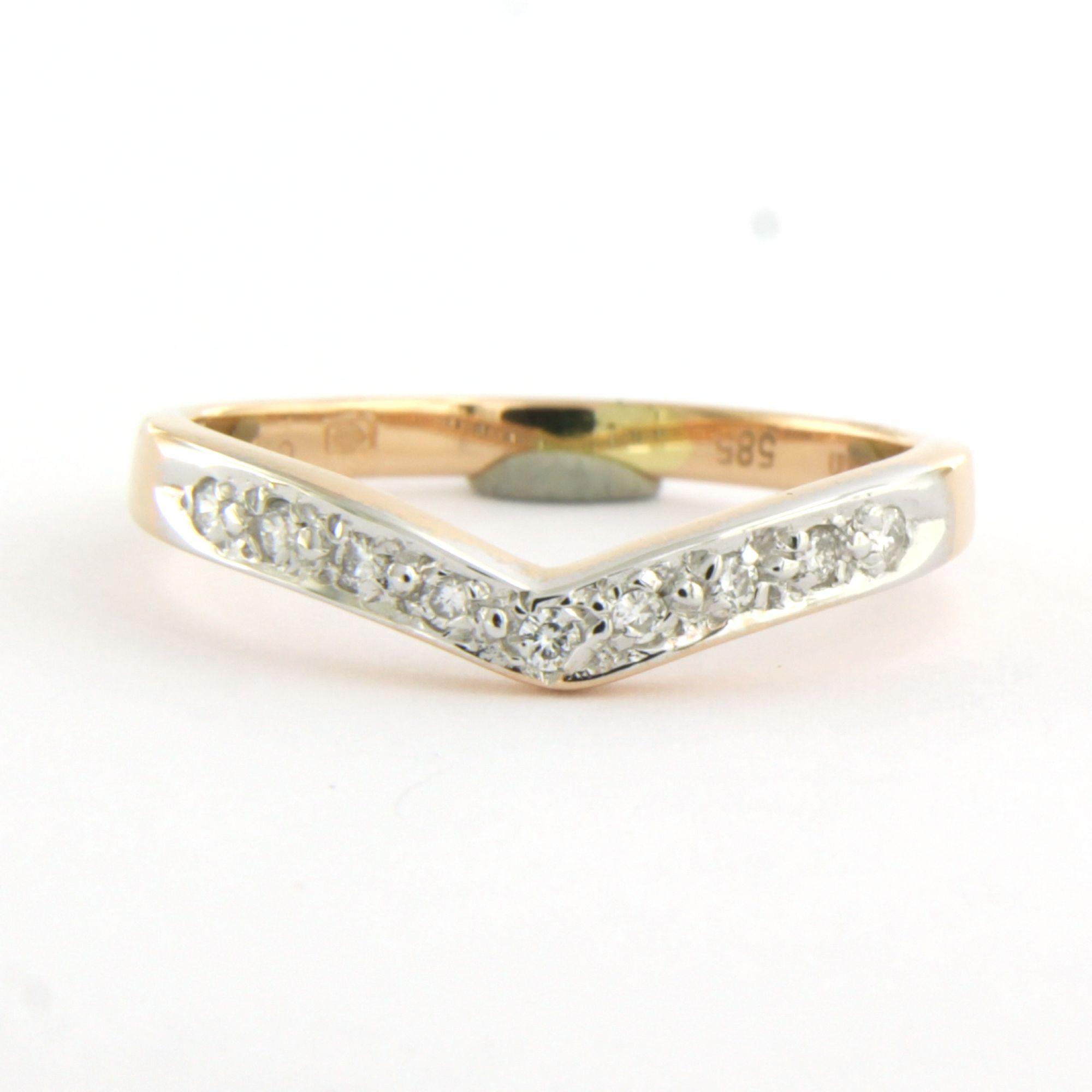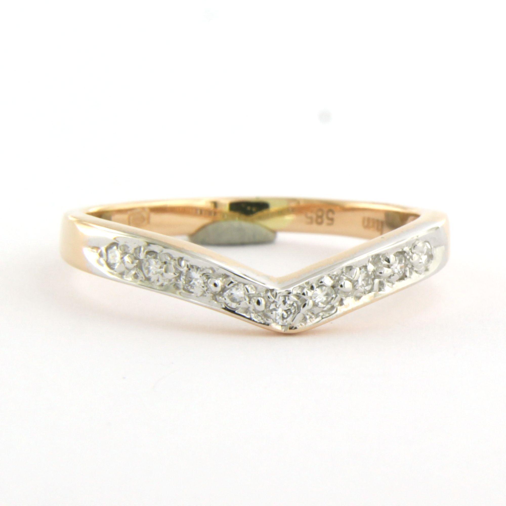 14 Kt. bicolor gouden ring in een vorm van een V bezet met briljant geslepen diamant tot. 0.05ct - ringmaat 17(53)
