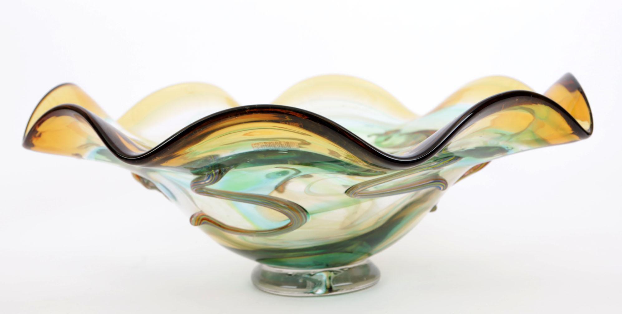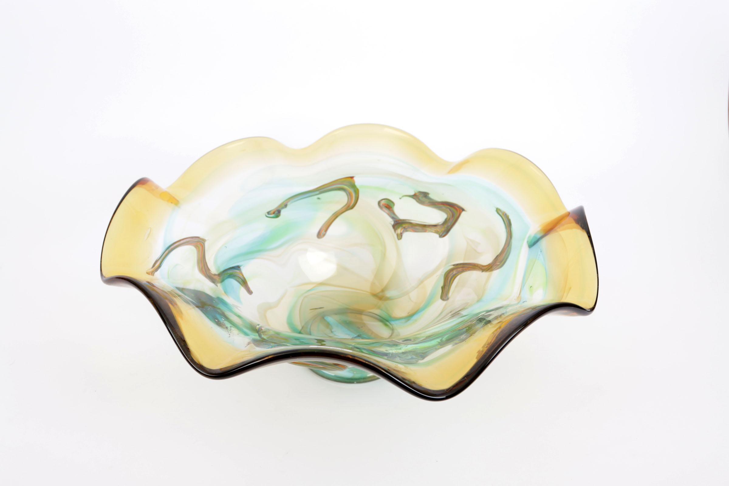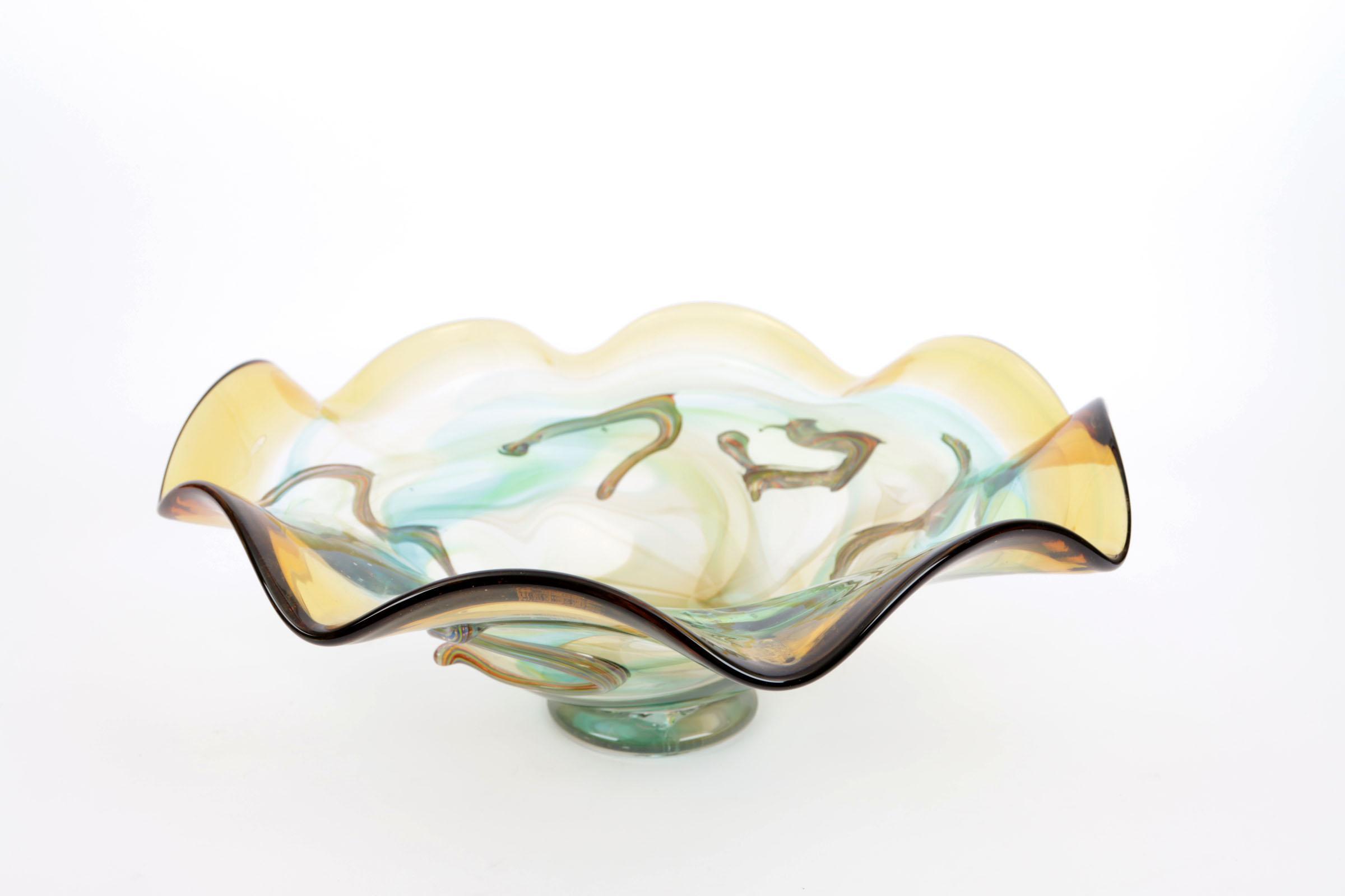 Meerkleurige glazen fruitschaal, h.17 x diam. 43 cm.