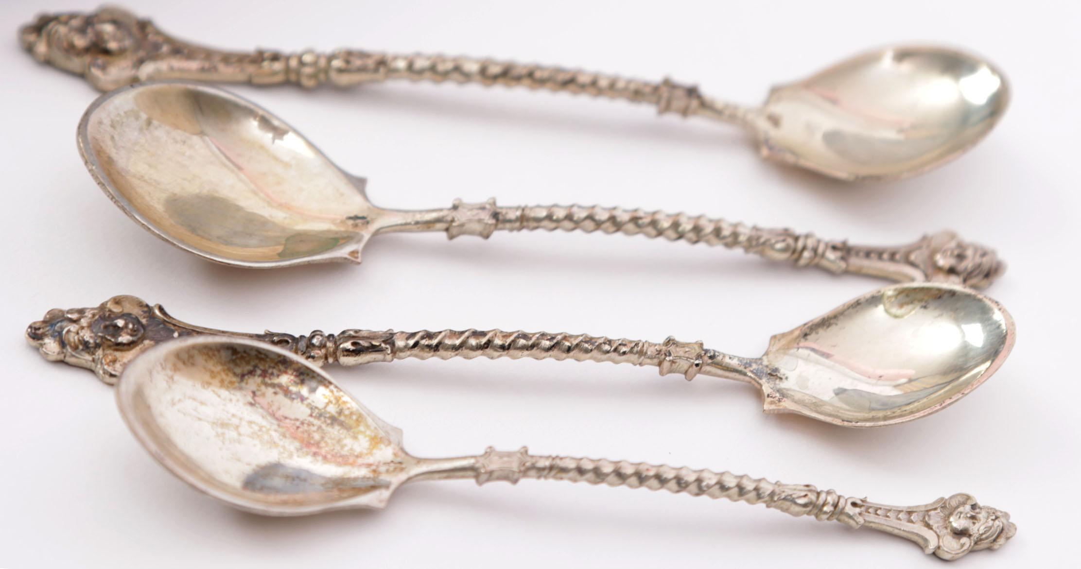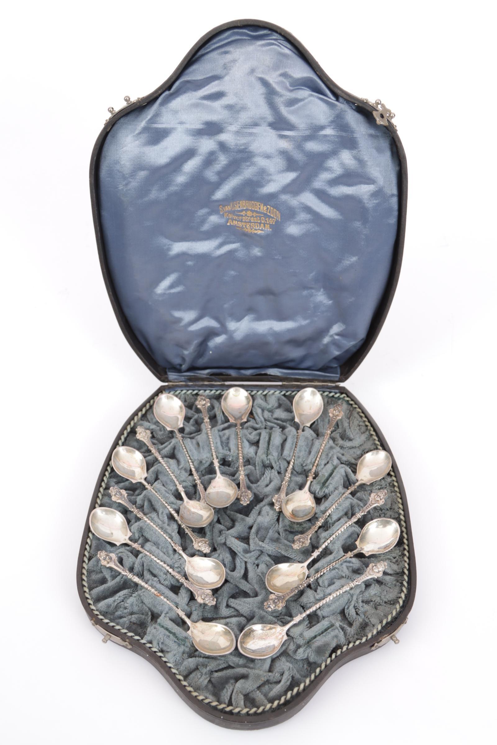 Veertien 2e gehalte zilveren koffielepels in etui, 160 gram