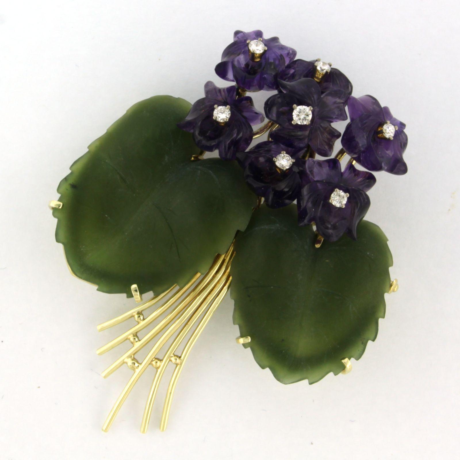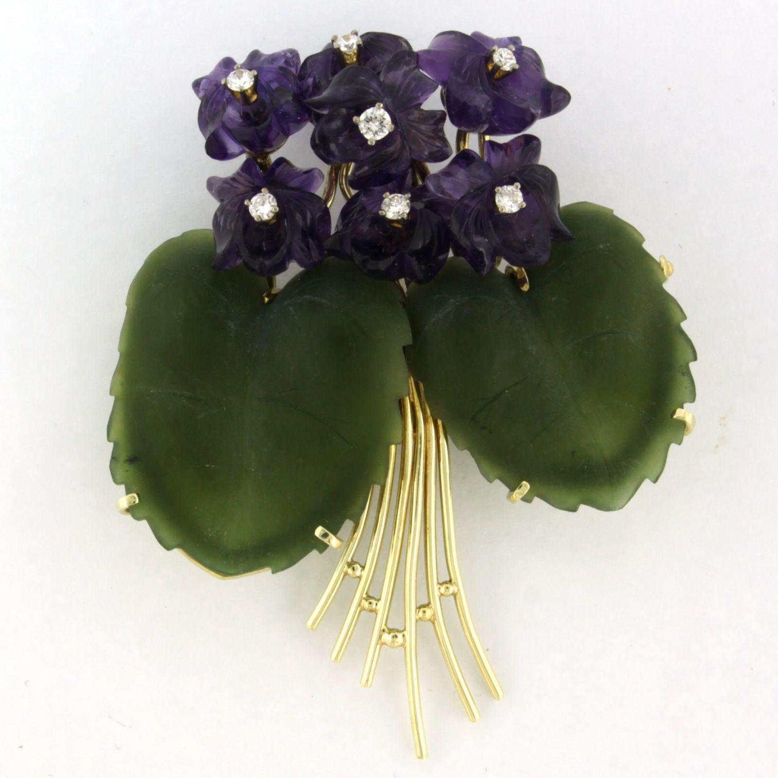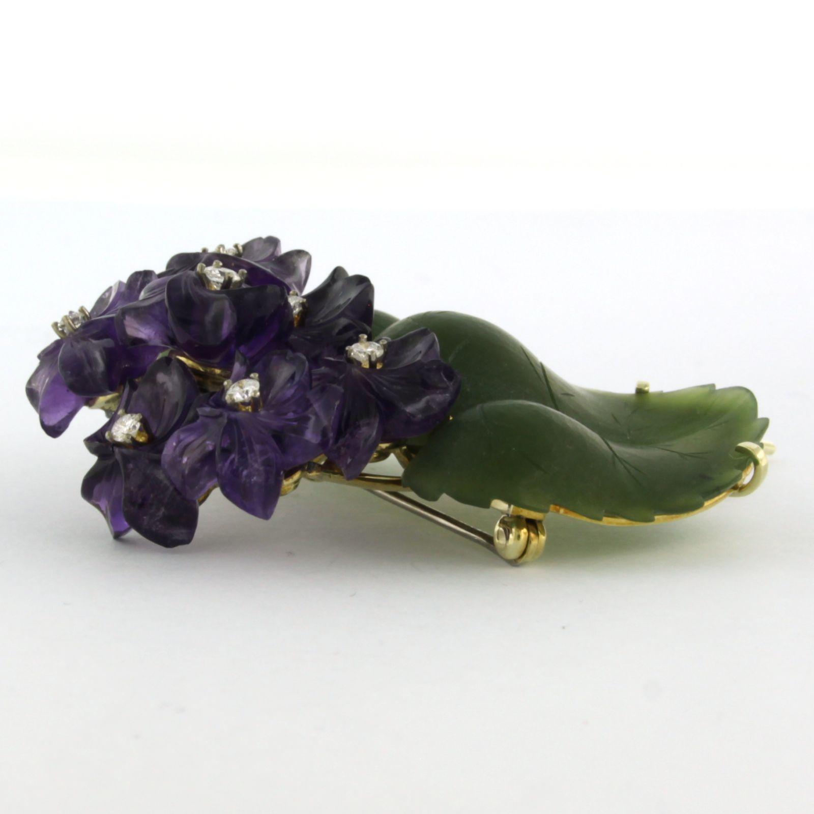 14 Kt. geelgouden broche bezet met jade, amethist en briljant geslepen diamanten tot. 0.40ct
