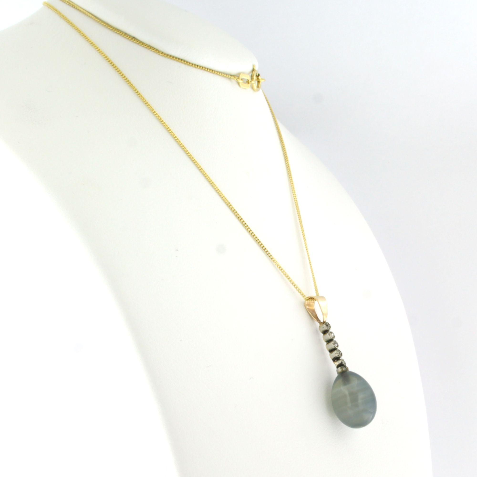 14 Kt. geelgouden collier met goud met platina hanger bezet met een blauw-grijze quartz en oud slijpsel geslepen diamanten totaal circa 0.20ct - 45 cm lang