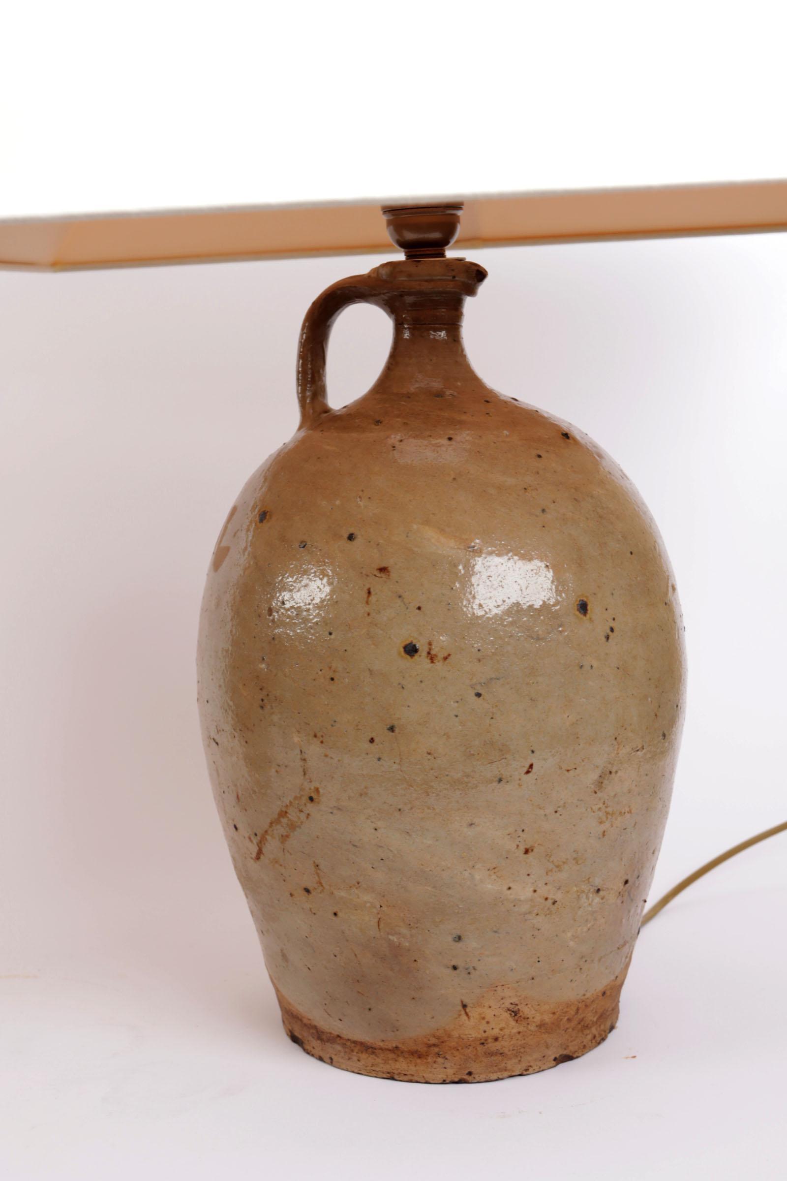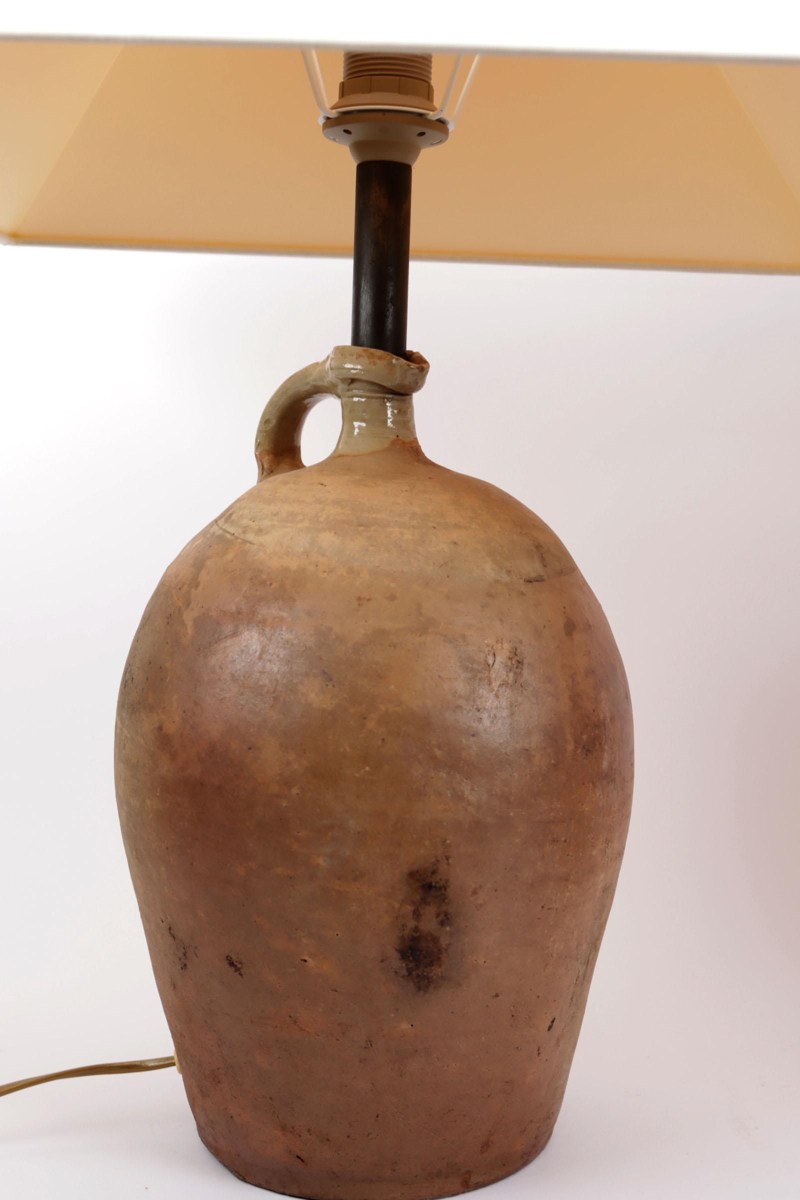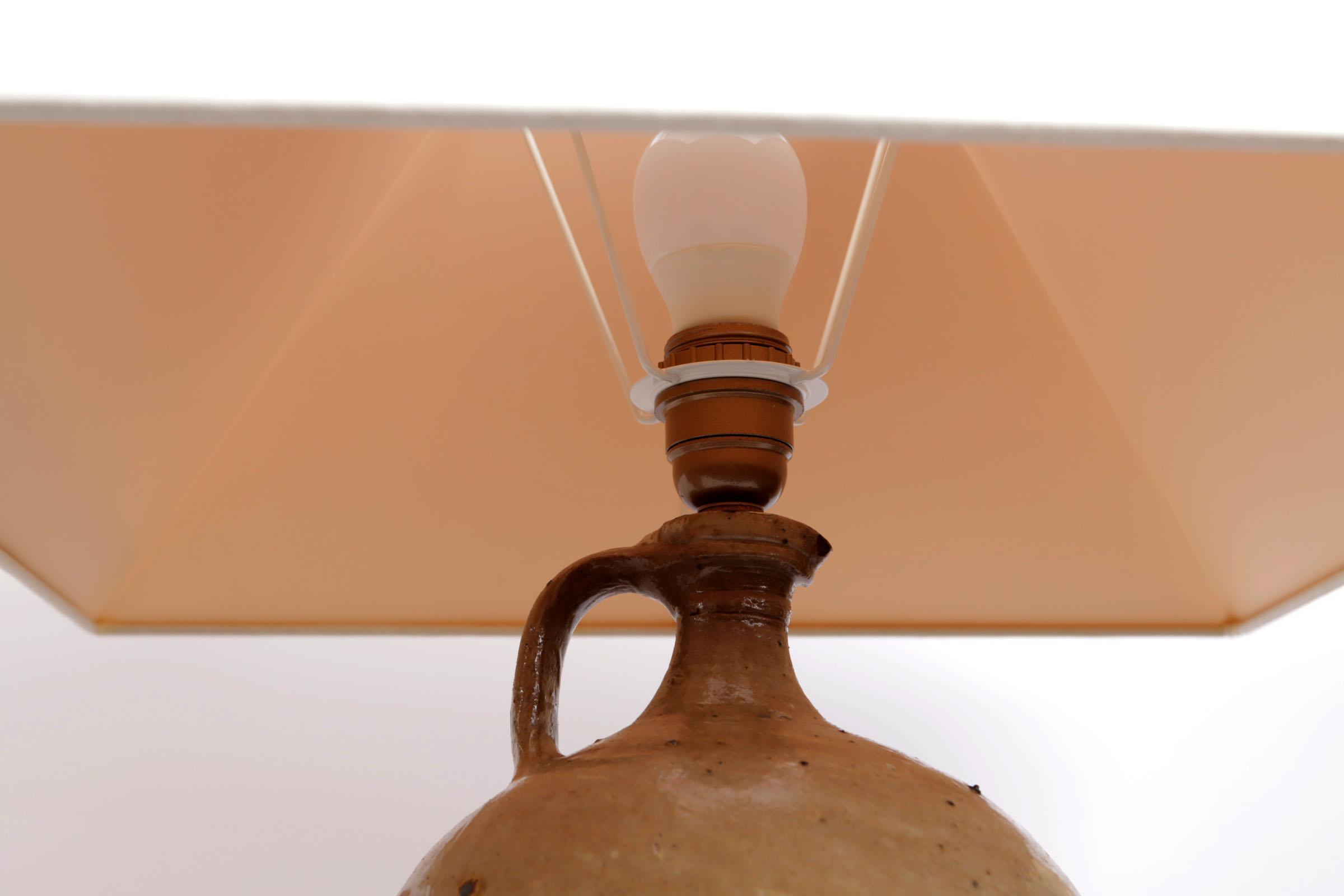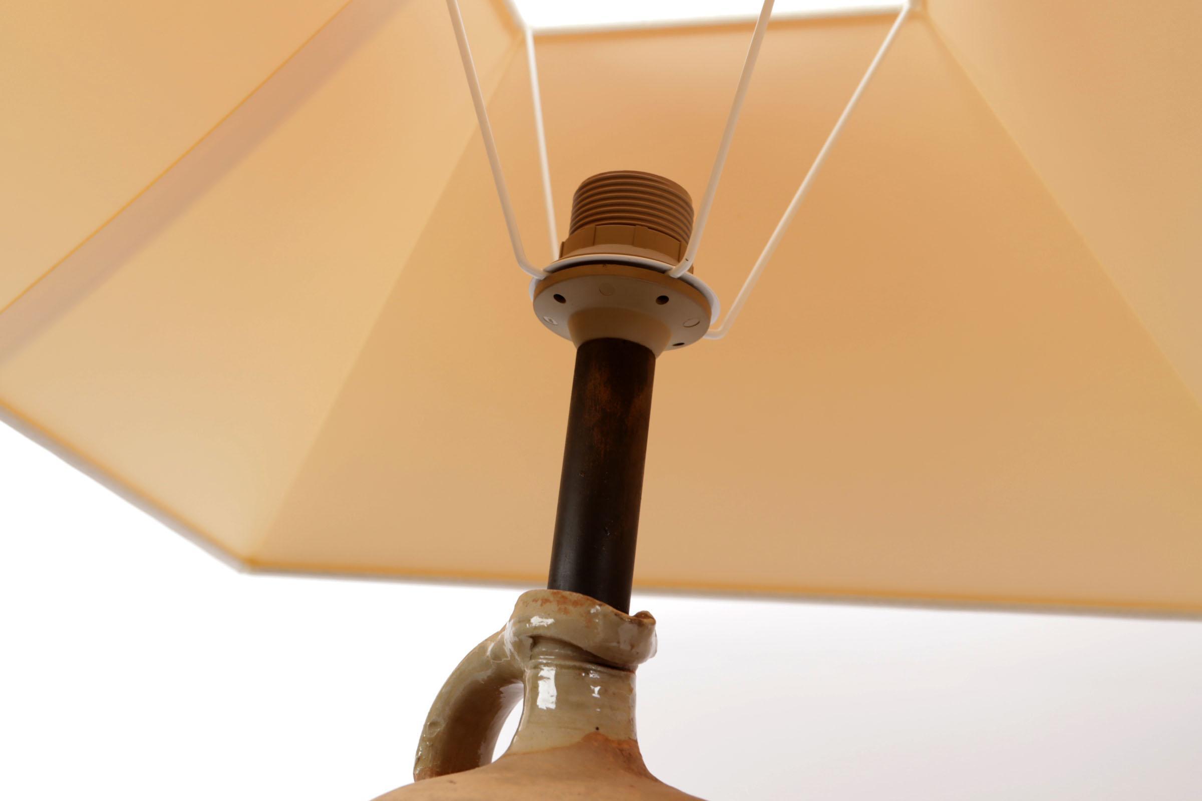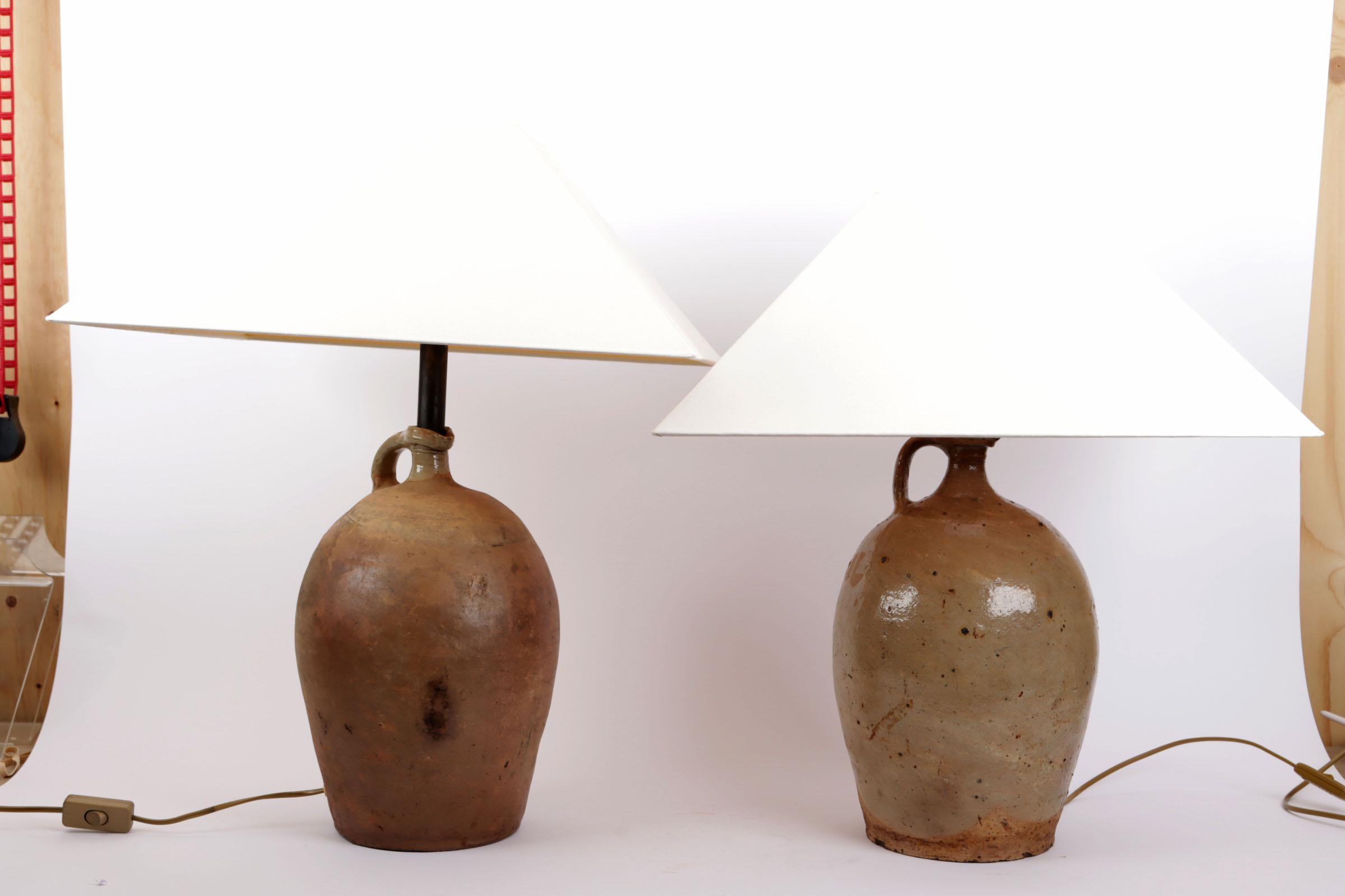 2 Diverse aardewerken lampvoeten met witte kappen, h.58 en 62 cm.