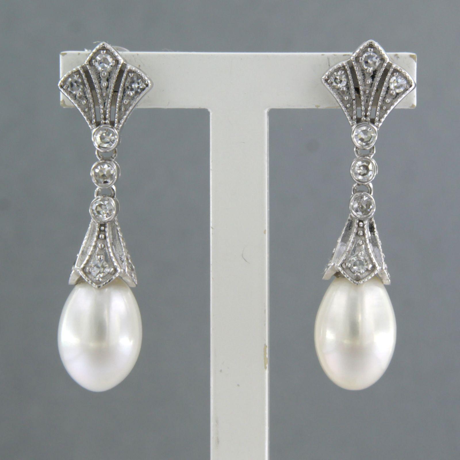 14 Kt. witgouden oorhangers bezet met parel en single cut geslepen diamant tot. 0,30ct