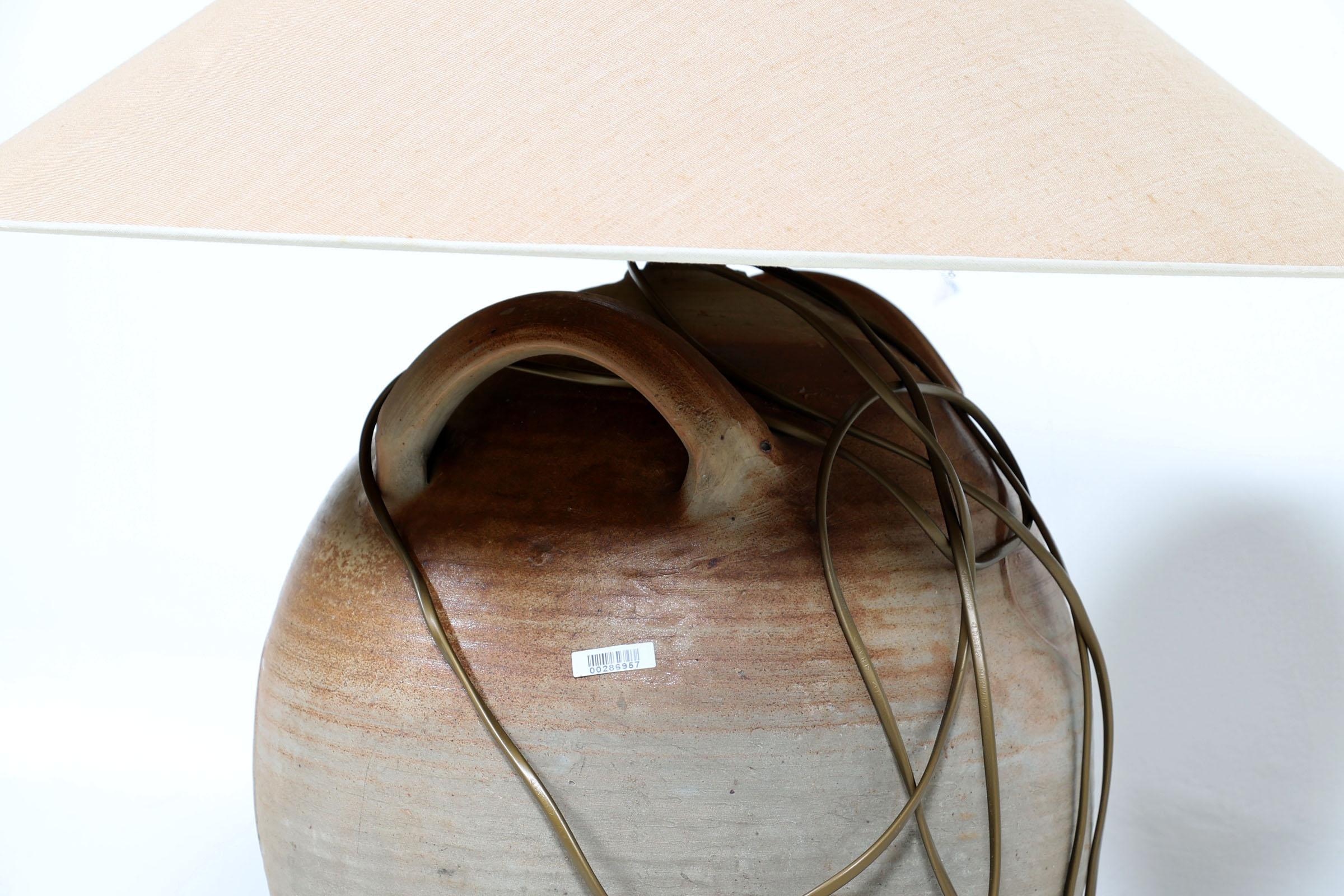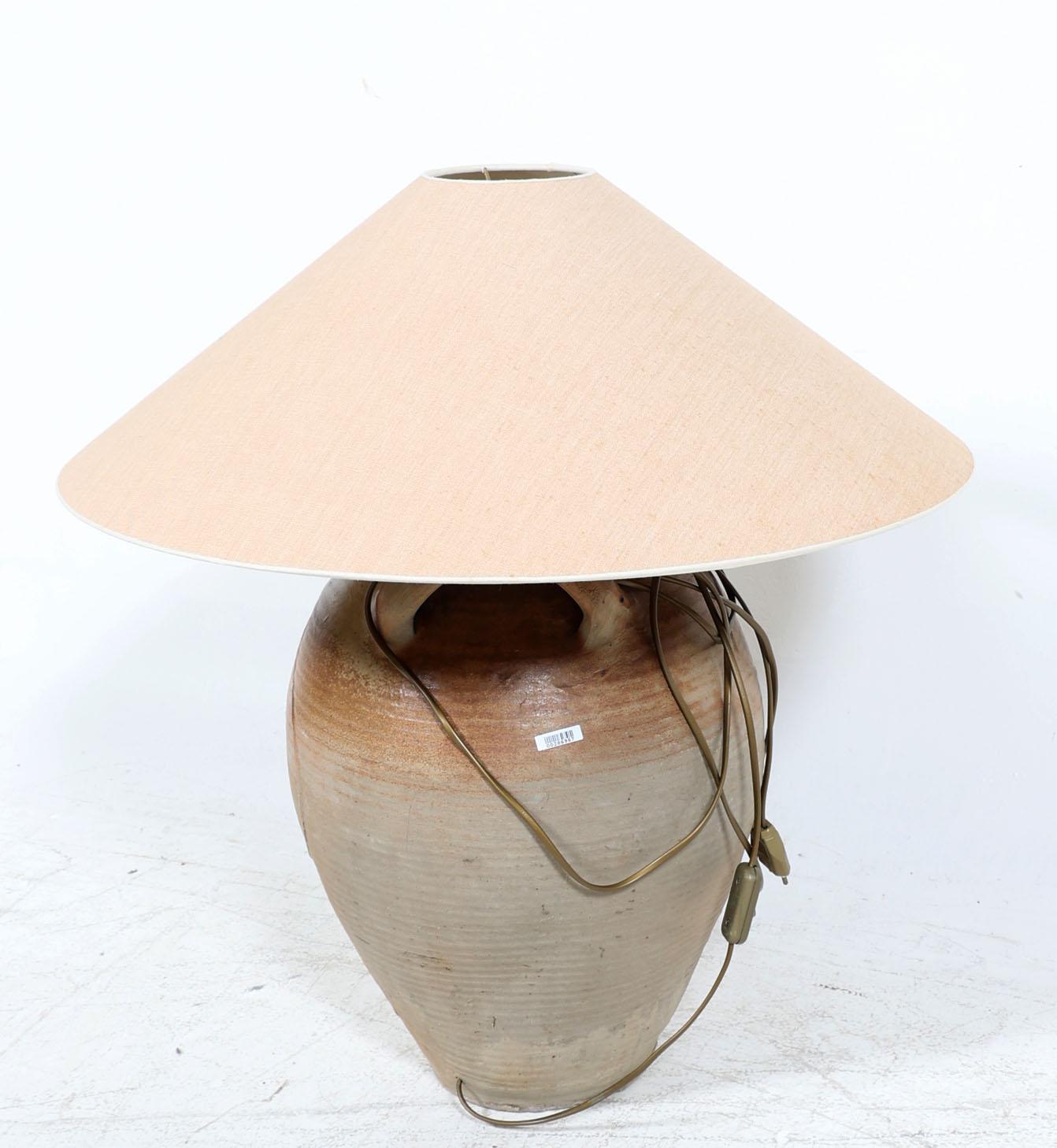 Aardewerken schemerlamp met beige kap, h.70 cm.