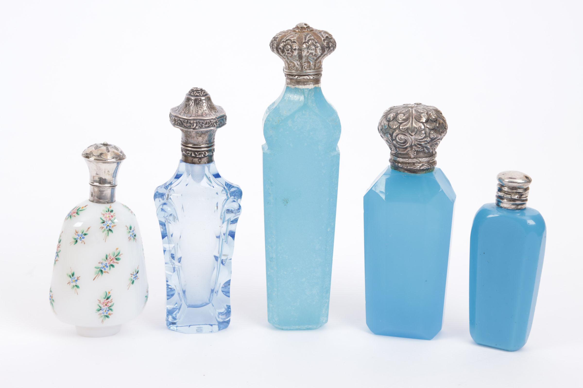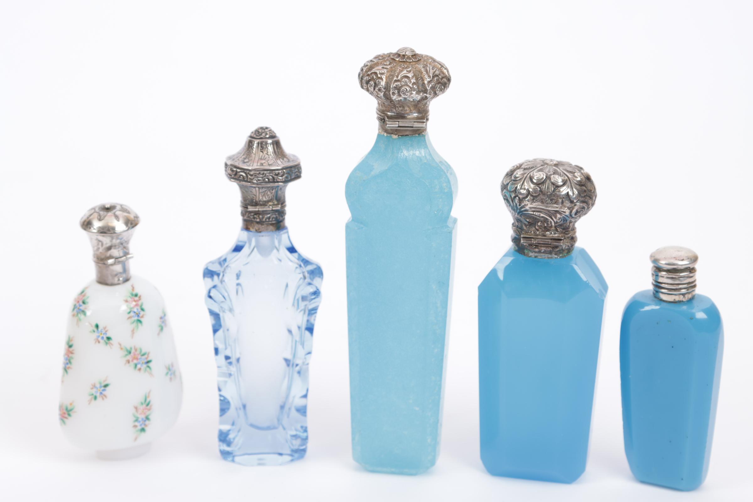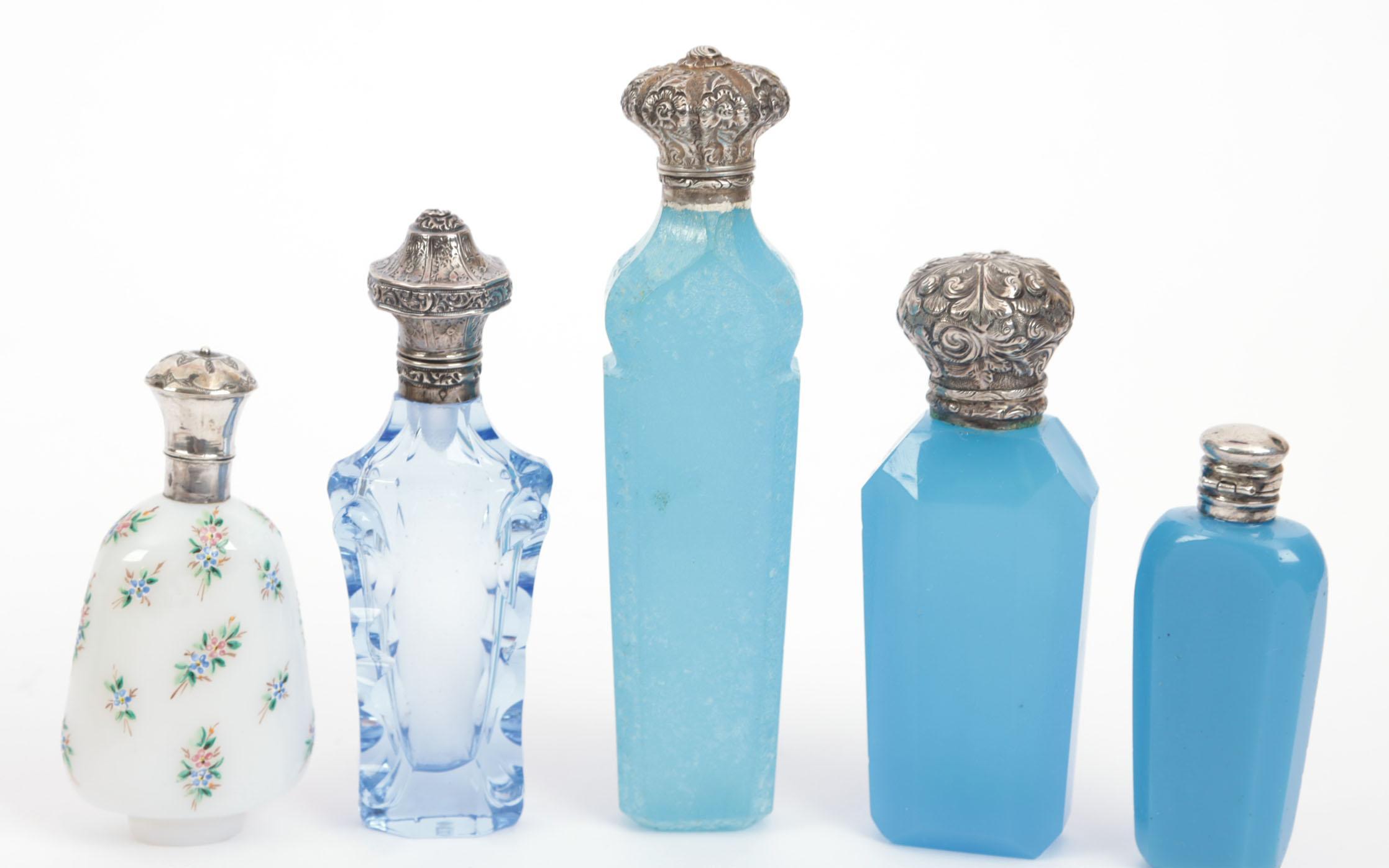 Verzameling van 5 parfumflesjes, waaronder 3 x blauw opaline flessen met zilveren dop, waarvan 2 met glazen binnenstop, 1e helft 19e eeuw-Frans, 1 transparant glazen fles met zilveren scharnierende dop, 1 witte opaline fles met emaile bloemdecoraties. scharnierende zilveren dop en glazen stopje, Nederlands keur, rond 1900, hoogte 8,5 cm
