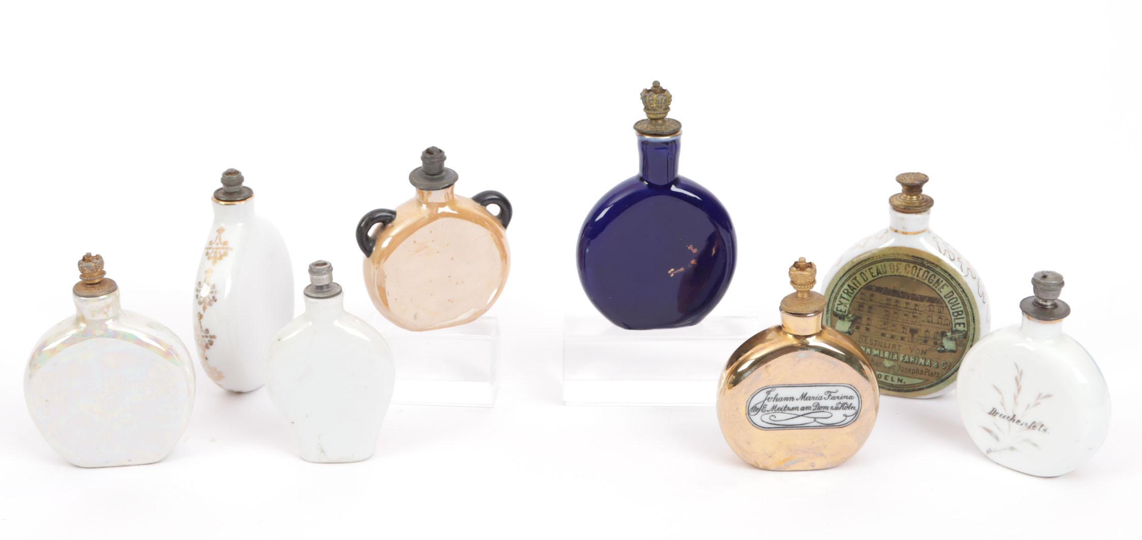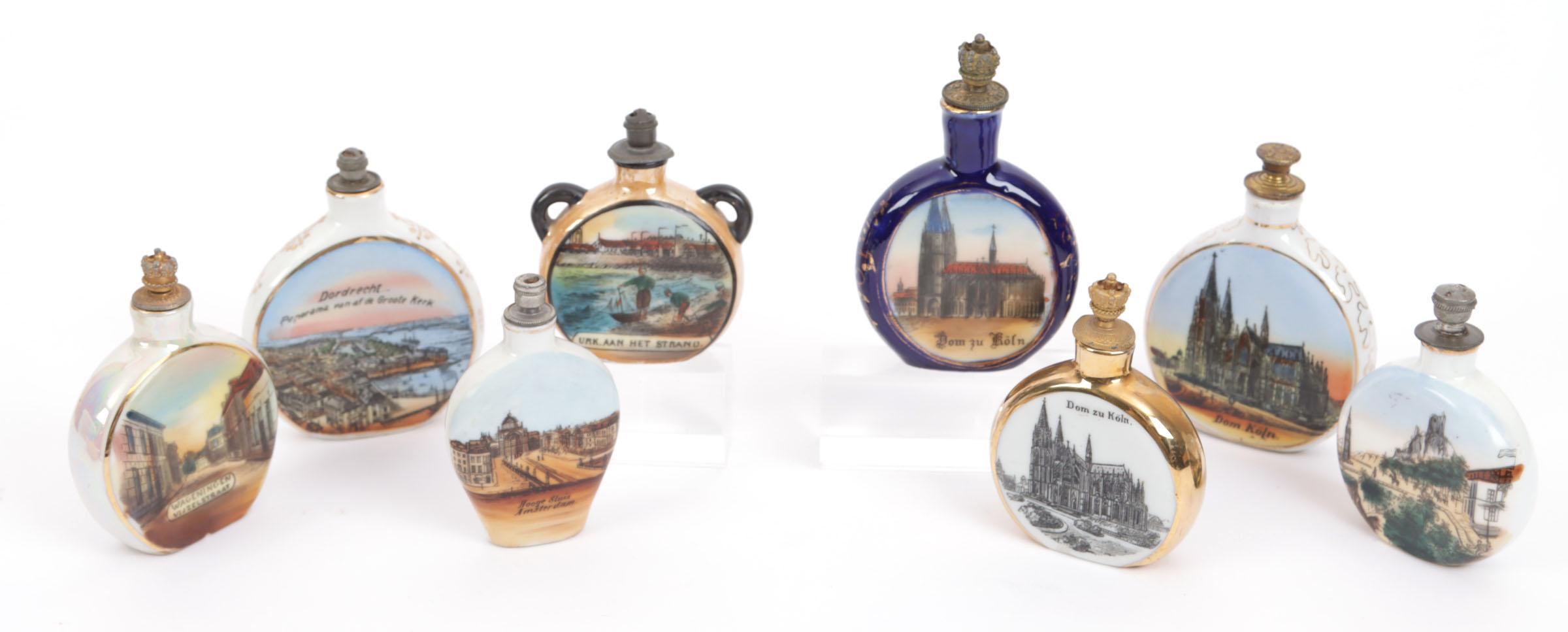 Verzameling van 8 porseleinen souvenir parfumflessen, waaronder van Dordrecht, Urk, Wageningen, Amsterdam, Keulen