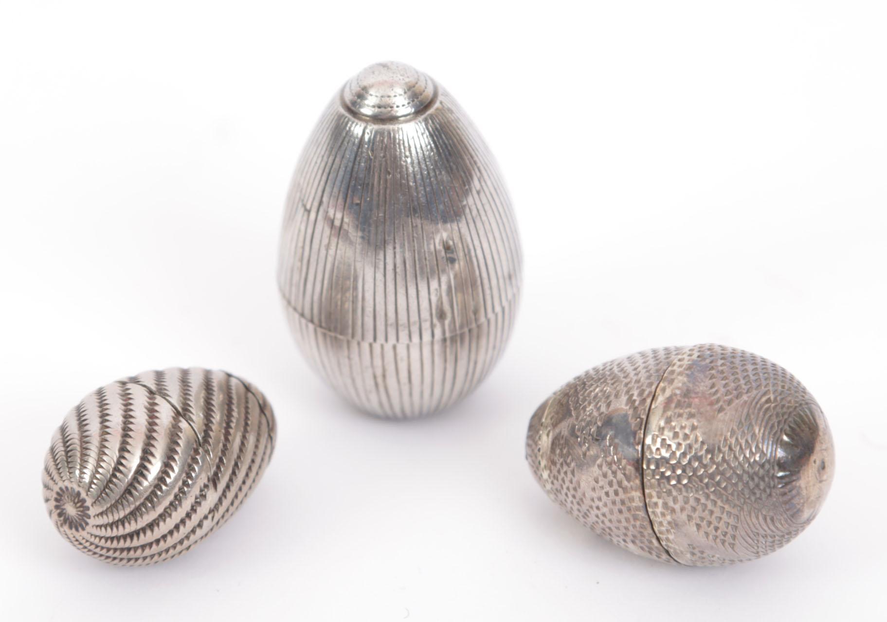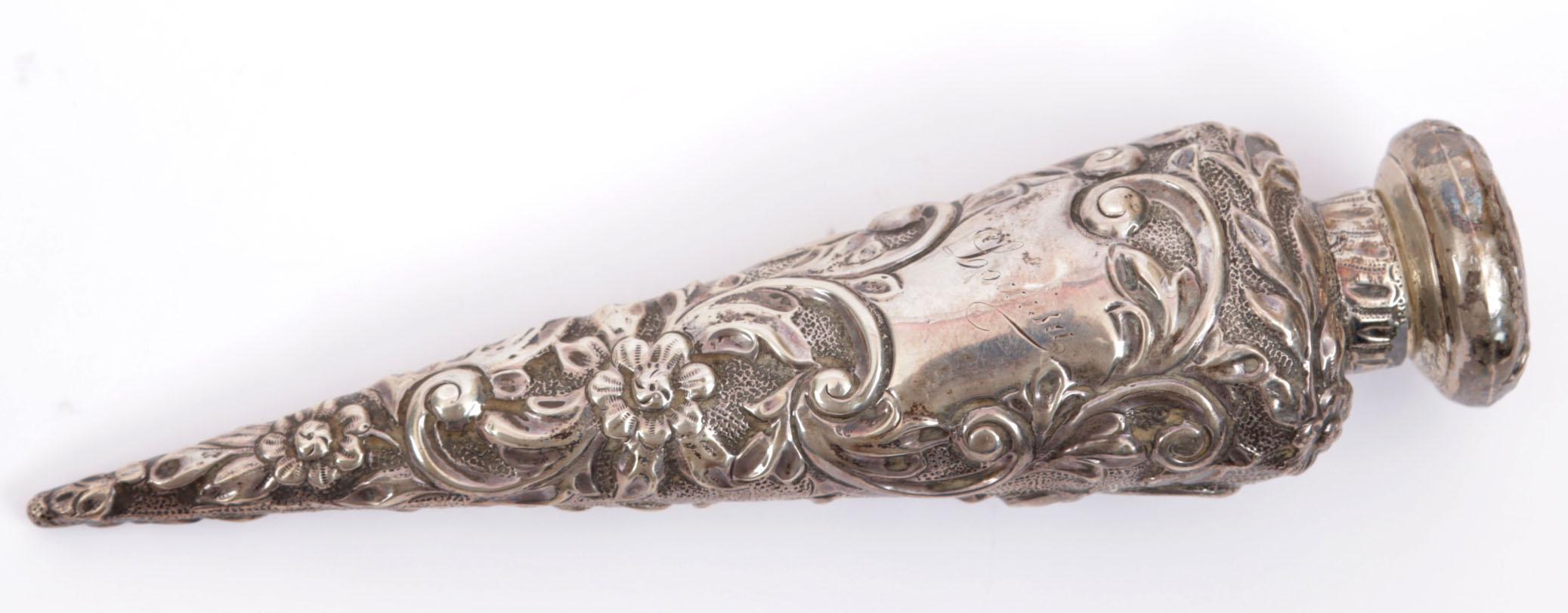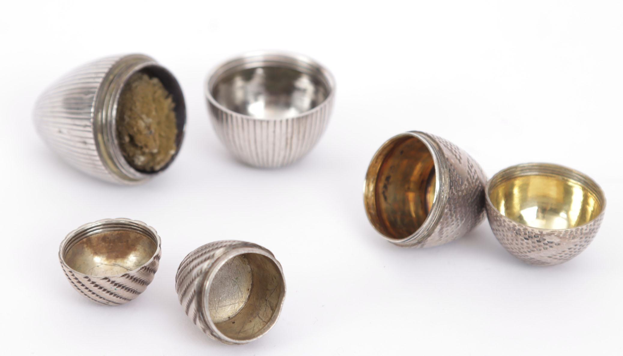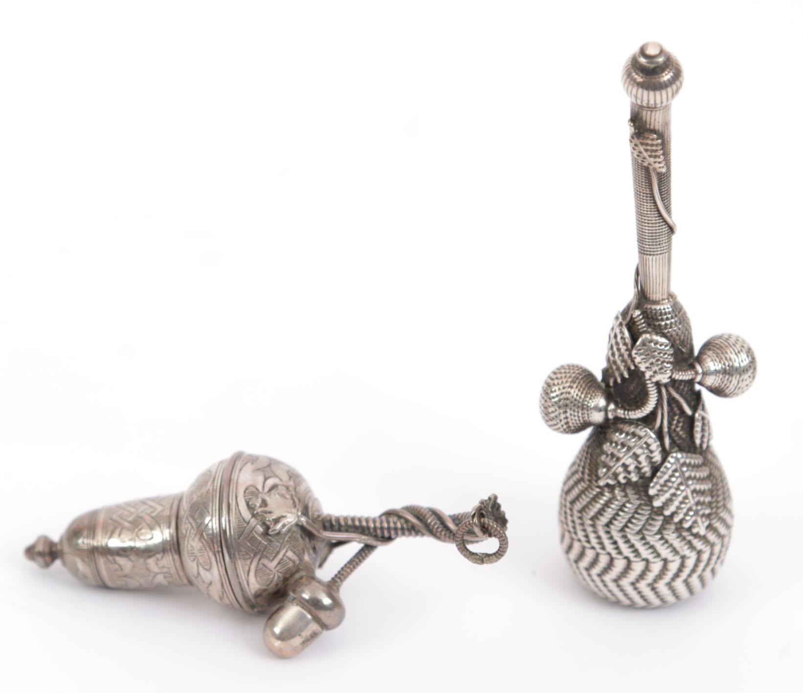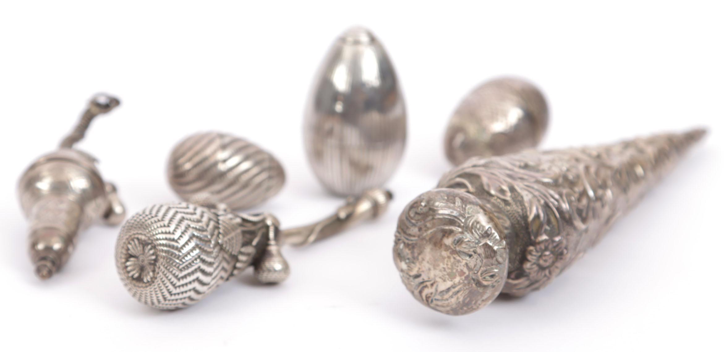 Verzameling van 6 zilveren parfumflessen en reukdoosjes waaronder 1 puntvormige zilveren fles Birmingham 1890, 3 zilveren reukdoosjes in ei-vorm, peervormige zilveren reukflacon met blader decoratie en 3 afschroefbare kleine peren, Duitsland rond 1720, 1 kleine peervormige reukflacon