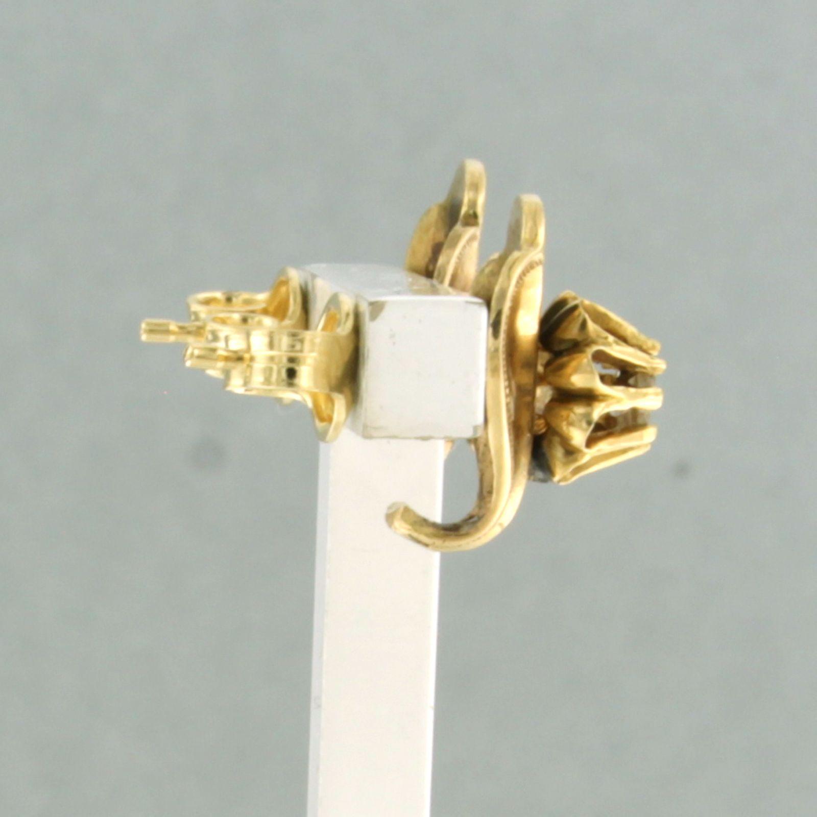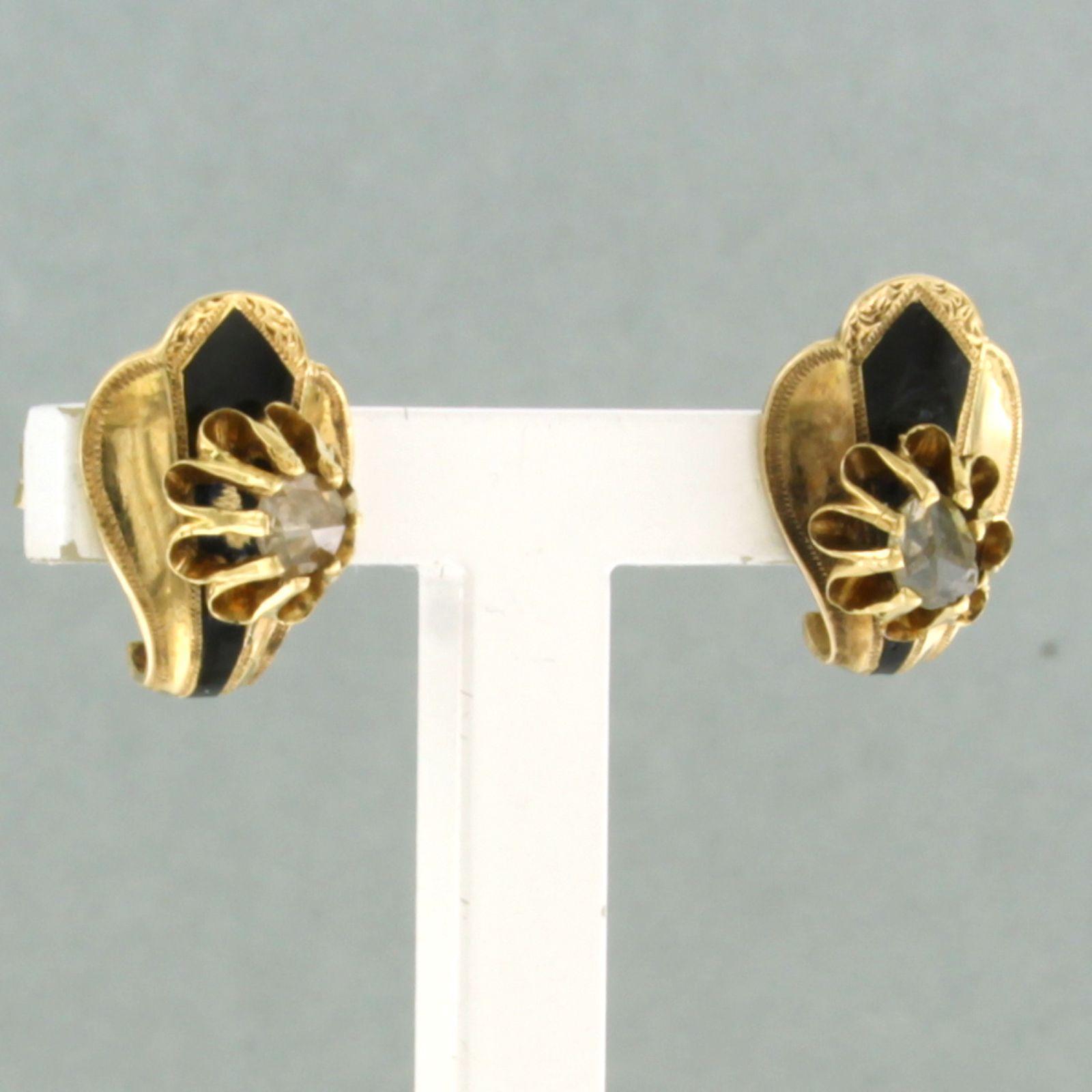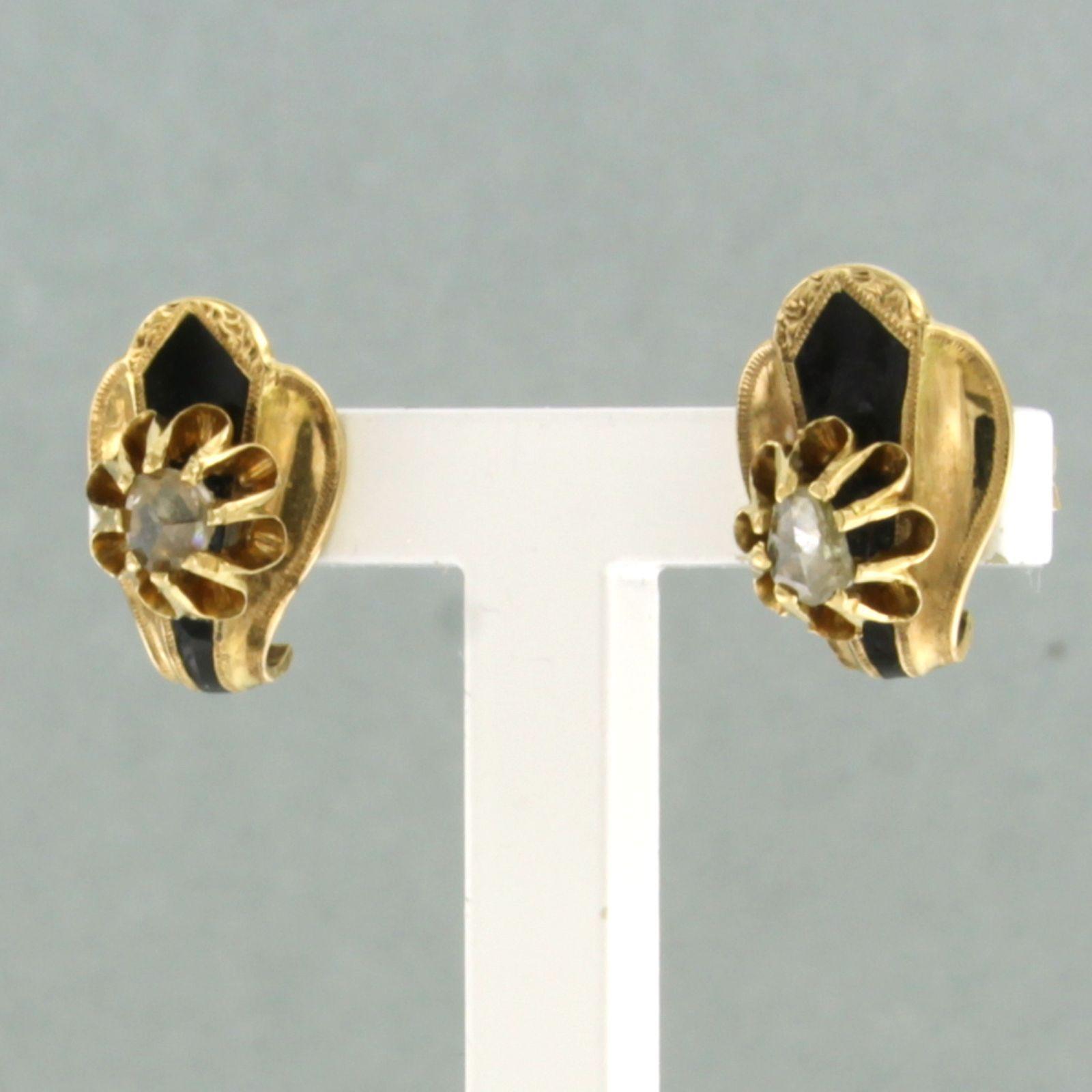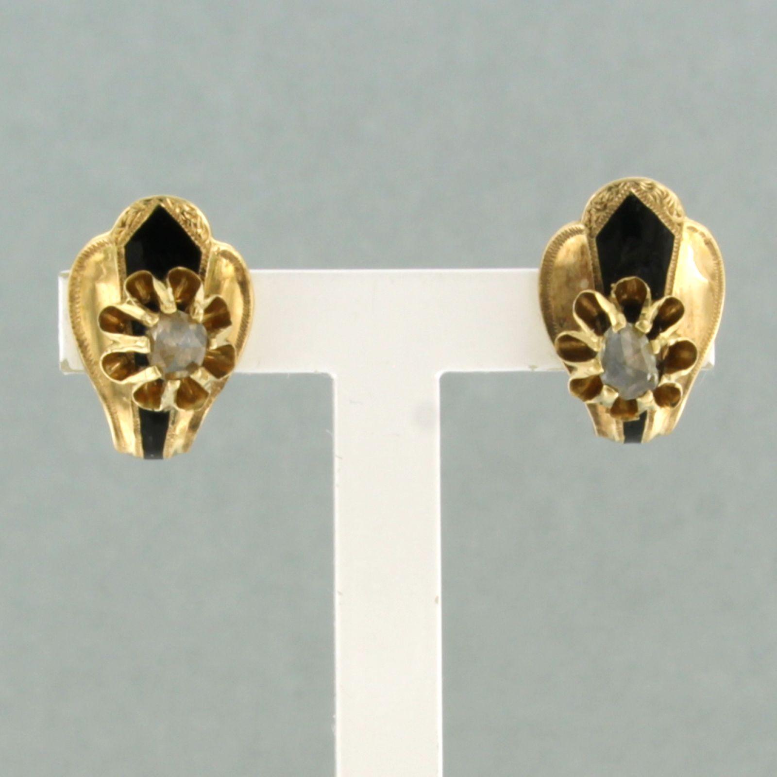 18 Kt. gouden oorknoppen versiert met emaille en bezet met roos geslepen diamant tot. circa 0,10ct