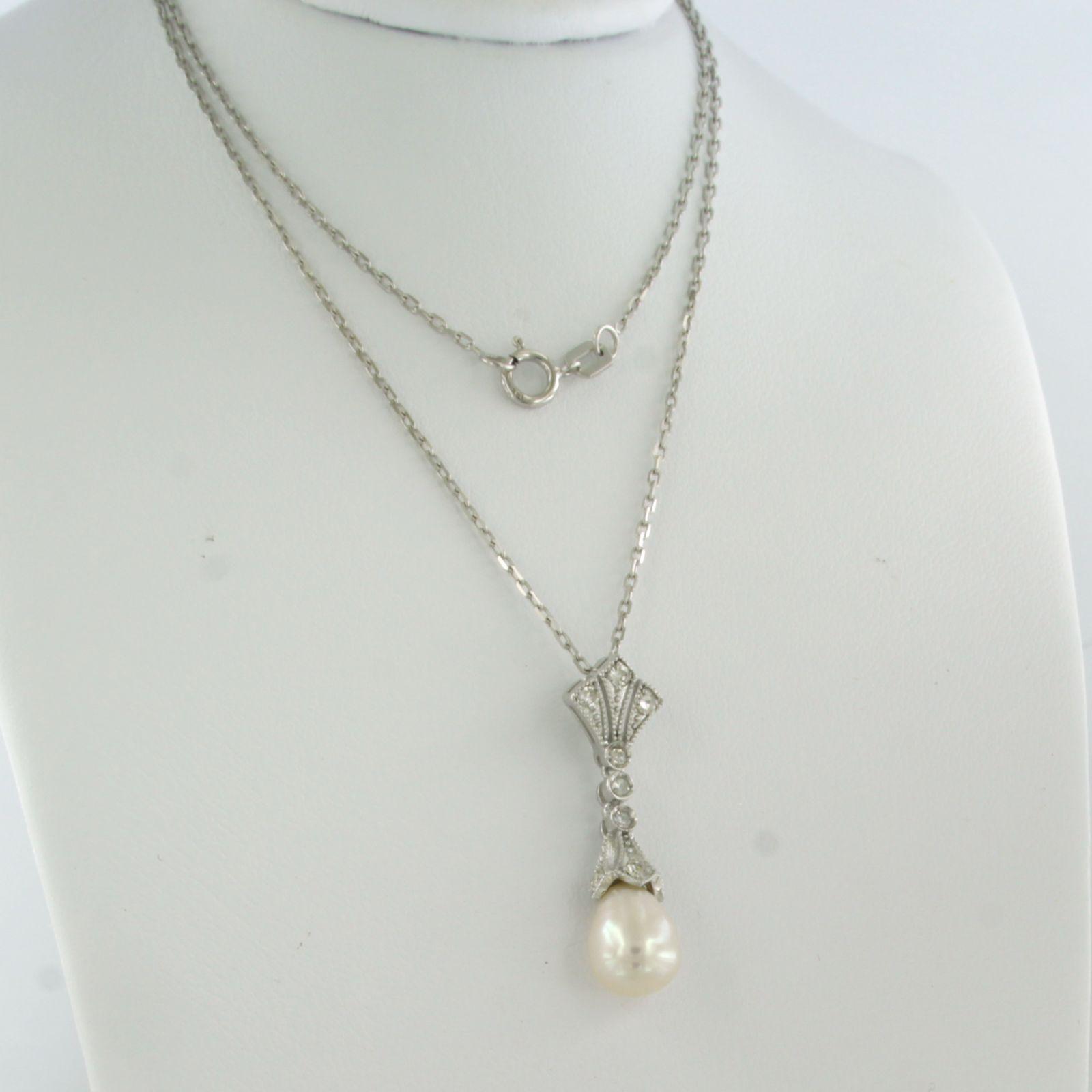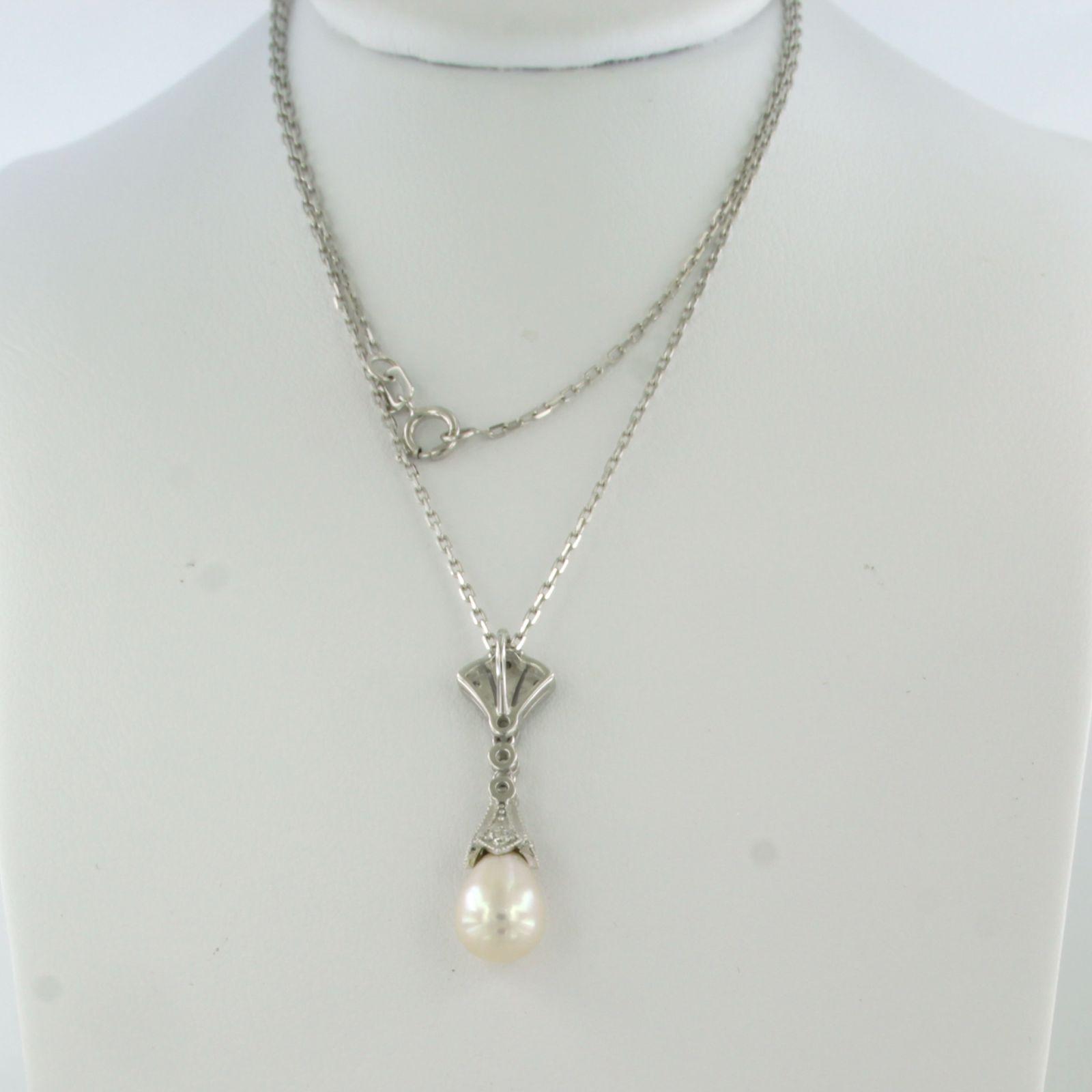 14 Kt. witgouden collier met hanger bezet met parel en single cut geslepen diamanten totaal 0.20 ct