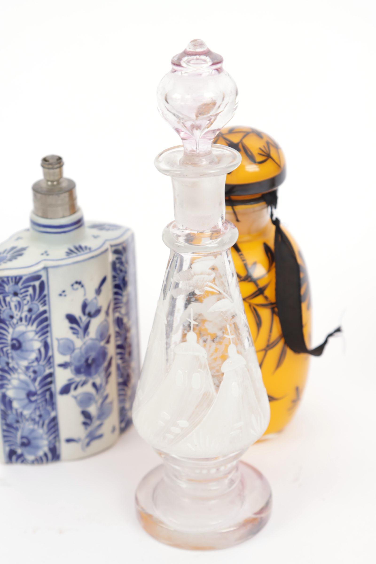 Verzameling van 6 parfumflessen, waaronder: 1 opaline flacon met polychroom beschildering, oa romeinse vrouw en profil, mid 19e eeuw, Frans, hoogte 15 cm, 1 boldootfles Mary Gregory, dop en voet roze getint, rond 1880, hoogte 19,8 cm, 1 gele glazen flacon met zwarte email beschildering, Frans, Babani?, rond 1920, hoogte 13,5 cm, 1 blauw-wit porseleinen boldootfles, hoogte 13,5 cm, 1 wit porseleinen flesje met opliggende bloemetjes en blaadjes, hoogte 10 cm, 1 glazen flesje met scharnierende dop en glazen binnenstop, hoogte 10,5 cm