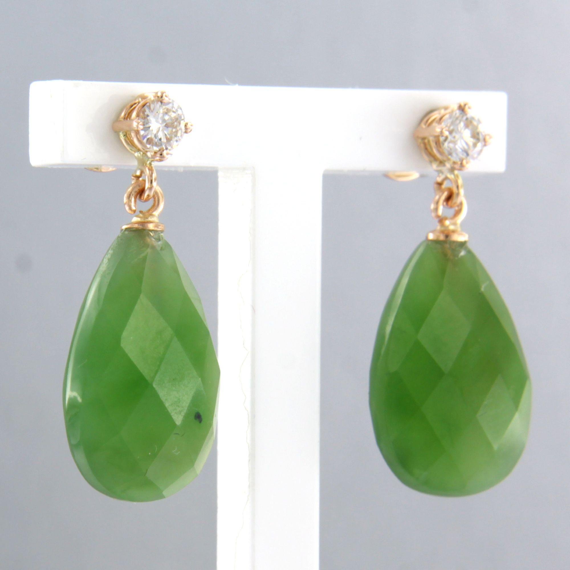 18 Kt. roodgouden oorhangers bezet met jade en briljant geslepen diamanten totaal 0.22 ct