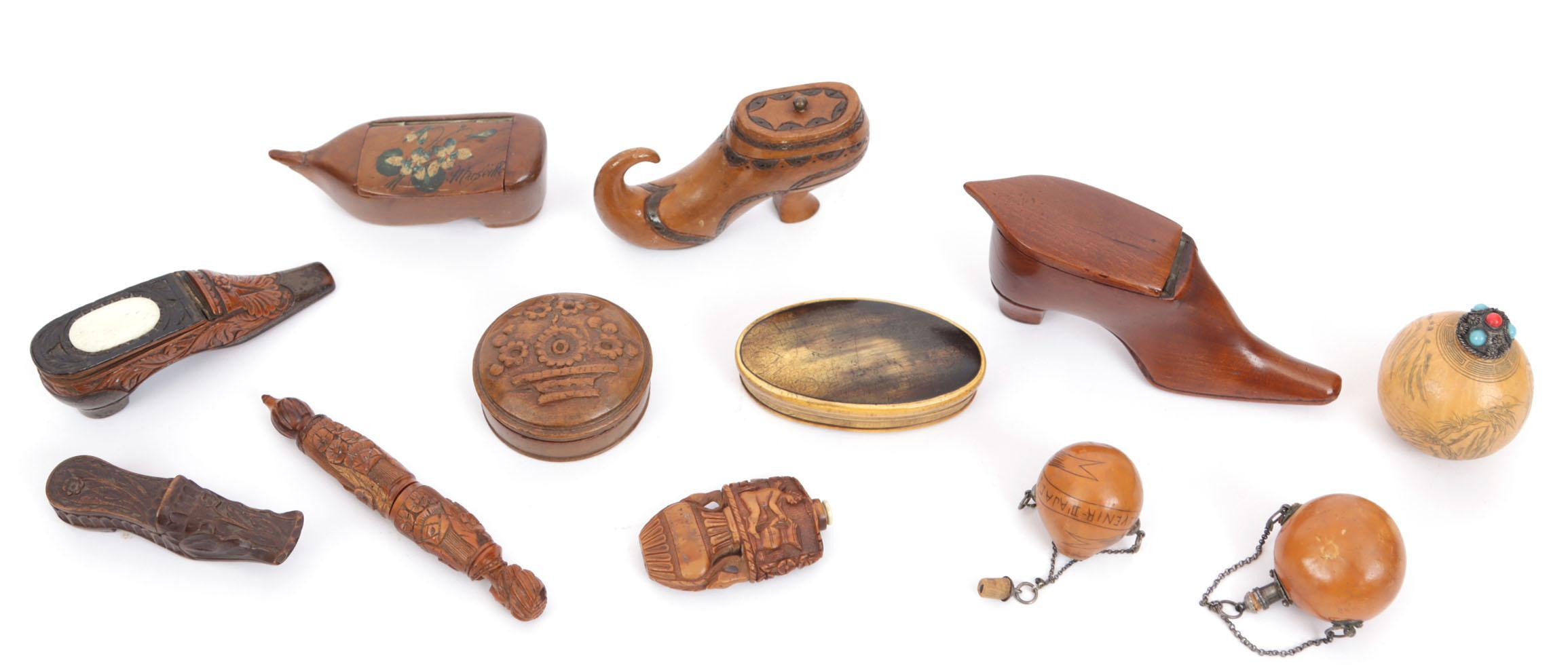 Verzameling van 12 houten en noten items, waaronder 5 snuifdoosjes in de vorm van houten schoentjes, rond 1800, 3 noten flesjes met decoratie, rond 1820, 1 rond houten doosje met bloemmotief op deksel, doorsnede 5,5 cm, 1 ovaal benen doosje, 8x4,4 cm, 1 fraai handgesneden kokertje met schroefsluiting, hoofde op de kop, lengte 12 cm, 1 houten flesje, handgesneden, vaasvormig met engelen decoratie aan beide zijden, benen stopje, hoogte 5,6 cm .