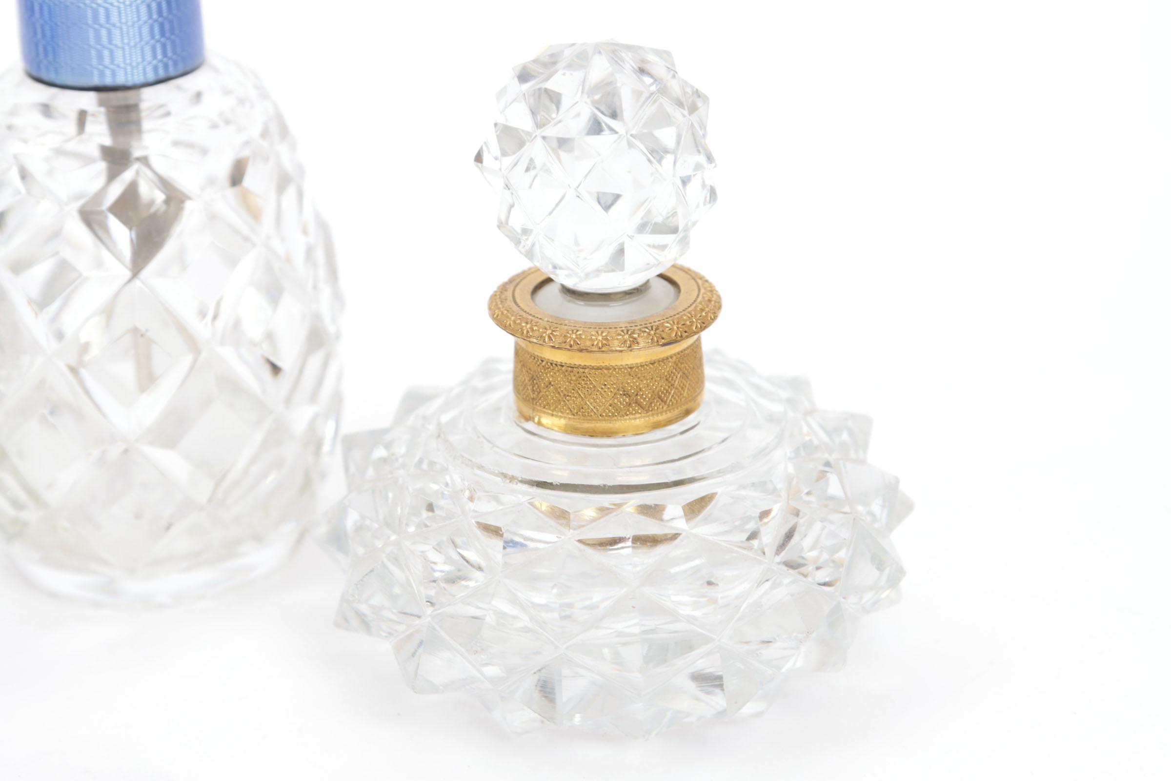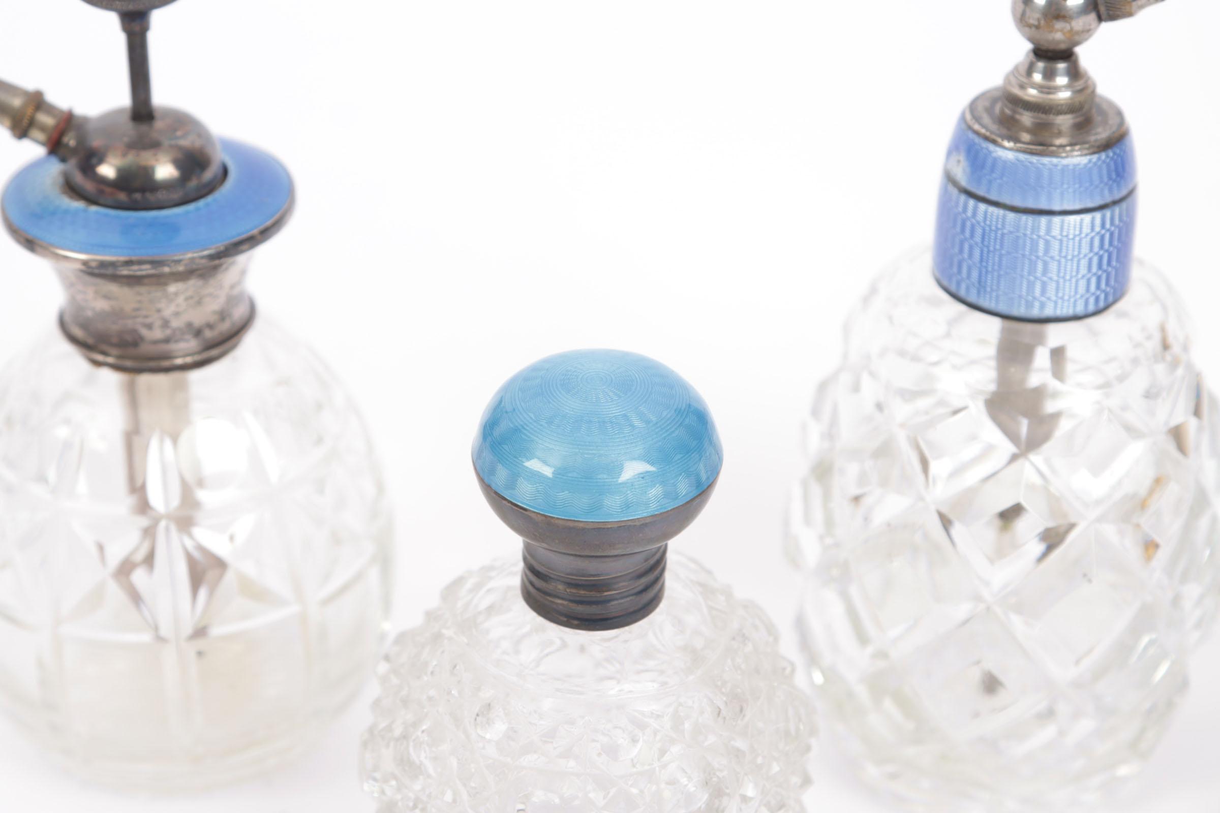 4 toilettafel parfumflessen, waaronder: 1 crystallen vaporisateur met zilveren dop, blauw emaille guilloché bovenkanr, pomp en mechanisme 'sterling silver' gemerkt, Engels begin 20e eeuw, hoogte 12,5 cm, 1 crystallen bolvormige fles, diamantslijpsel, zilveren schroefdop, met guilloche blauw emaille bovenkant, dop gemerkt met S = Zweden en 3 kroontjes, glazen binnendop, rond 1920, hoogte 9 cm, 1 barokke tafelflacon, goudkleurig montuur w.i. dop die op dezelfde manier geslepen is, Frans, 19e eeuw, hoogte 10 cm, 1 crystallen flacon met lichtblauw geëmailleerde bovenkant, hoogte13 cm