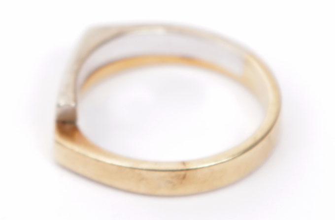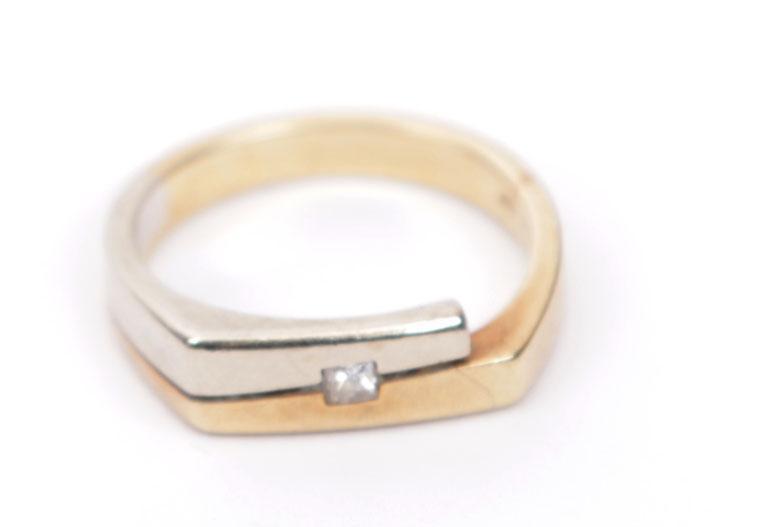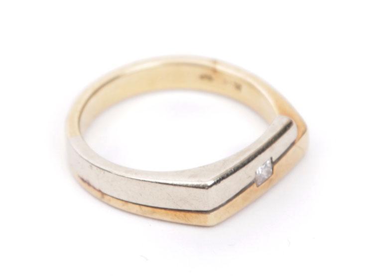 14 Kt. wit met geelgouden ring bezet met briljant, diam.17 mm., 4.6 gram