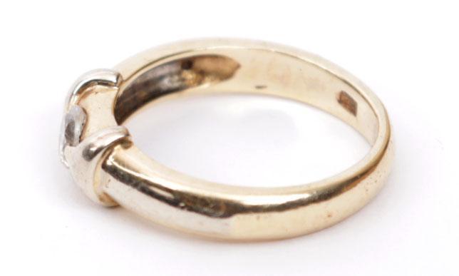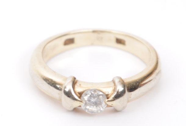14 Kt. gouden damesring bezet met briljant, 16 mm., 3.5 gram
