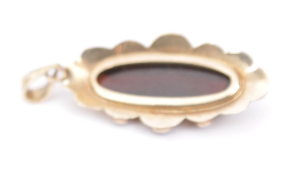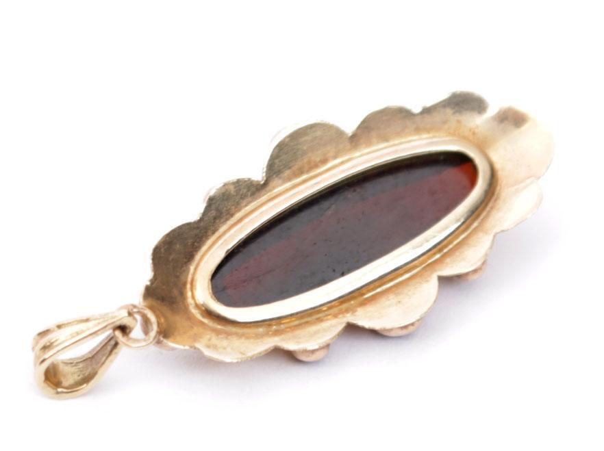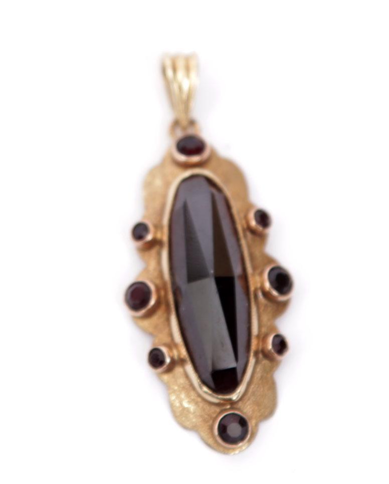 14 Kt. gouden hanger bezet met granaat L.3.8 cm., 3.6 gram