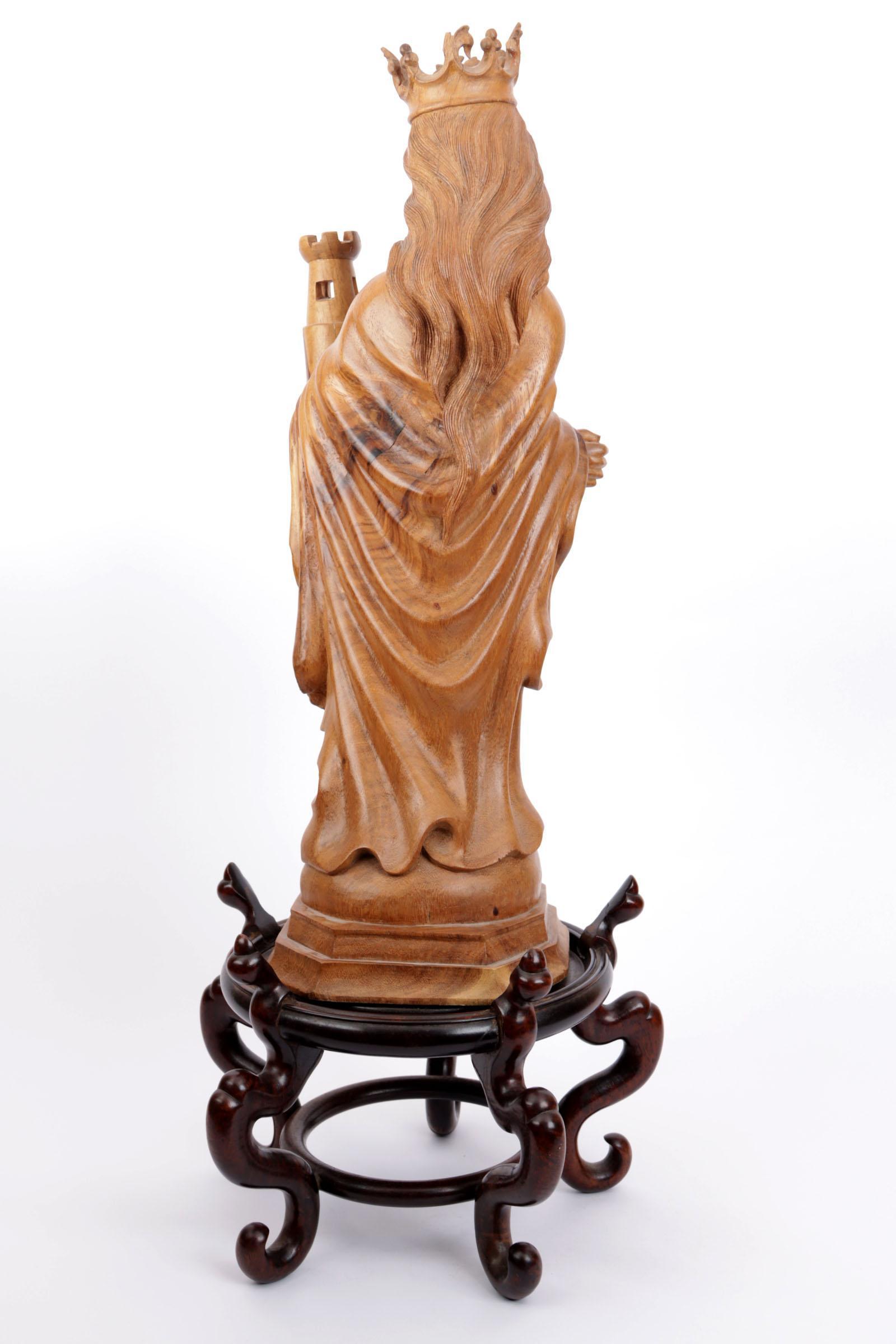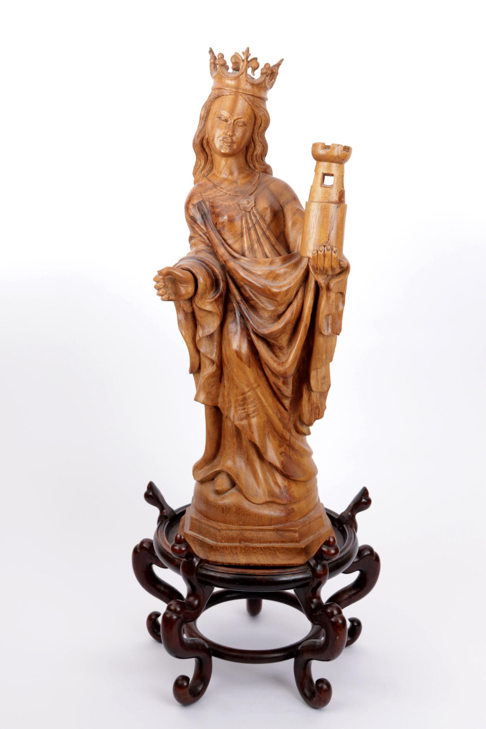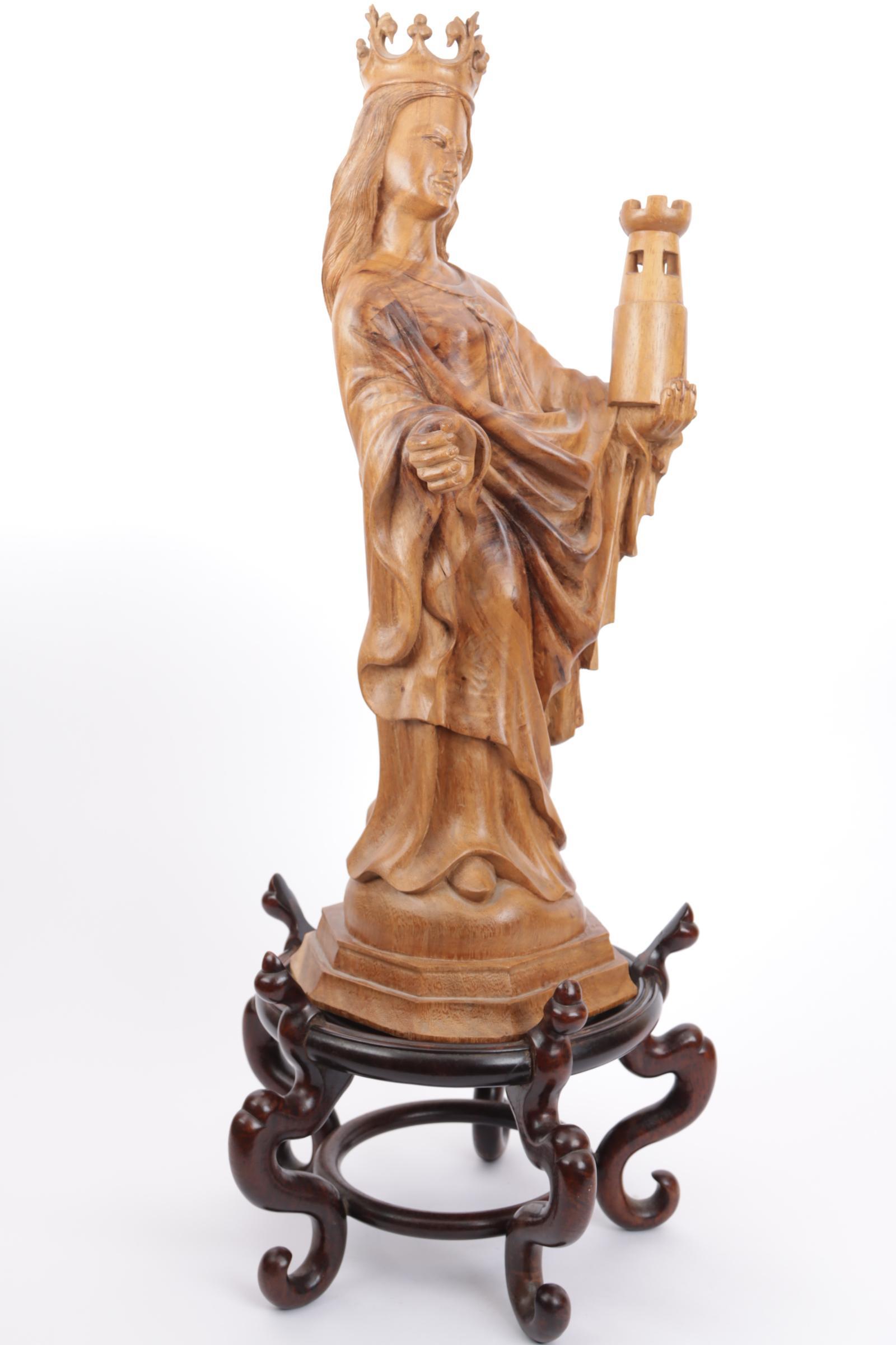 Houten beeld van een heilige, en een Chinees houten sokkel, h.77 cm.
