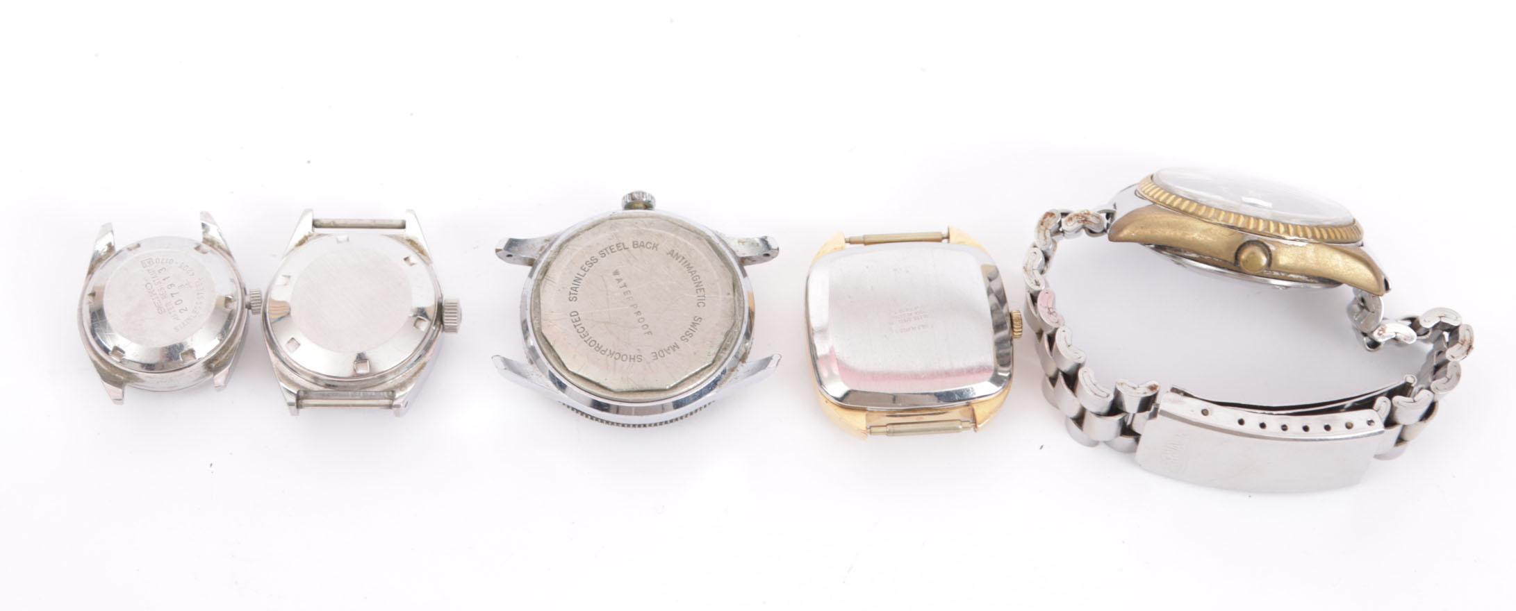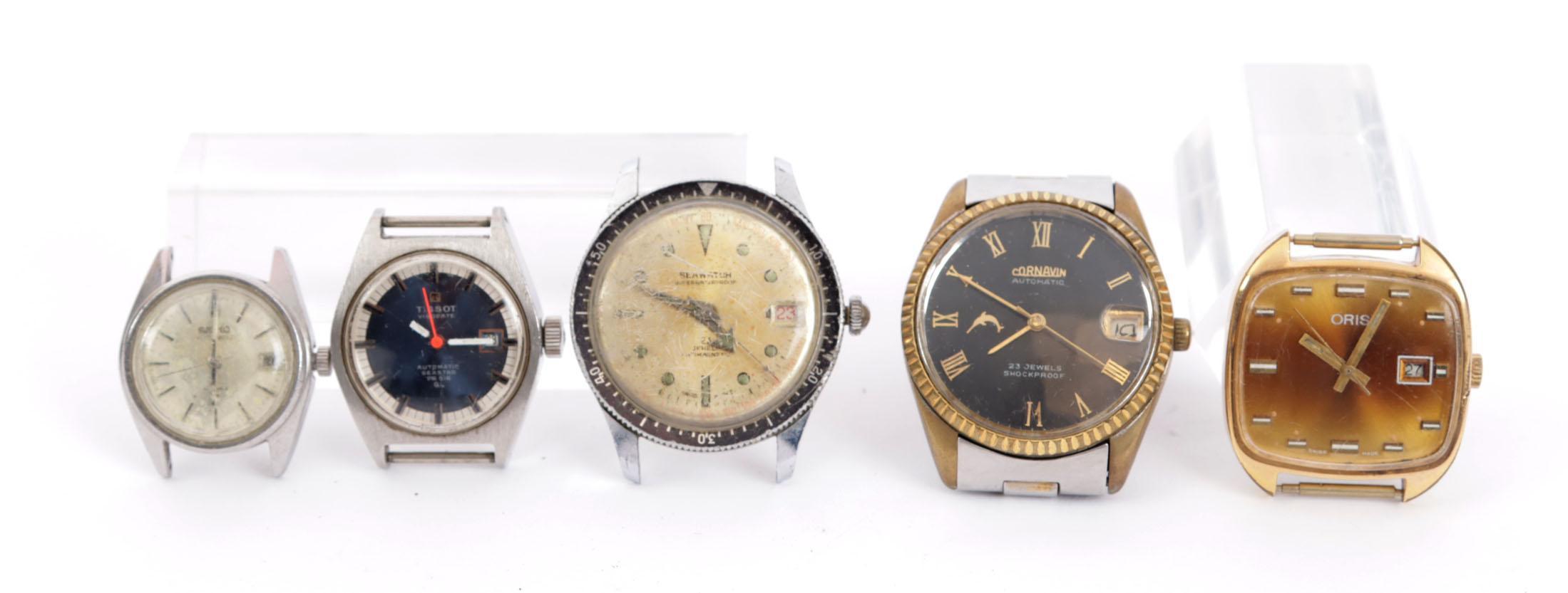 Koop met vier diverse vintage polshorloge kasten, en 1 polshorloge, W.o. Seawatch 23 jewels diver, Tissot viso date seastar pr 516, Oris, Cornavin 23 jewels en een Seiko automatic dames kast.