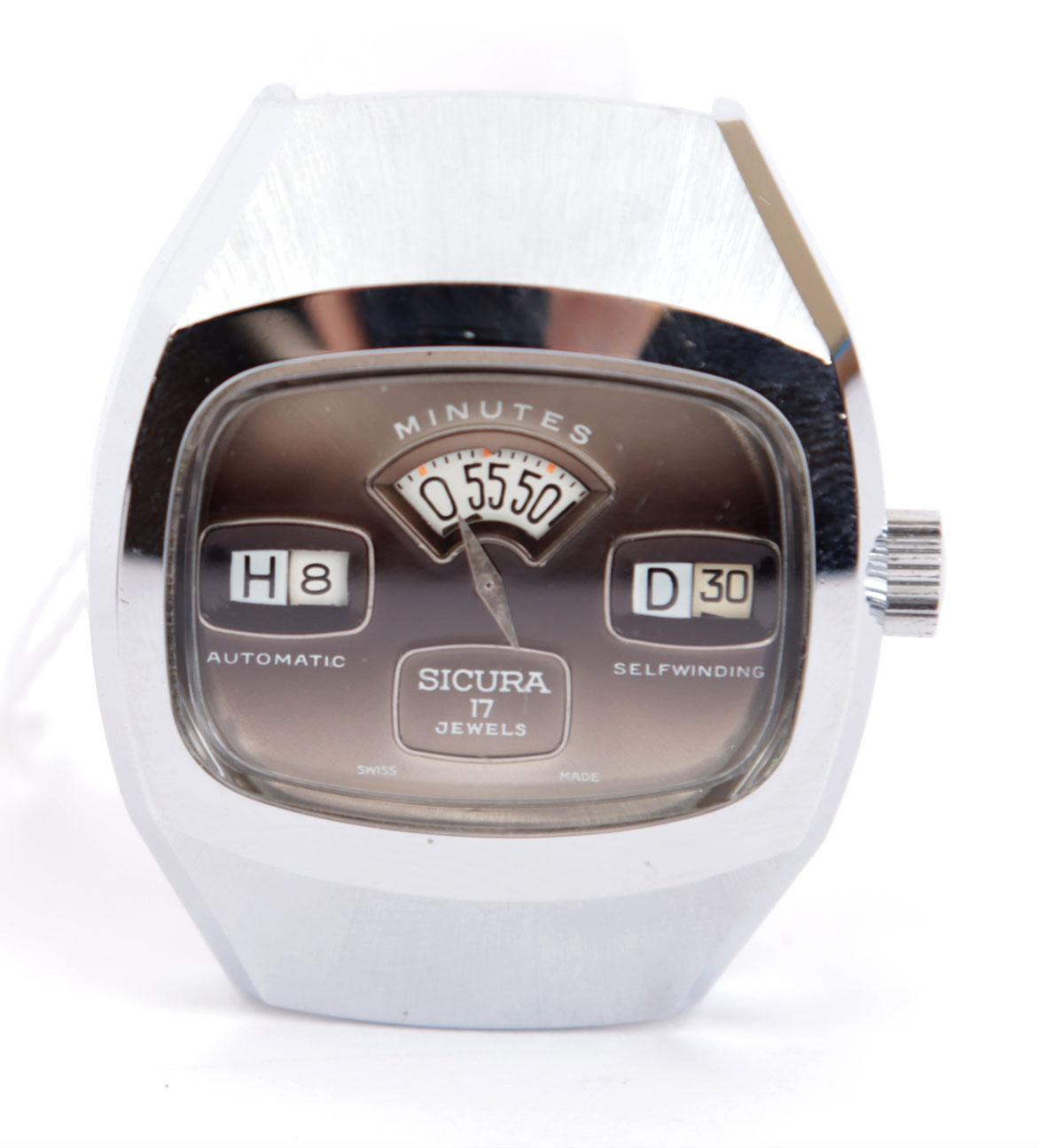 Vintage Sicura Zwitsers herenpolshorloge ''jump hour'', 17 jewels, automatic, jaren 70