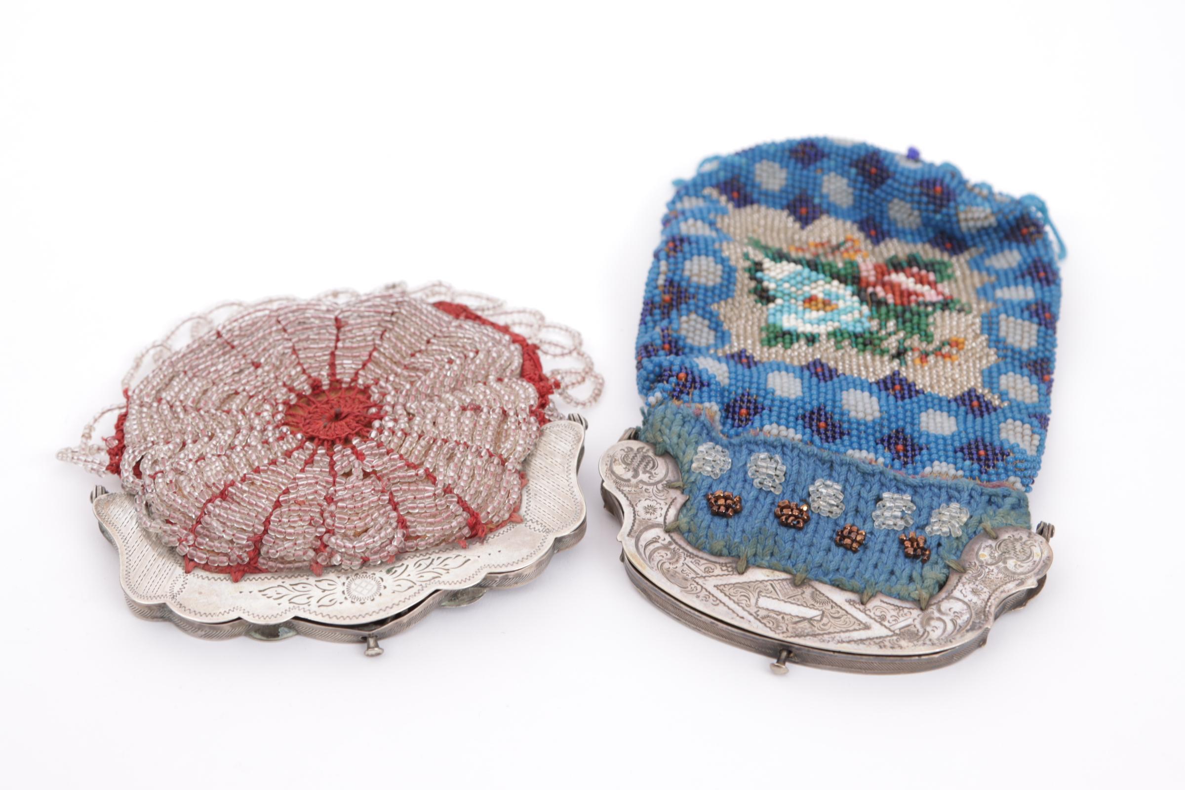 2 Antieke kralentasjes met zilveren beugel, zilvergewicht ca.70 gram