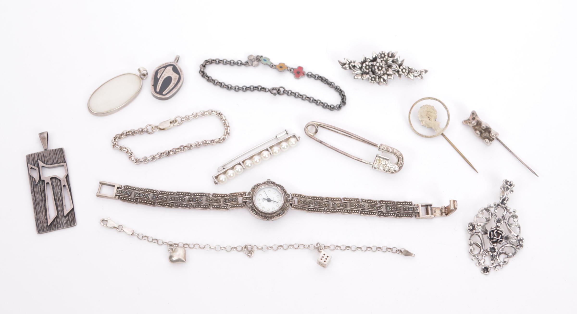 Koopje diverse zilveren sieraden w.o. armband, hangers en horloge, ca.95 gram