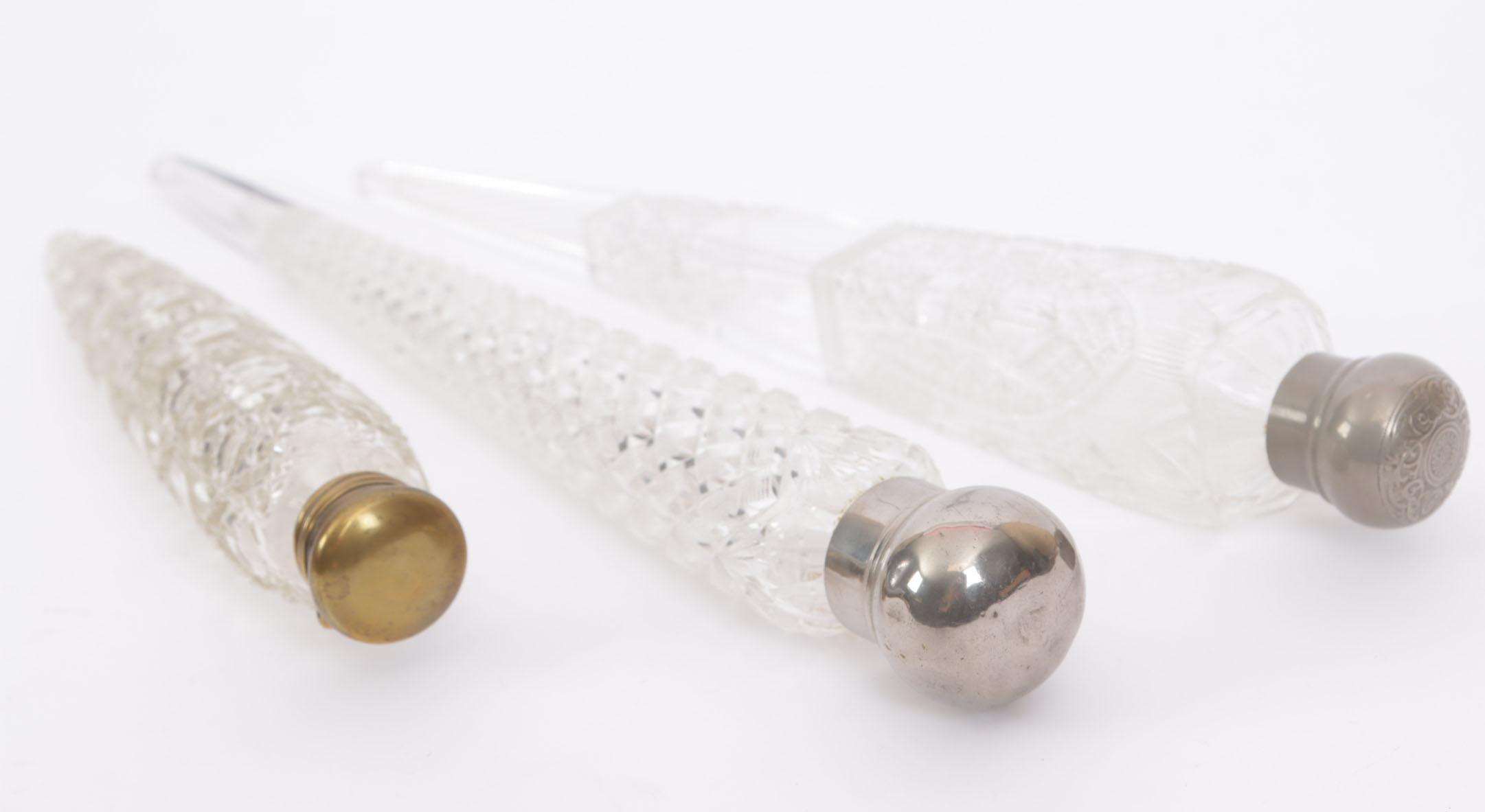 3 Kristallen toilettafel puntflacons, waaronder: 1 fles met metalen schroef dop, diamant geslepen, waaronder dop op kurk, lengte 33,7 cm, 1 fles decoratief geslepen, metalen gedecoreerde schroefdop, waaronder dop op kurk, lengte 31,7 cm, 1 fles ruitpatroon met koperkleurige metalen scharnierende dop, lengte 21,5 cm