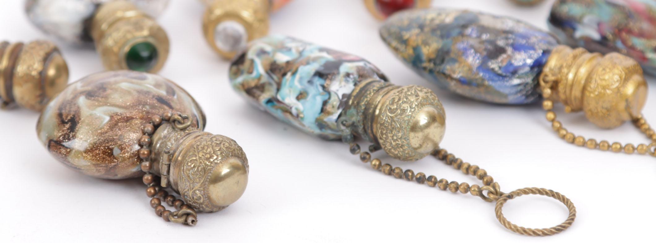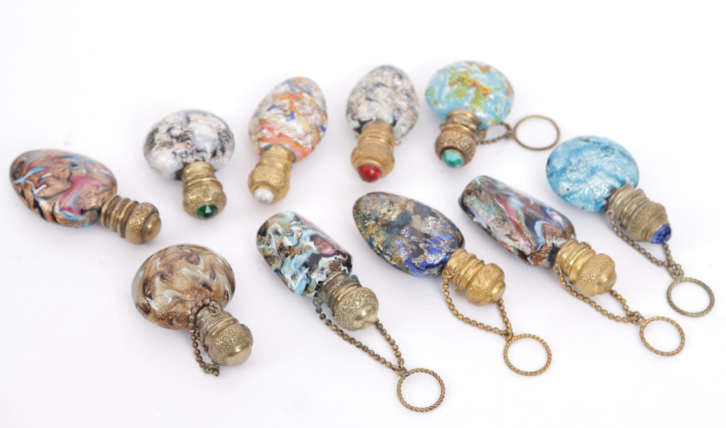 10 Venetiaanse millefiori glazen parfumflesjes, waarvan 6 aan bolletjesketting en pinkring, scharnierende koperen doppen, 19e eeuws, hoogte 6,5-7,5 cm