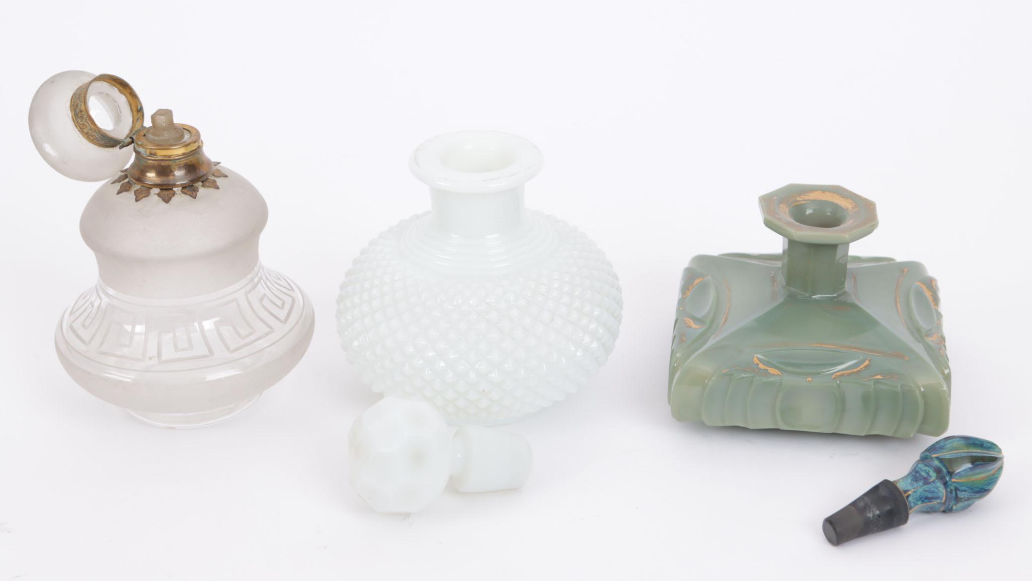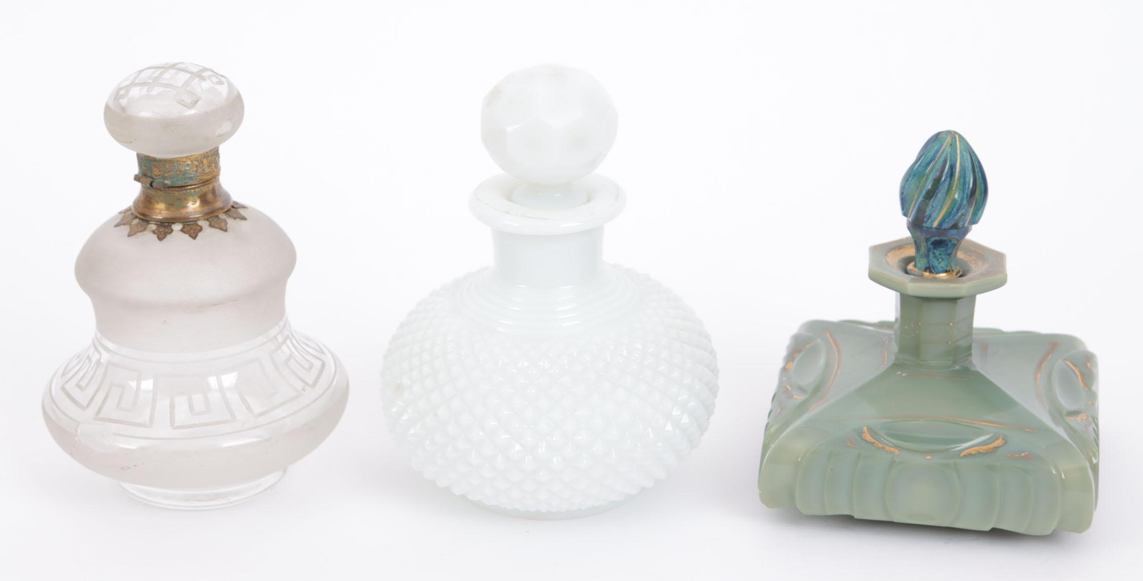 3 Toilettafel flacons, waaronder: 1 vierkante groene opaline flacon, kussenmodel, met goudbeschildering en blauwe puntige dop, Frans, rond 1840, hoogte 10 cm, 1 flacon met metalen koperkleurig scharnierend montuur, mat glas met rondom en op deksel doorzichtige gedeelten waarin Griekse meander randen, Frans, 19e eeuw, hoogte 12 cm, 1 ronde, witte opaline toilettafelfles, hoogte 12,5 cm
