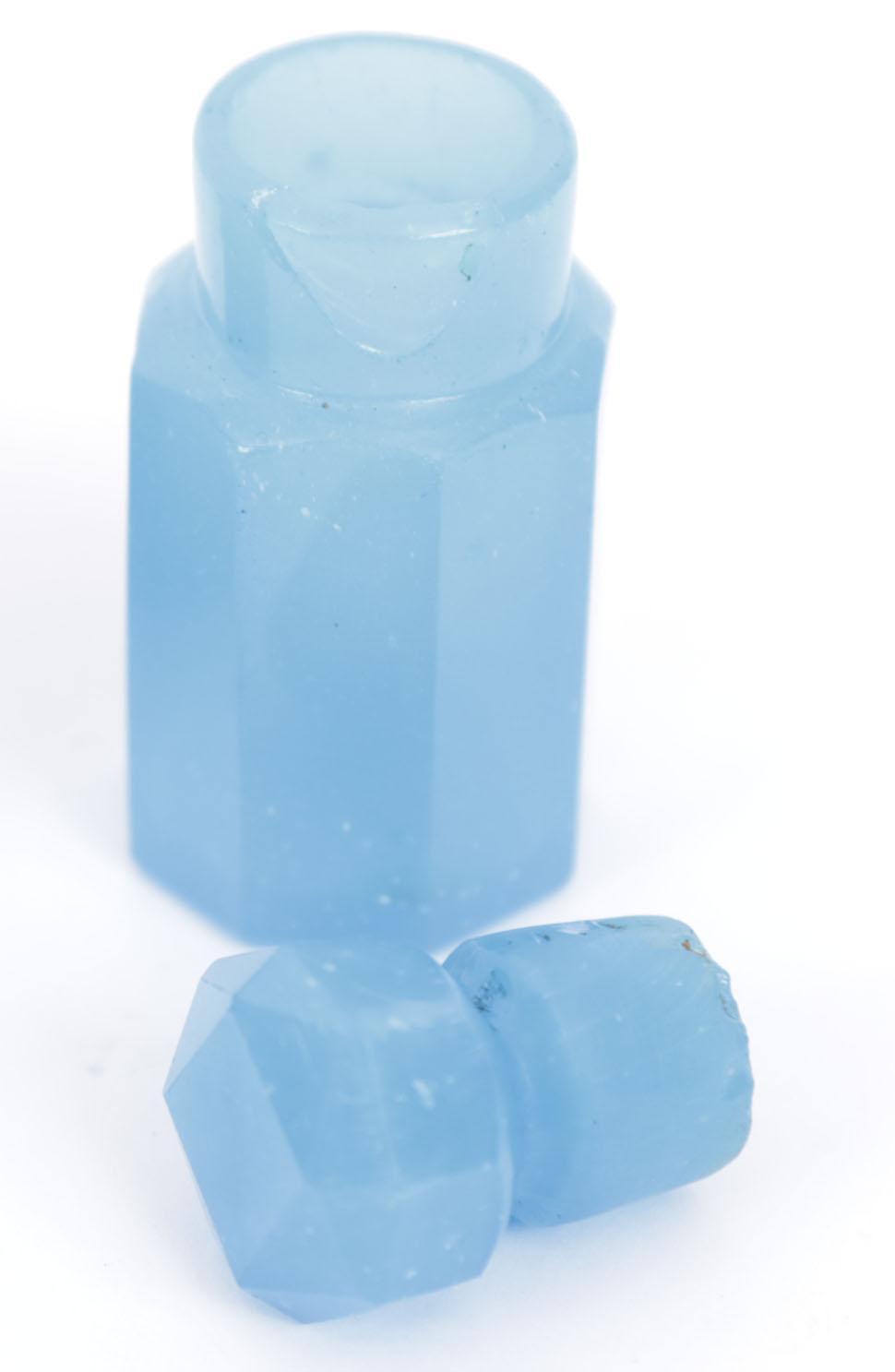 5 Parfumflesjes, waaronder: 1 roze porseleinen flesje met gouden geëmailleerde versiering en koperen scharnierende dop, hoogte 5,5 cm, 1 turquoise porseleinen flesje met goud emaille versiering en gouden stop, hoogte 7 cm, 3 blauwe opaline glazen flesje, waarvan 2 in ei vorm, waarvan 1 met zilveren scharnierende dop en glazen binnen stop, hoogte 7-7,5 cm
