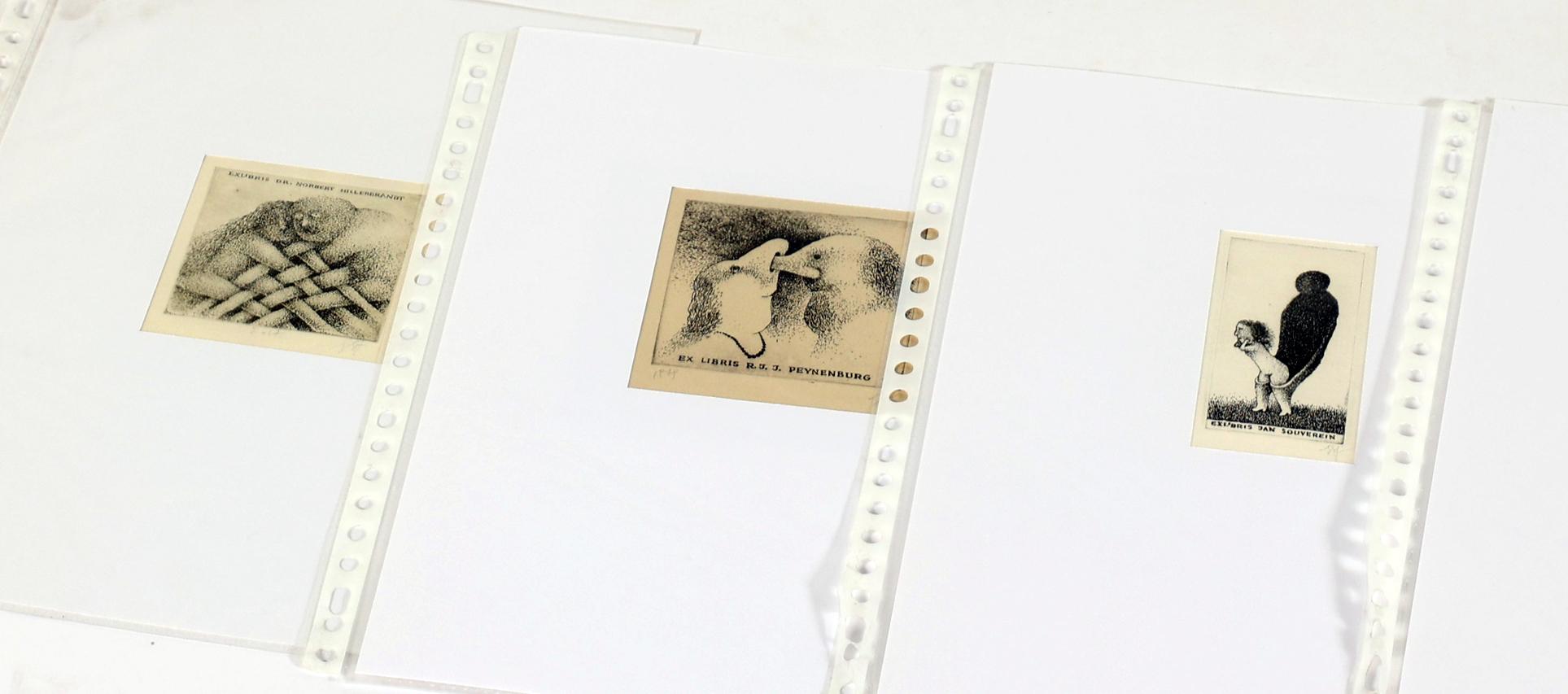 Eidrigevicius, St., 13 exlibris, C3, alle gesigneerd / gemonogrammeerd. In Passe-partouts. Voor o.a. Hillerbrandt, Peynenburg, Souverein, Van der Zee, Abanakanowicz