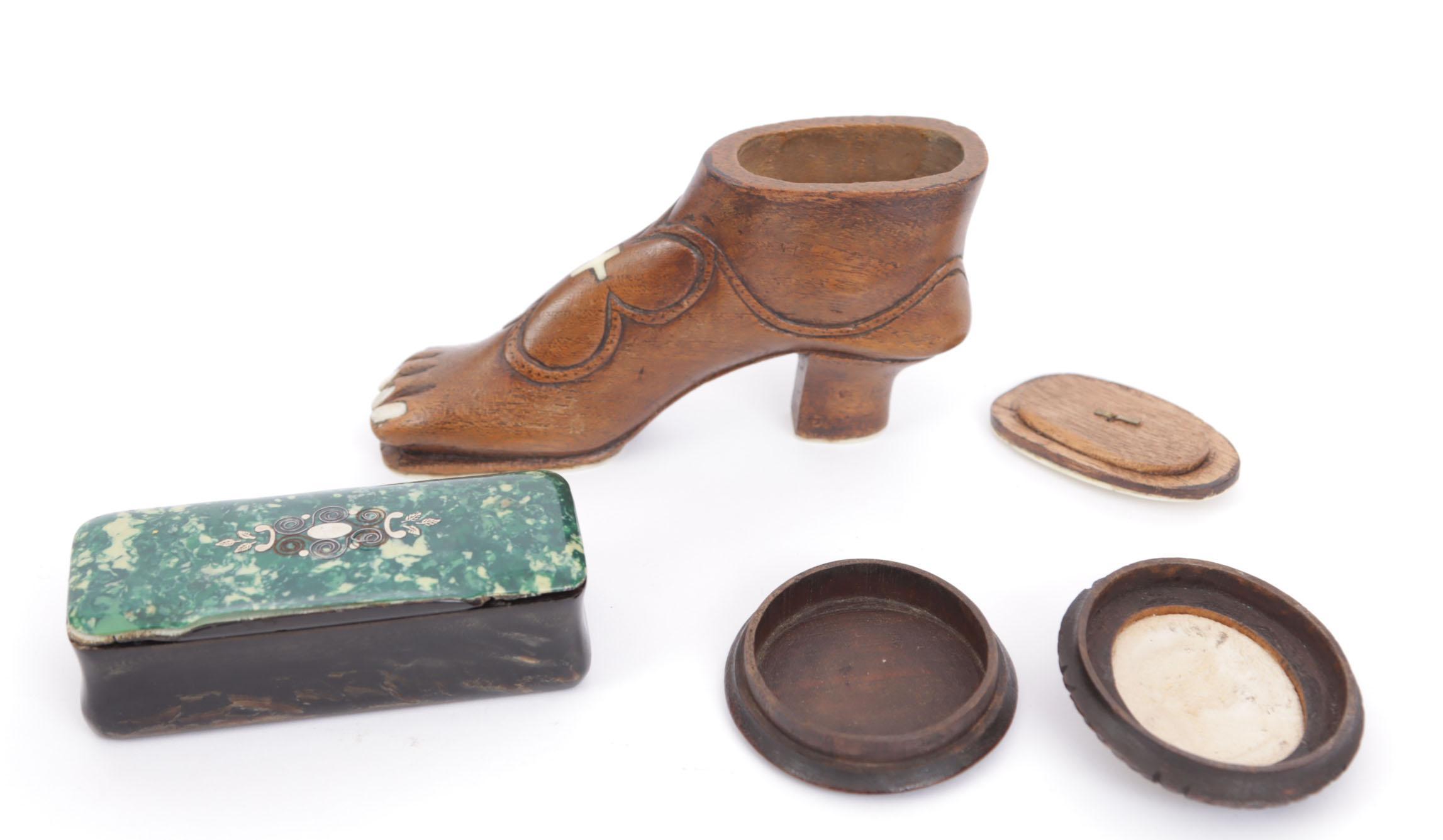 Verzameling van 3 doosjes, waaronder: een houten snuifdoos in de vorm van een voet op sandaal met deksel, zool en tenen van been, deksel met ringetje, 19e eeuws, lengte 12 cm, hoogte 6,8 cm, 1 langwerpig papiermaché snuifdoos met gevlekt groen lakdeksel, waarin een zilveren decoratie, eind 19e eeuw, 2,7x9,5x4,3 cm, 1 ovaal plat bewerkt houten snuifdoosje met wit meisjesprofiel op deksel (à la camee), lengte 6,4 cm