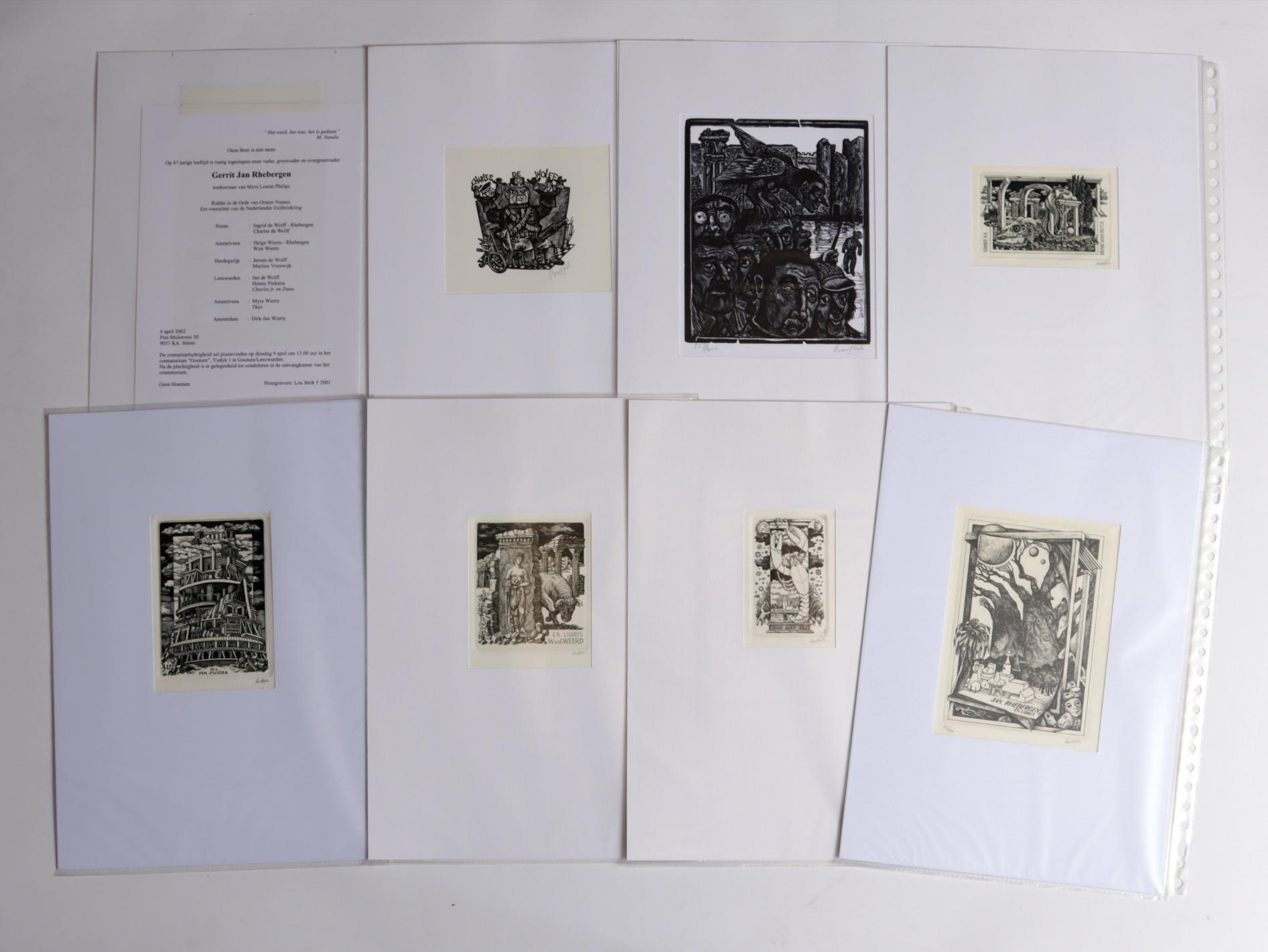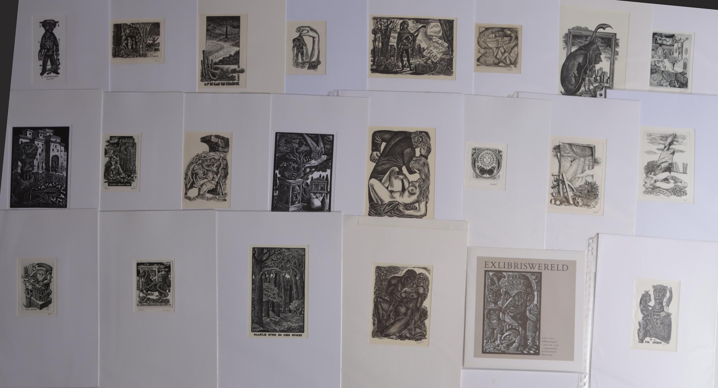 Strik, L., plm. 40 exlibris / kleingrafiek, C2/X2 (21 x C2), grotendeels gesigneerd. In passe-partouts. Voor o.a. De Bruyn, Meulemans, Willemse, Zwiers, Hausweiler, Quapp, Wiese, Rhebergen, Veldhuizen, Wetselaar, De Haas, Burch.