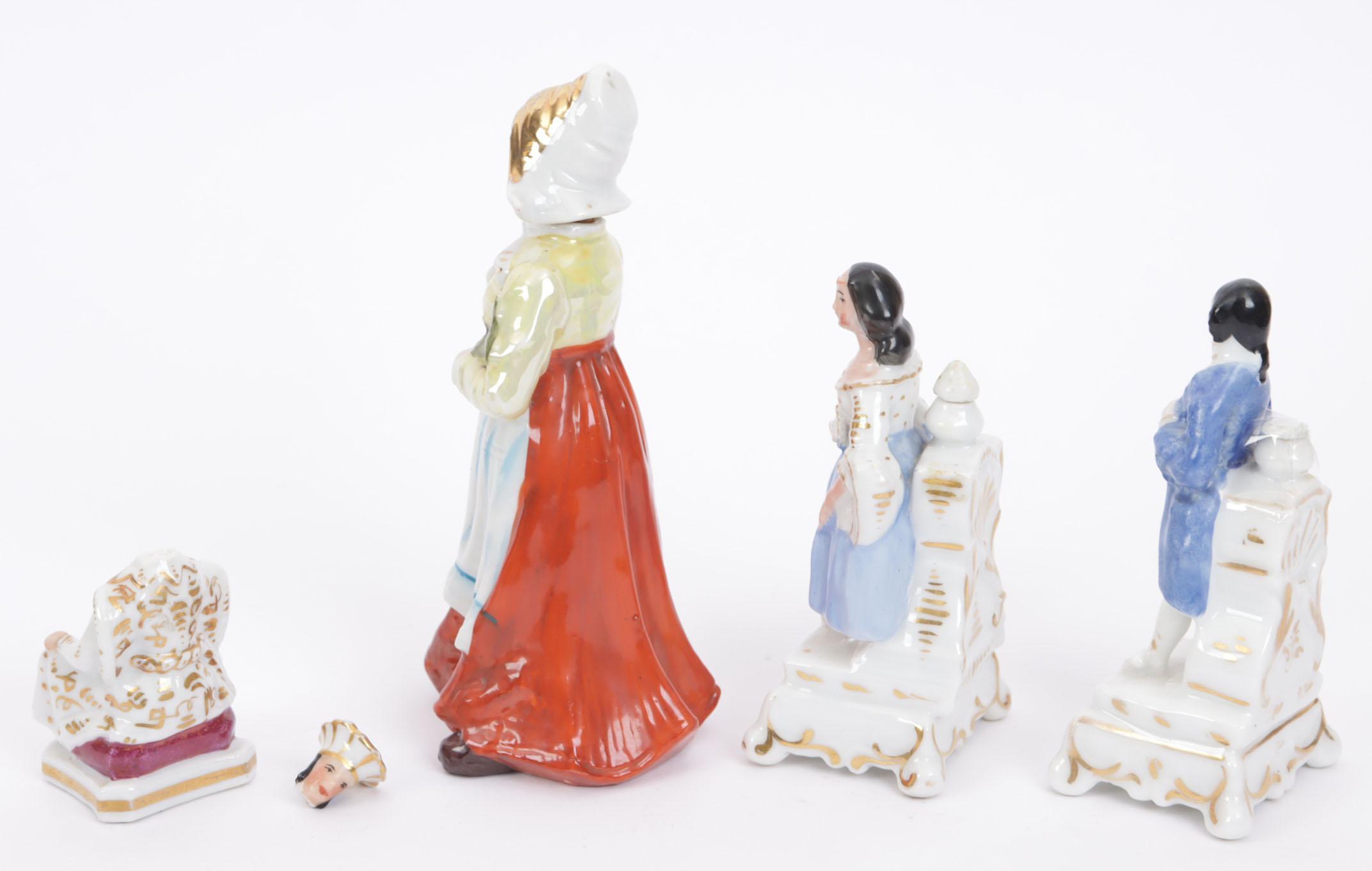 4 parfumflessen, waaronder: 1 zittende koning, goudbeschildering, kopje afgebroken, hoogte: 8cm, 1 paar porseleinen man en vrouw in 18e eeuwse kleding op sokkels, stopje achter hoofd, handbeschilderd met blauwe en gouden accenten, sokkels versierd met rococo krullen, hoogte 12 cm, 1 vrouwenbeeldje met vis, hoofd is stop, porselein, handbeschilderd, goudaccenten, Nederlands of Duits, hoogte 17,5 cm