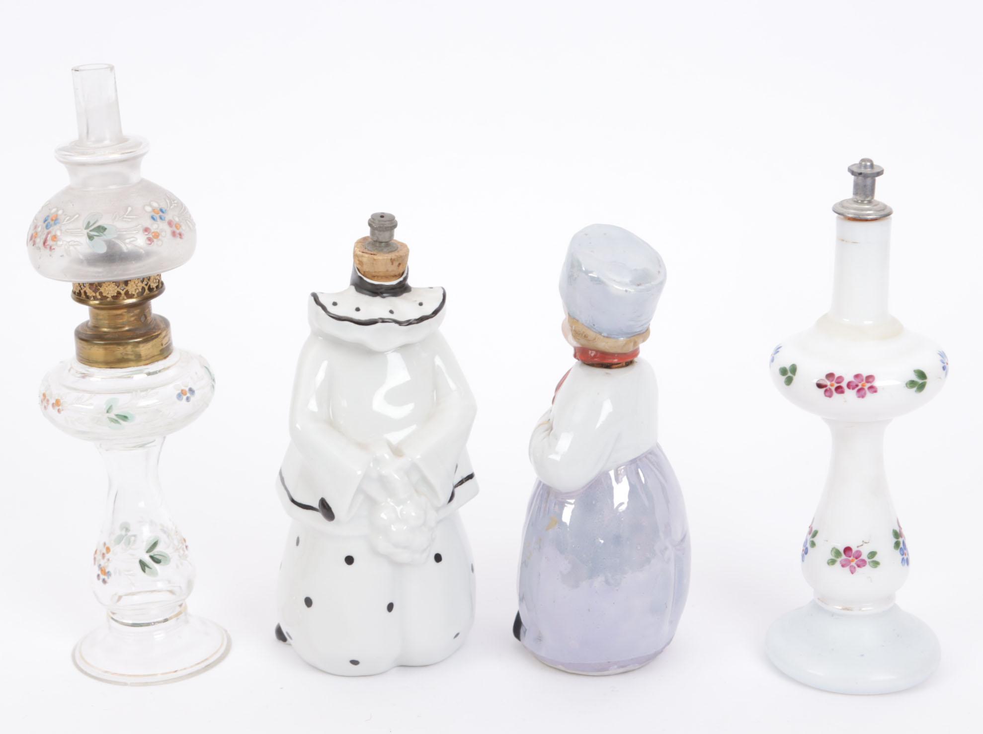4 parfumflesjes, waaronder: 1 boldootglazen flacon, model antieke olielamp, glas met email bloembeschildering, sprinklerdop gemerkt "Boldoot Amsterdam", opzetglas als kopie van olielamp, begin 20e eeuw, hoogte 20 cm, 1 witte melkglazen fles in vorm olielamp, emaille beschildering, hoogte 16 cm, 1 klein mannetje, waarschijnlijk jeneverflesje, hoofdje is de dop, hoogte 14 cm, 1 porseleinen figuurtje, voorstellend een clown in wit pierrot kostuum, kurken dopje, jaren 1930, Frans, hoogte 15 cm