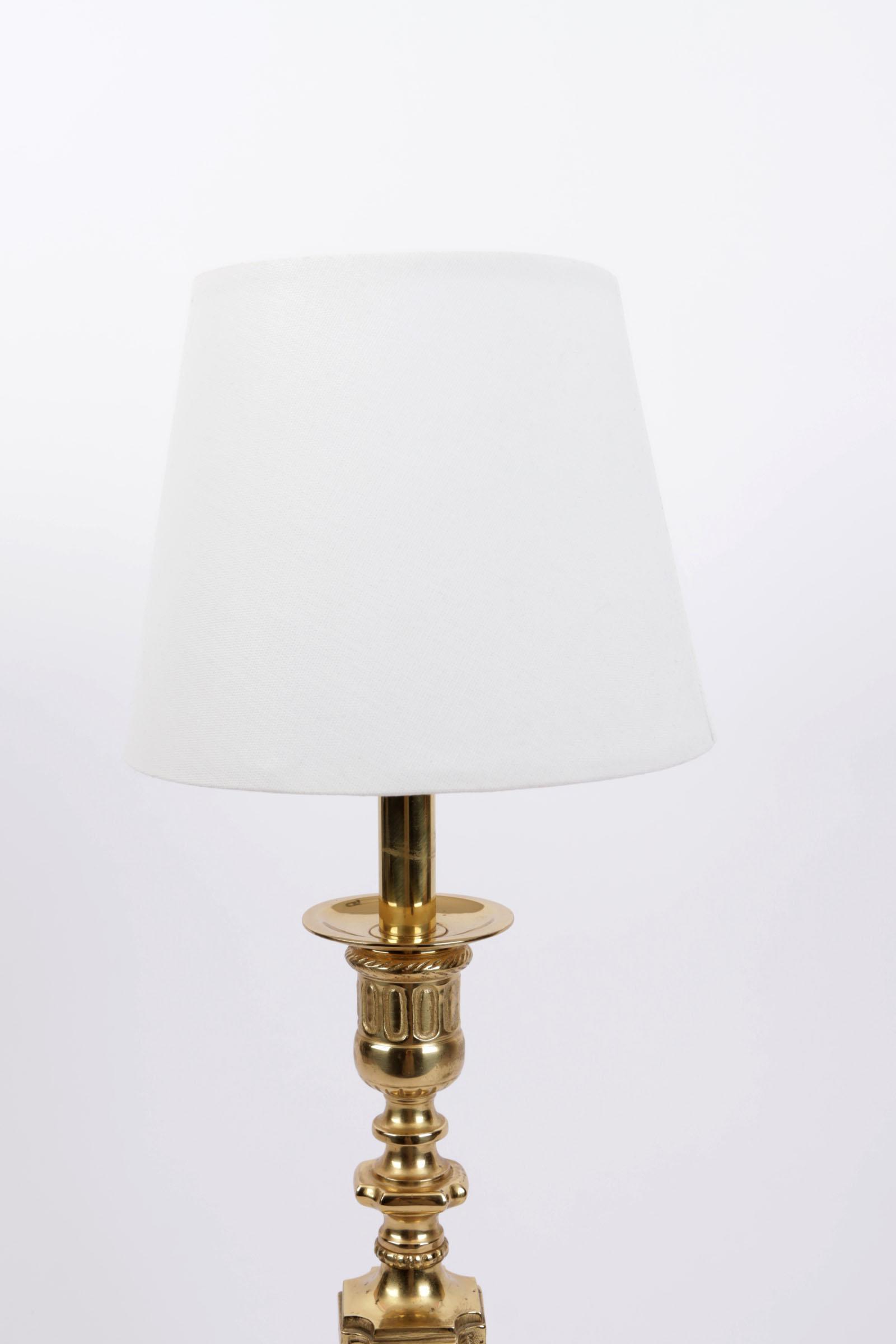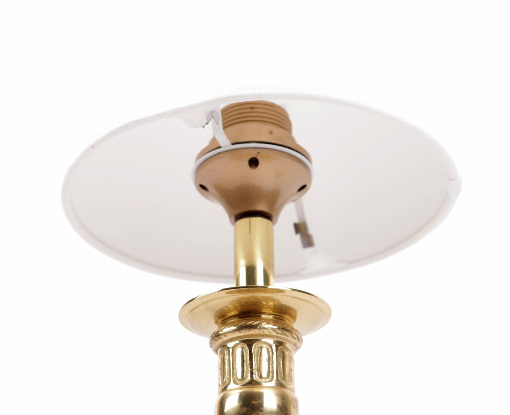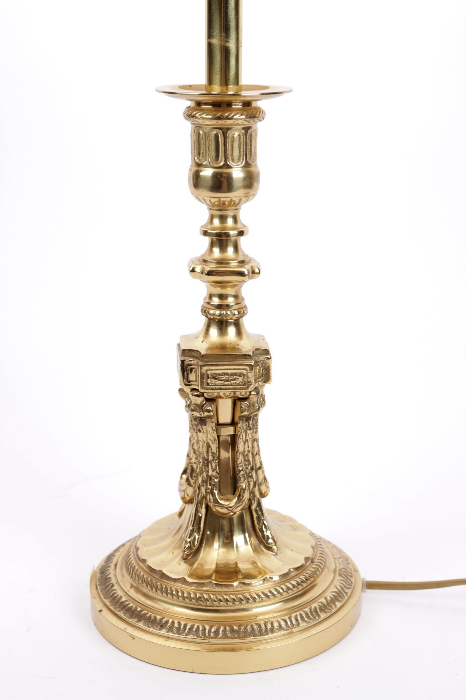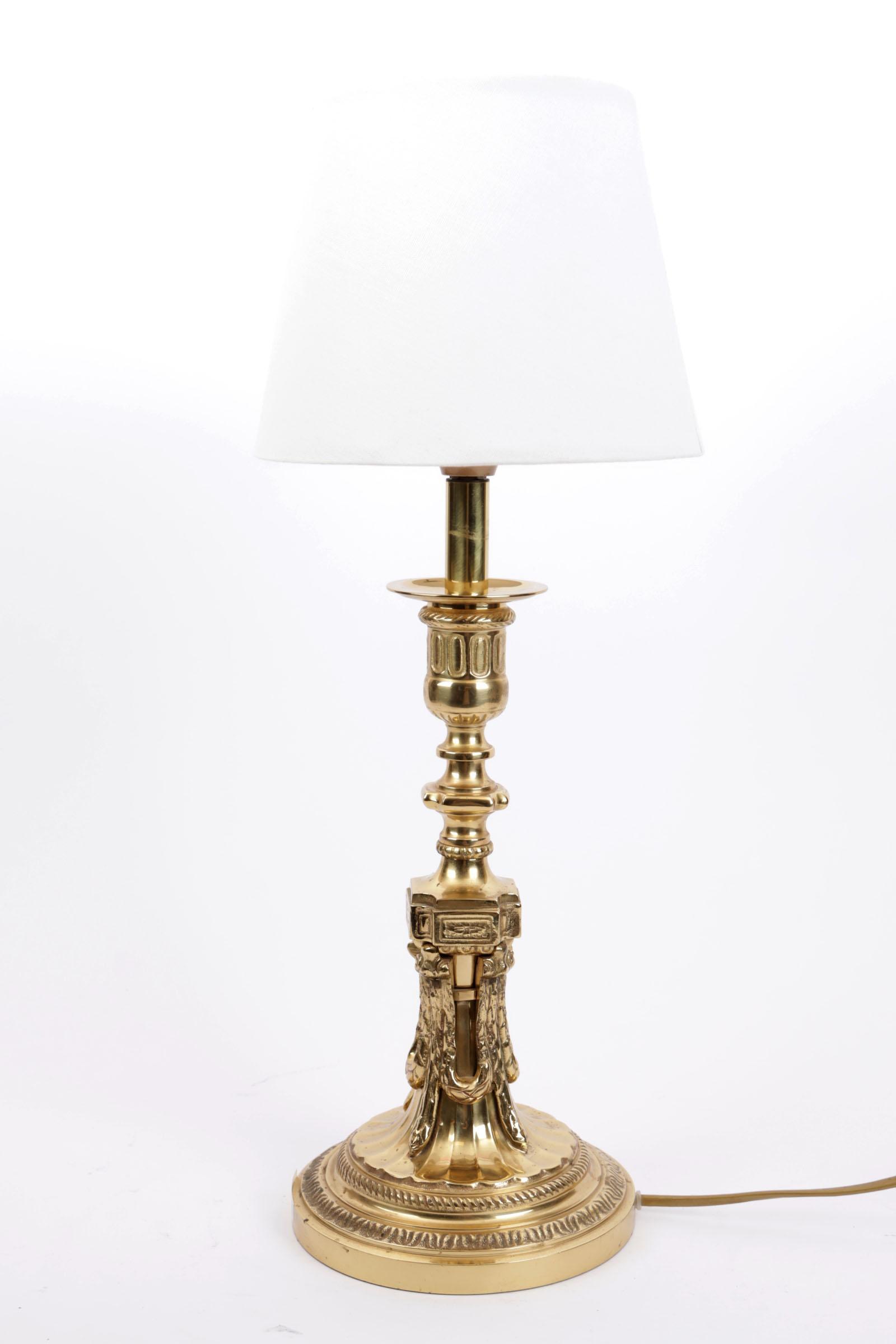 Messing schemerlamp met cannelures en guirlandes en met witte kap, Louis Seize stijl, h.50 cm.