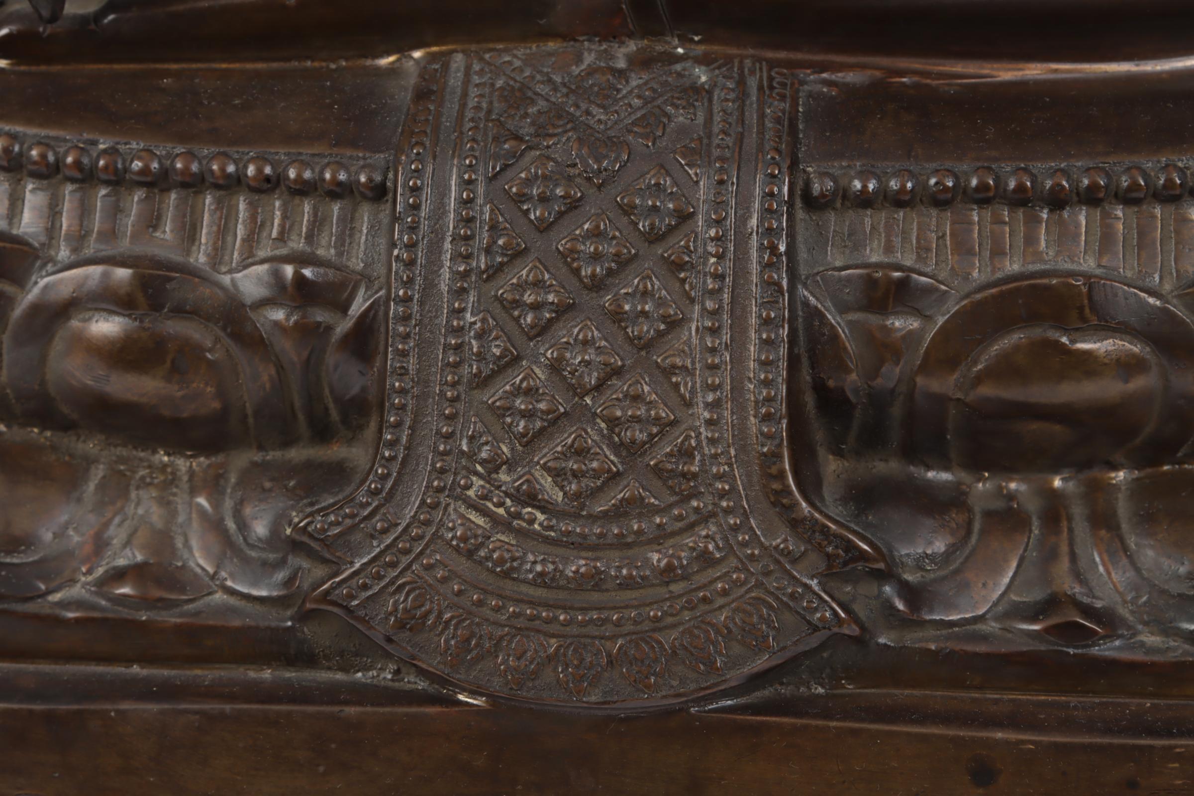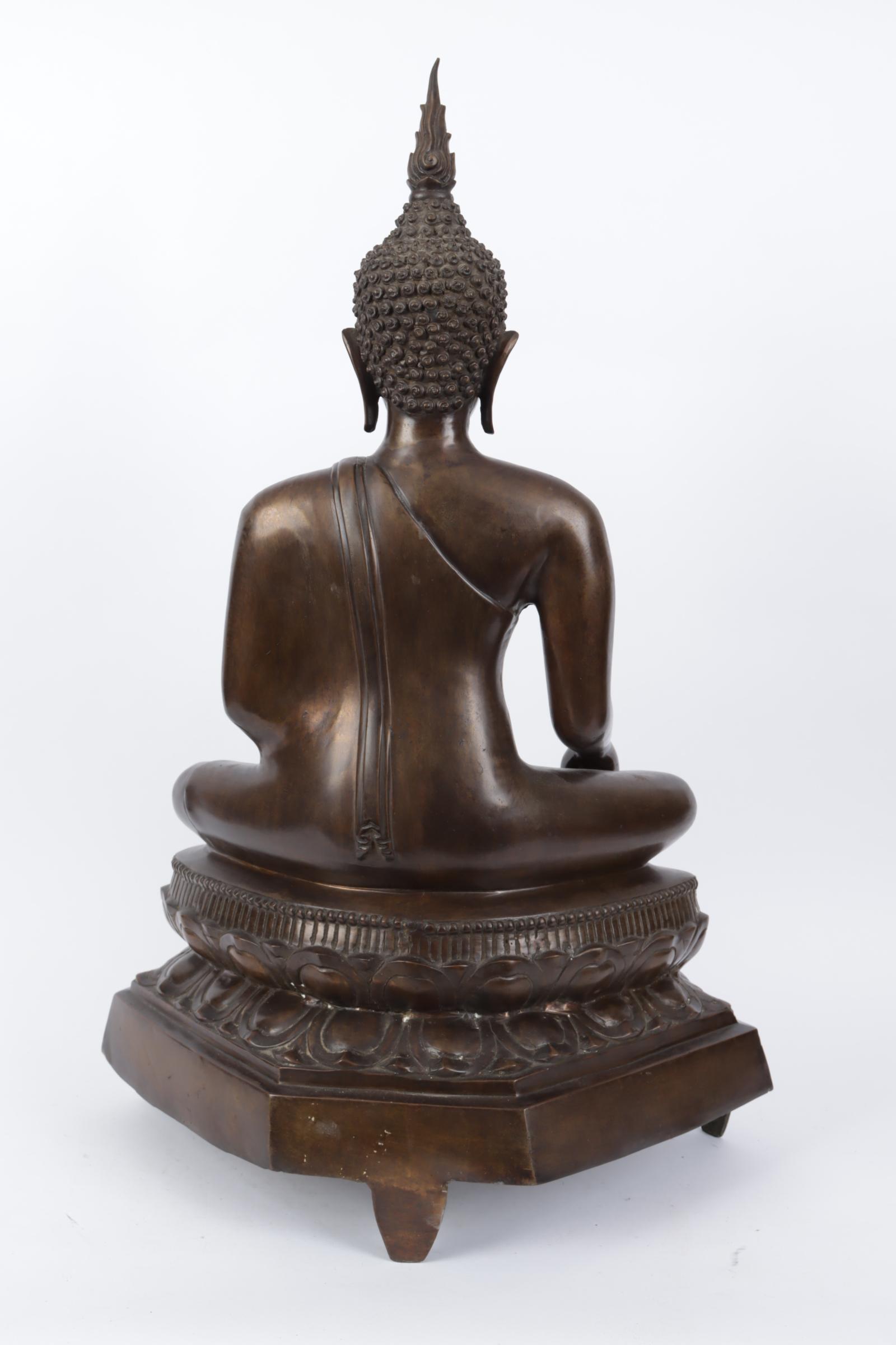 Bronzen sculptuur van een zittende Boeddha op troon, h.74 cm.