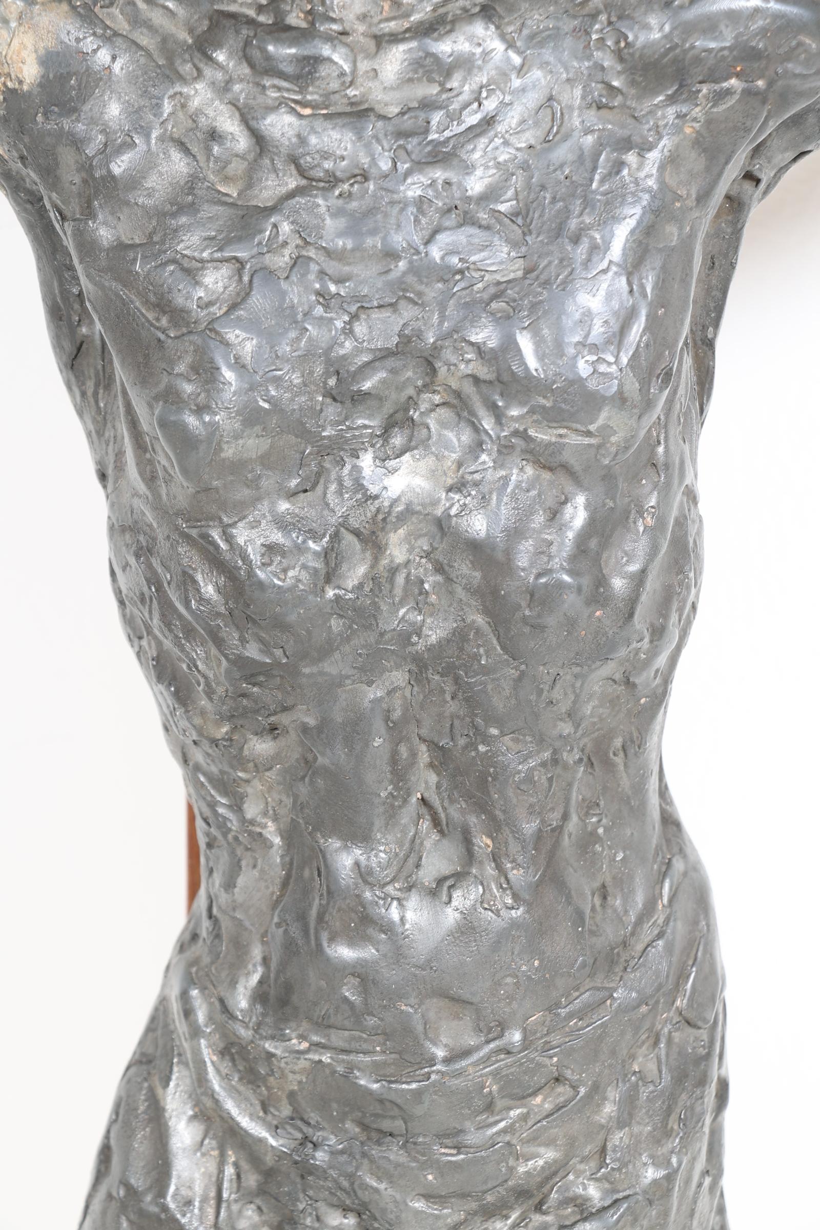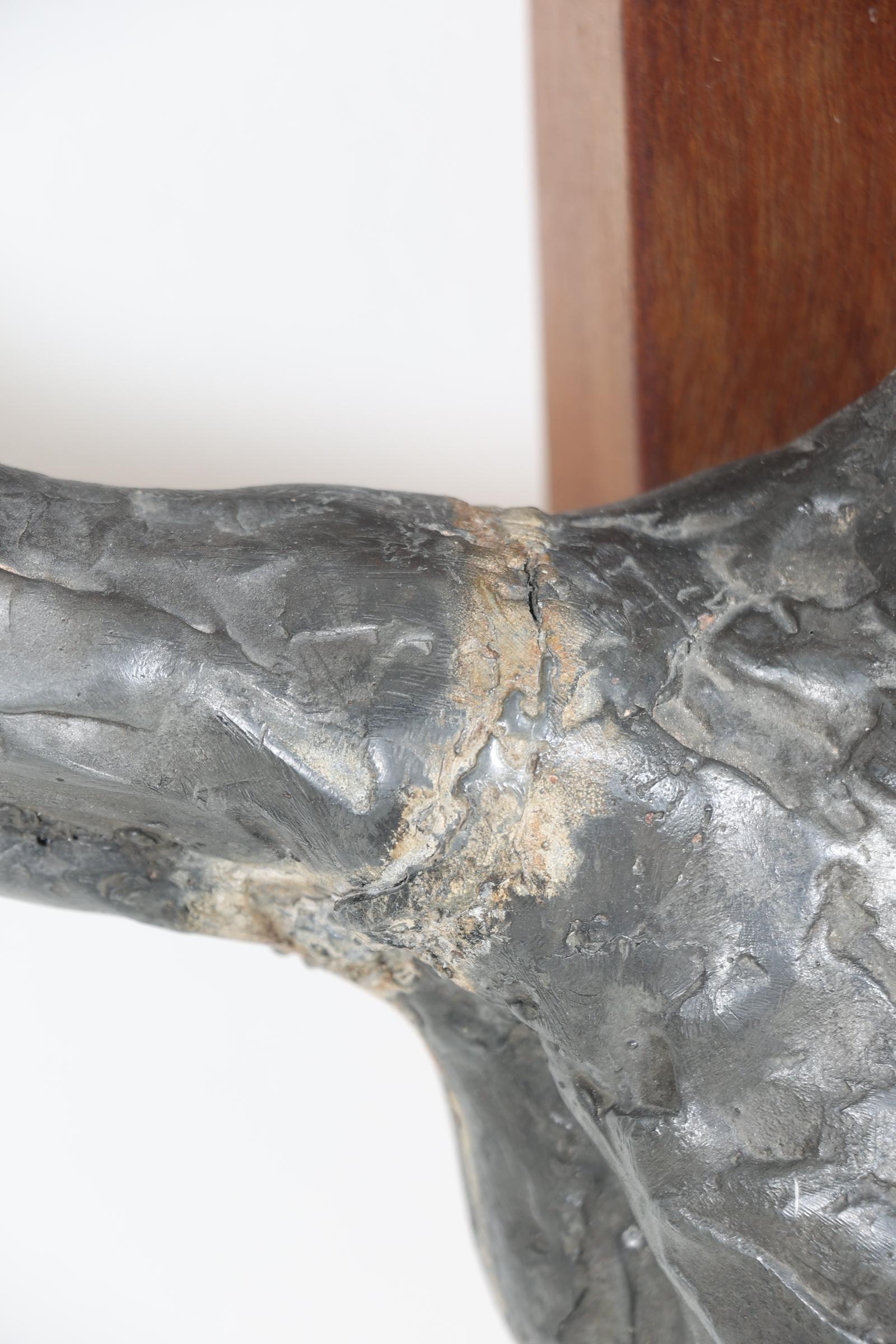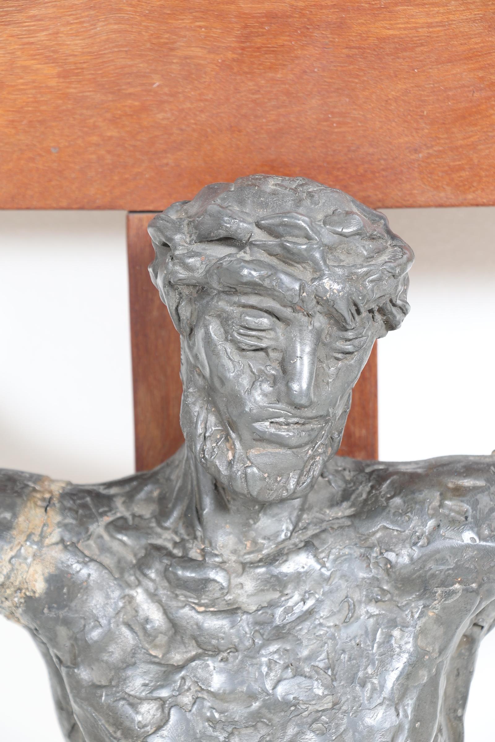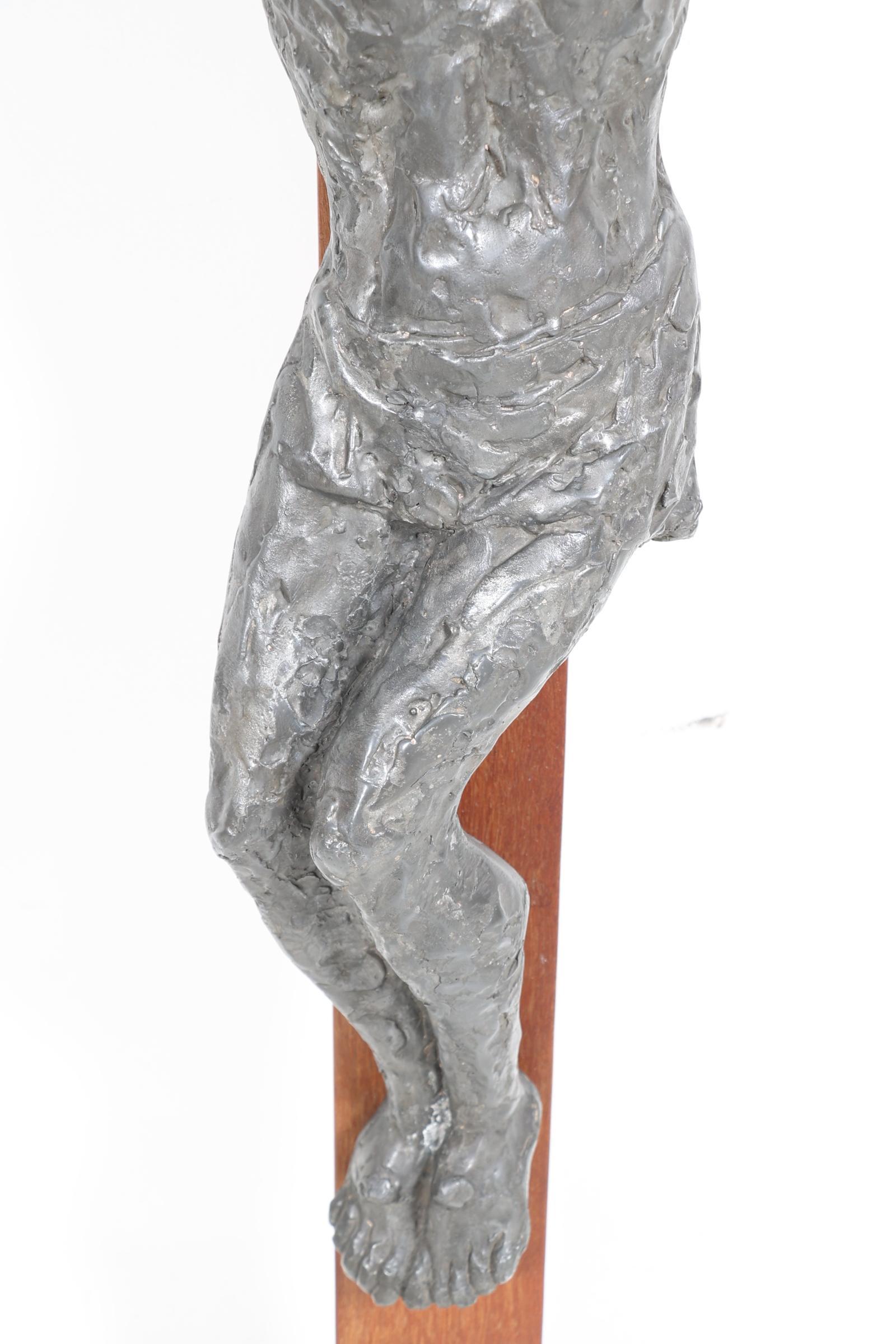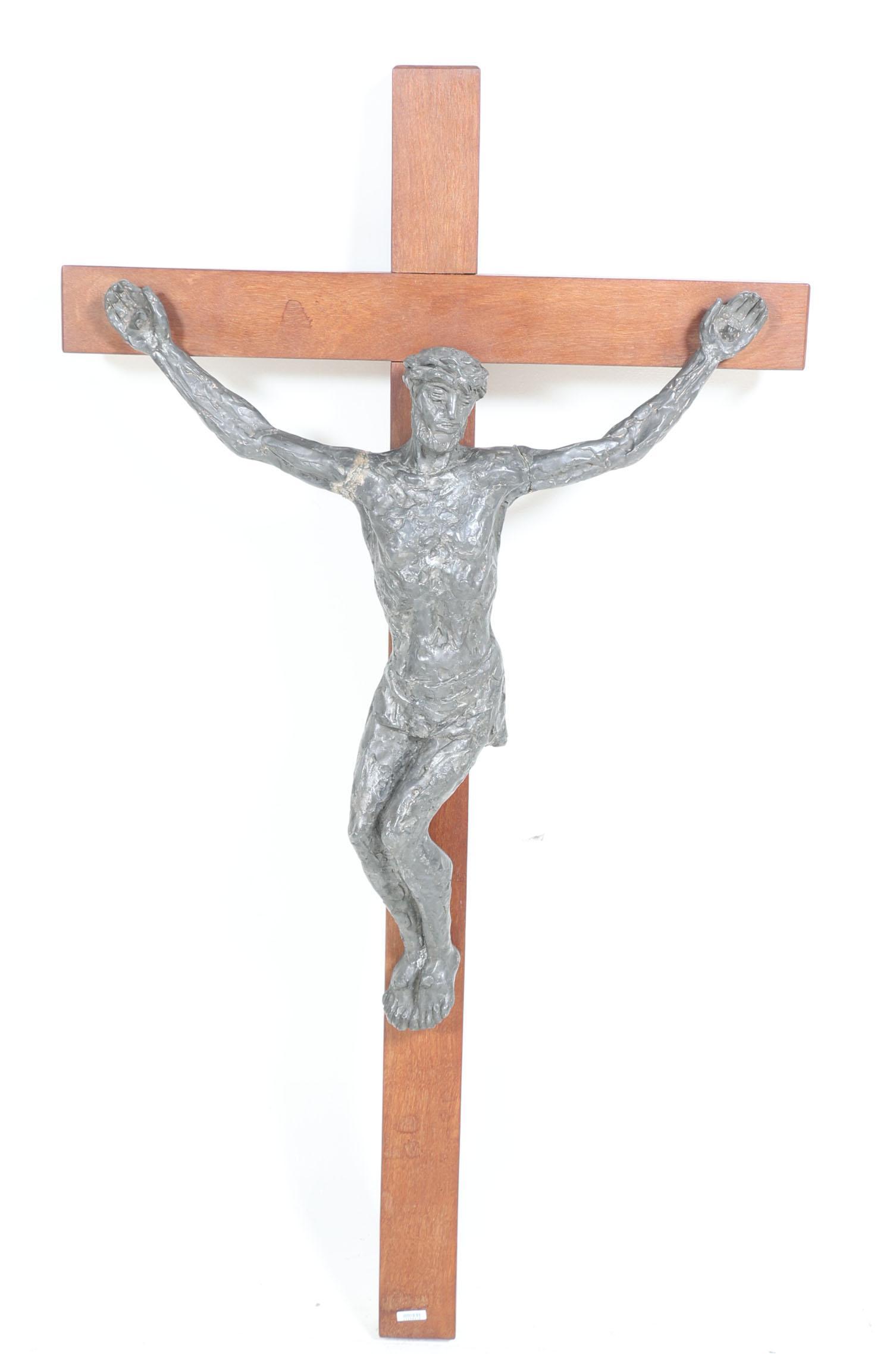 Bronskleurig legering kruisbeeld uit de kapel van het klooster mariahof in tilburg (defecten), h.140 x b.77 cm.