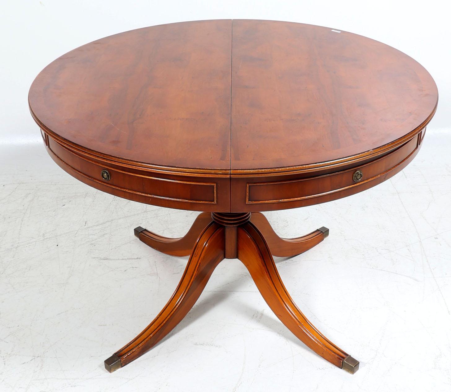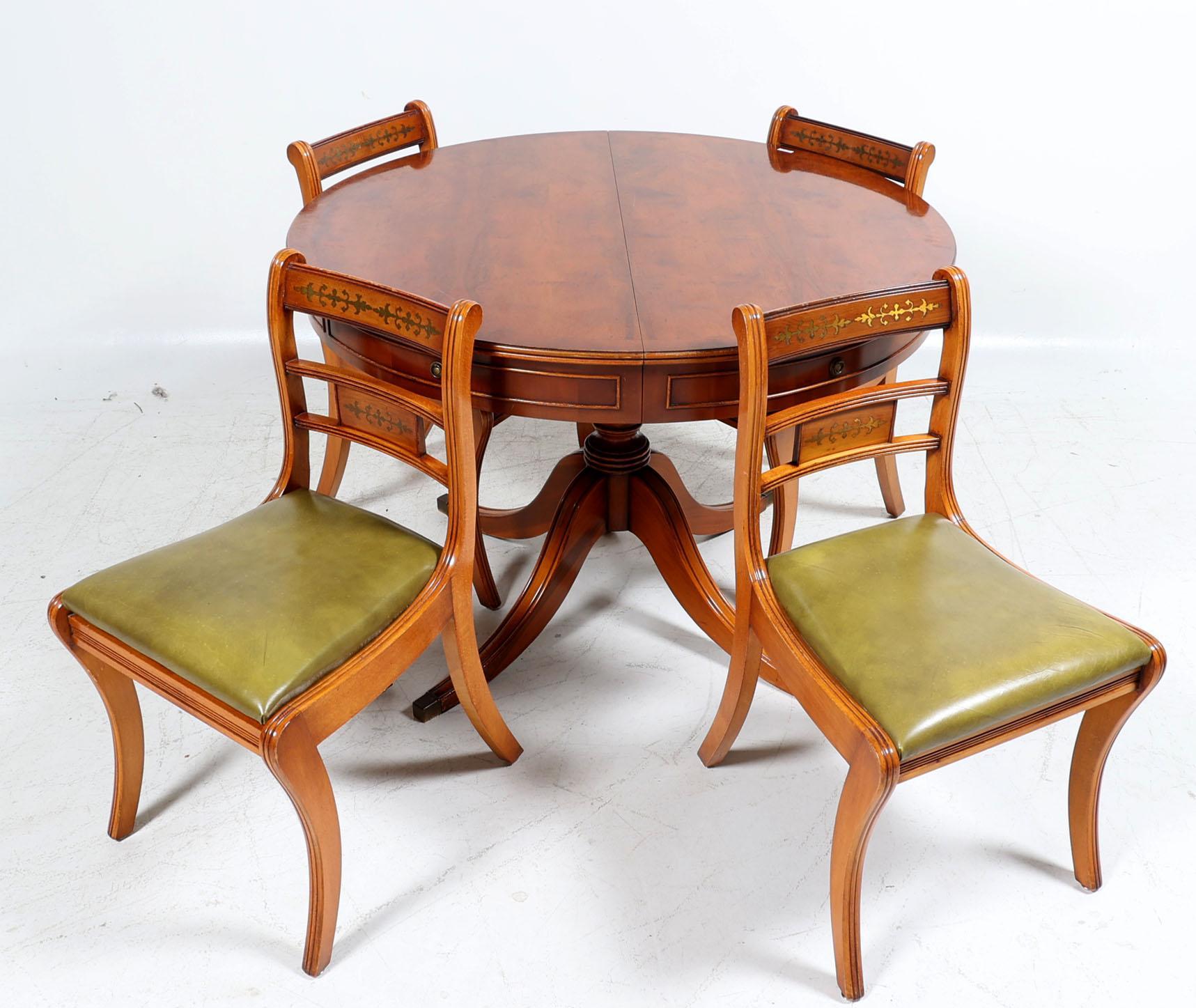 Kersenhouten eetkamertafel met tussenblad en 4 bijpassende stoelen, h.76 x diam.109 cm.
