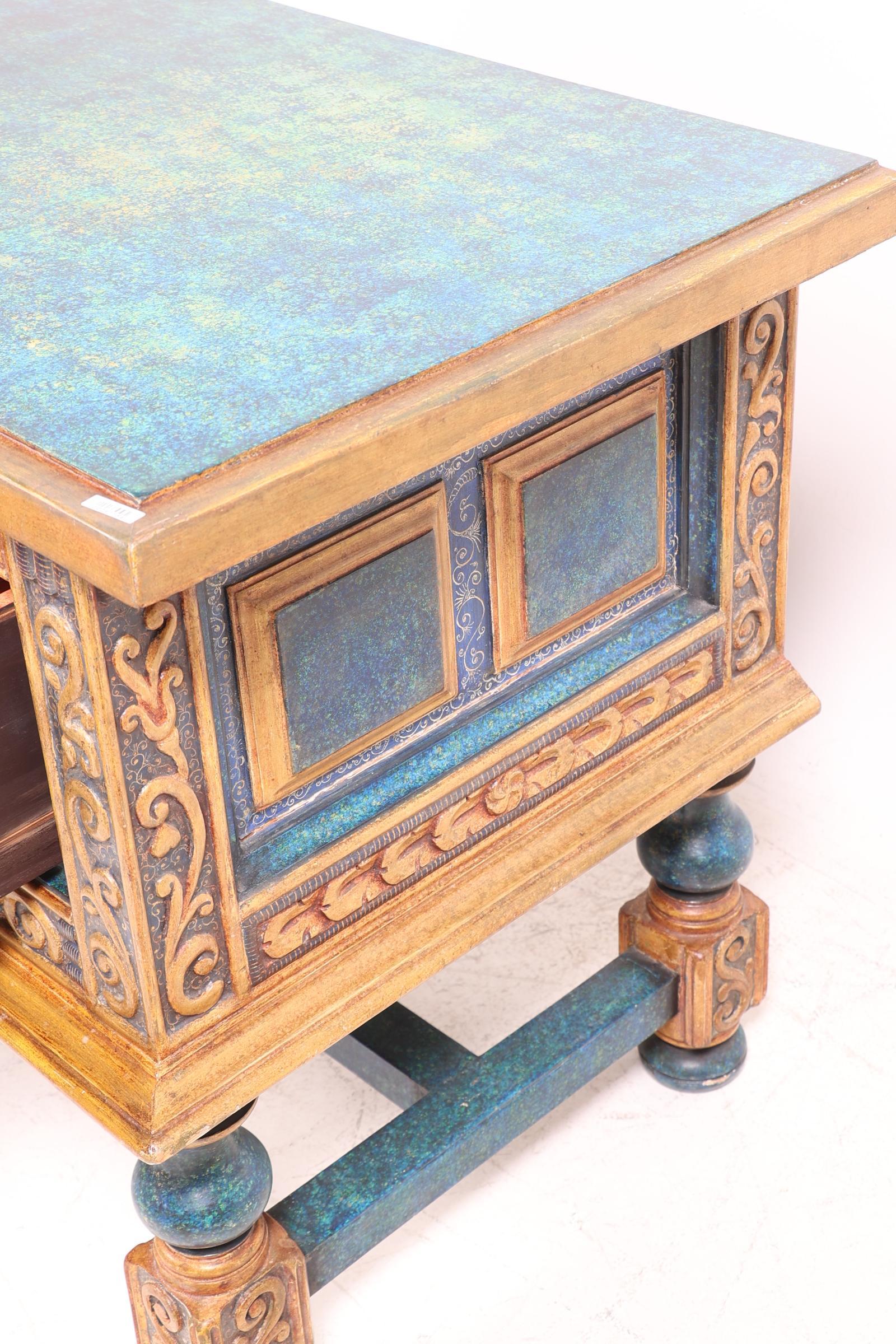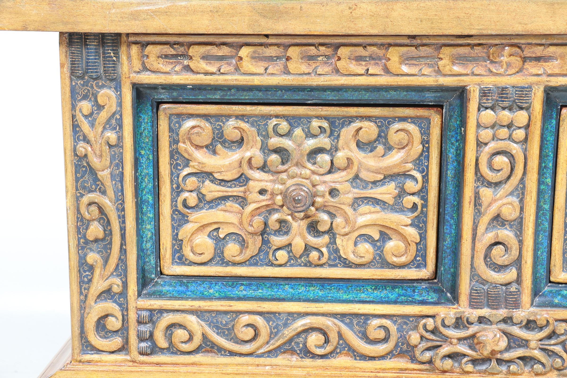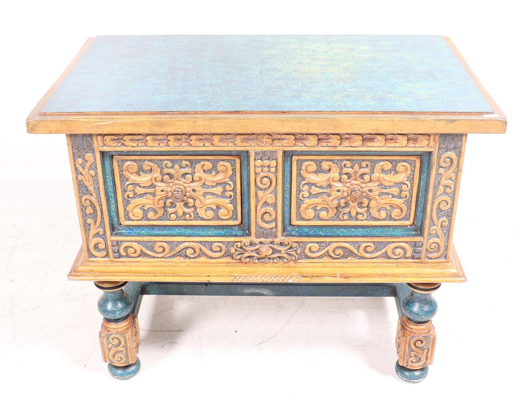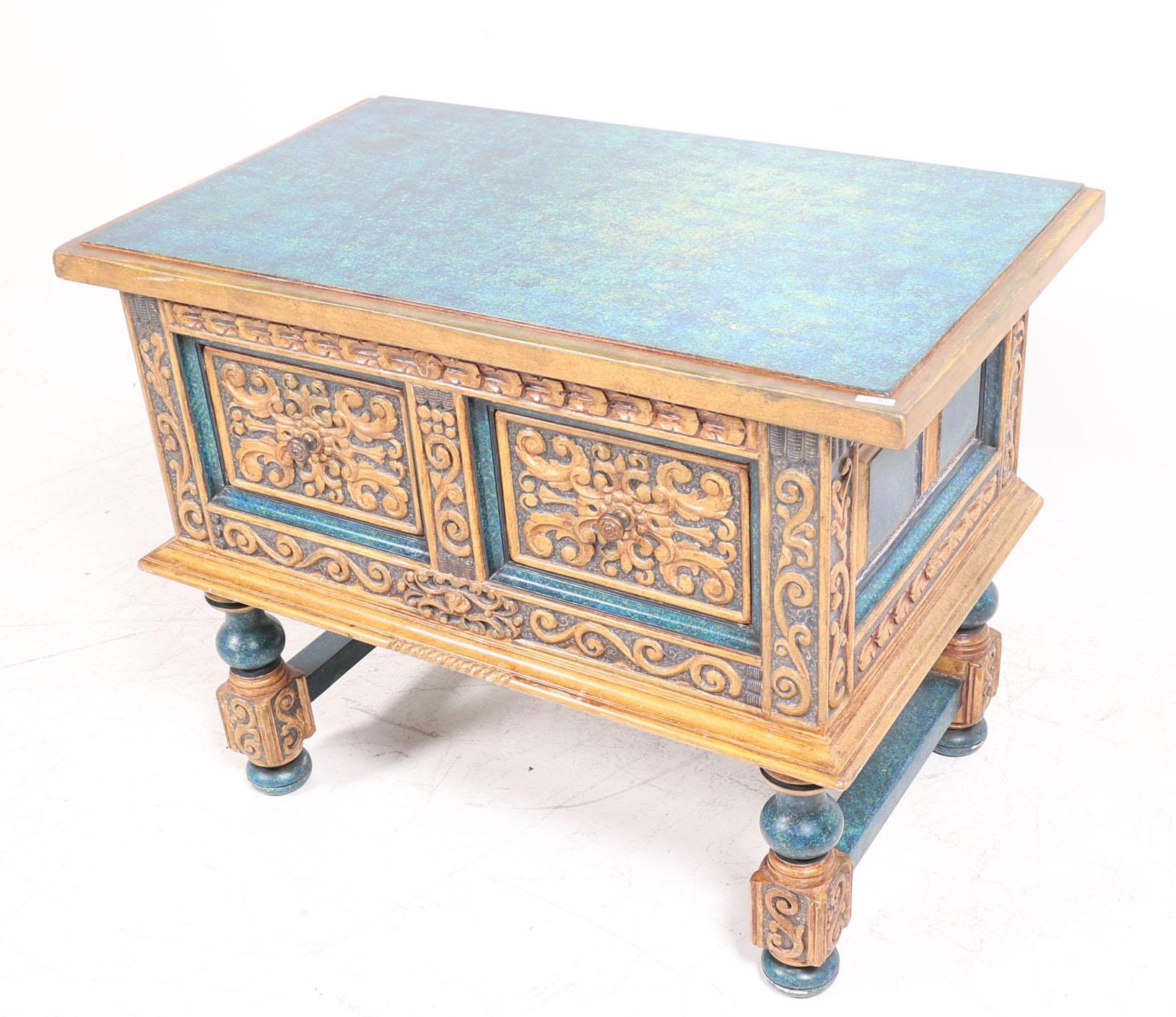 Spaanse blauw/goudkleurige 2 laden kast, h.75 x b.100 x d.58 cm.