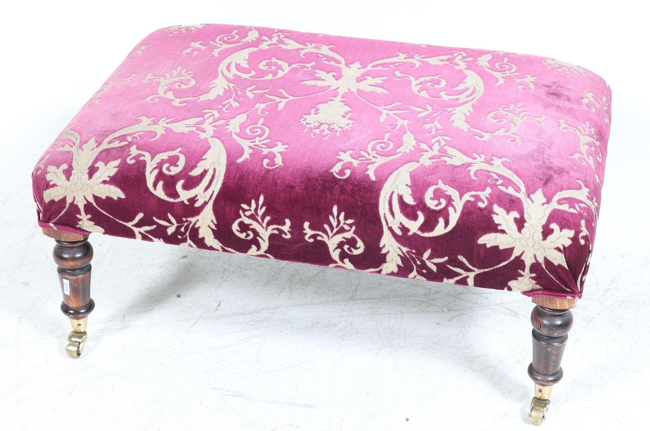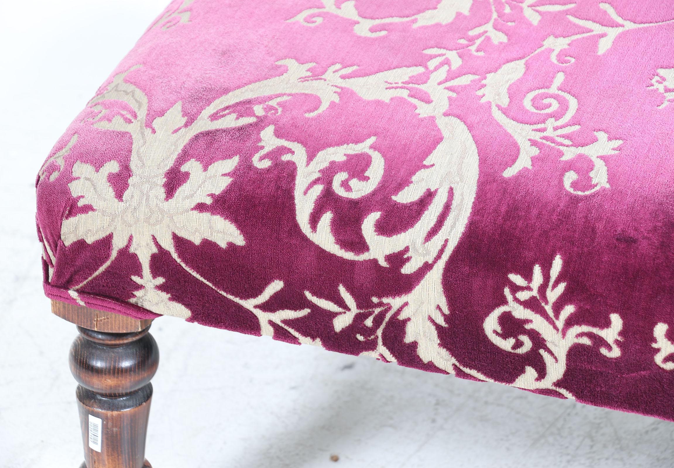 Paars gestoffeerde hocker, h.40 x b.87 x d.60 cm.
