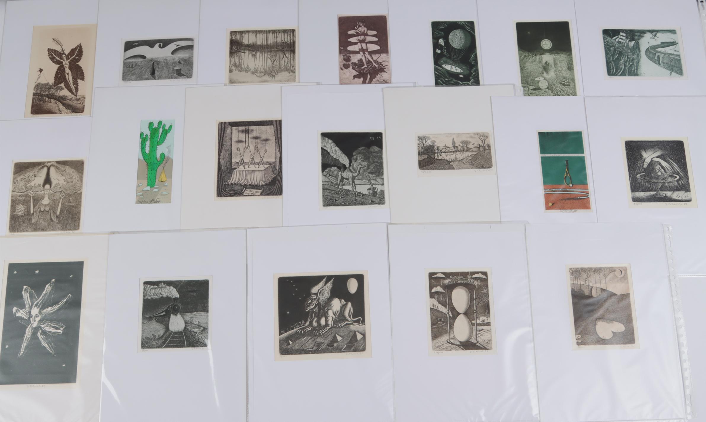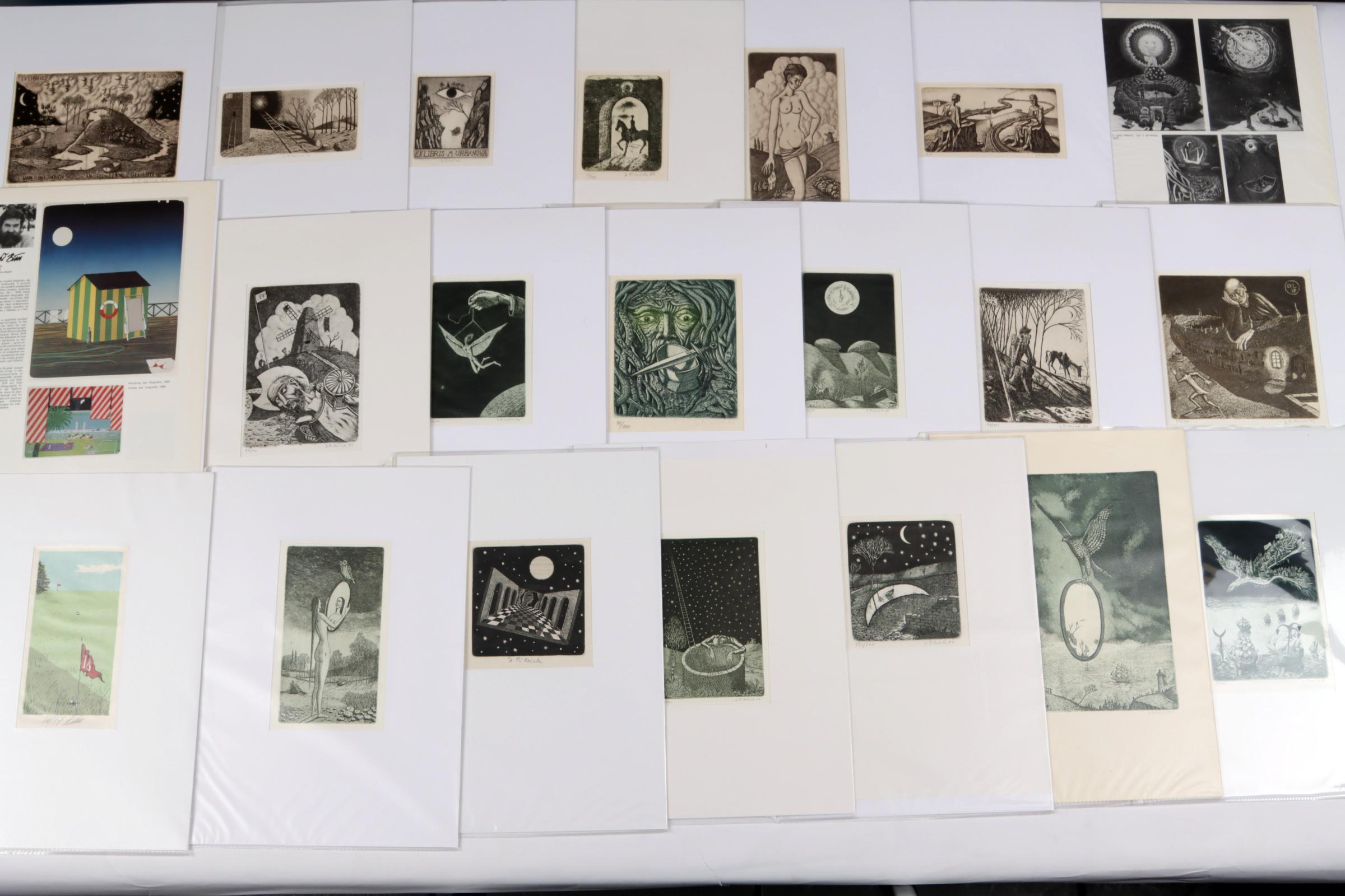 Pilecek, J. (Tsjechië), plm. 35 exlibris, diepdrukken, gesigneerd, in passe partouts. Voor o.a. I.P., J.H., Rhebergen, Urbanova, E.R., L.R., F.V.. Toegevoegd:3 exl. door Th. Bim