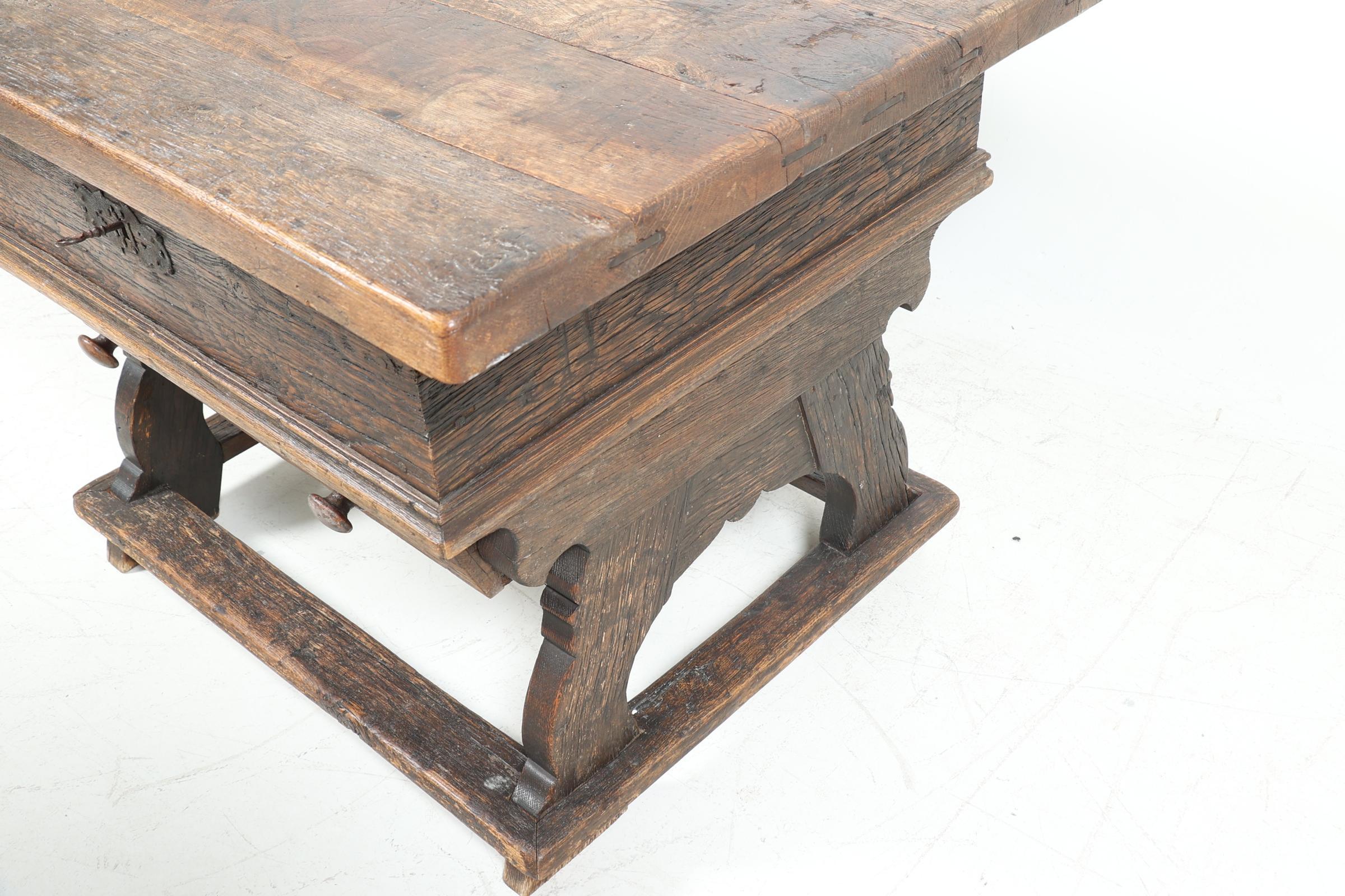 Antieke eikenhouten betaaltafel, h. 76 x b. 111 x d. 90 cm. (blad los)