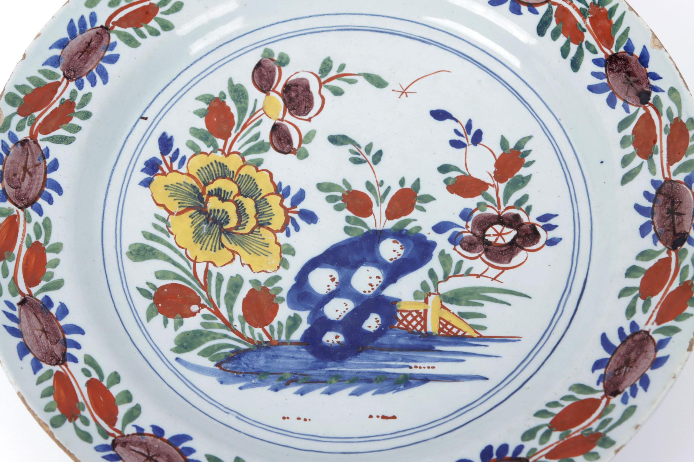 Antieke aardewerken schotel met florale motieven, diam.31 cm.