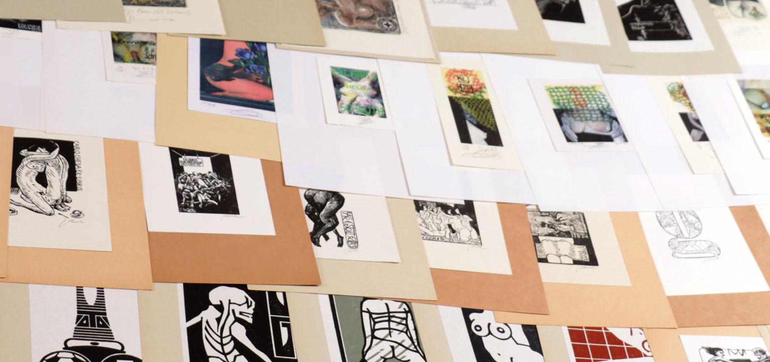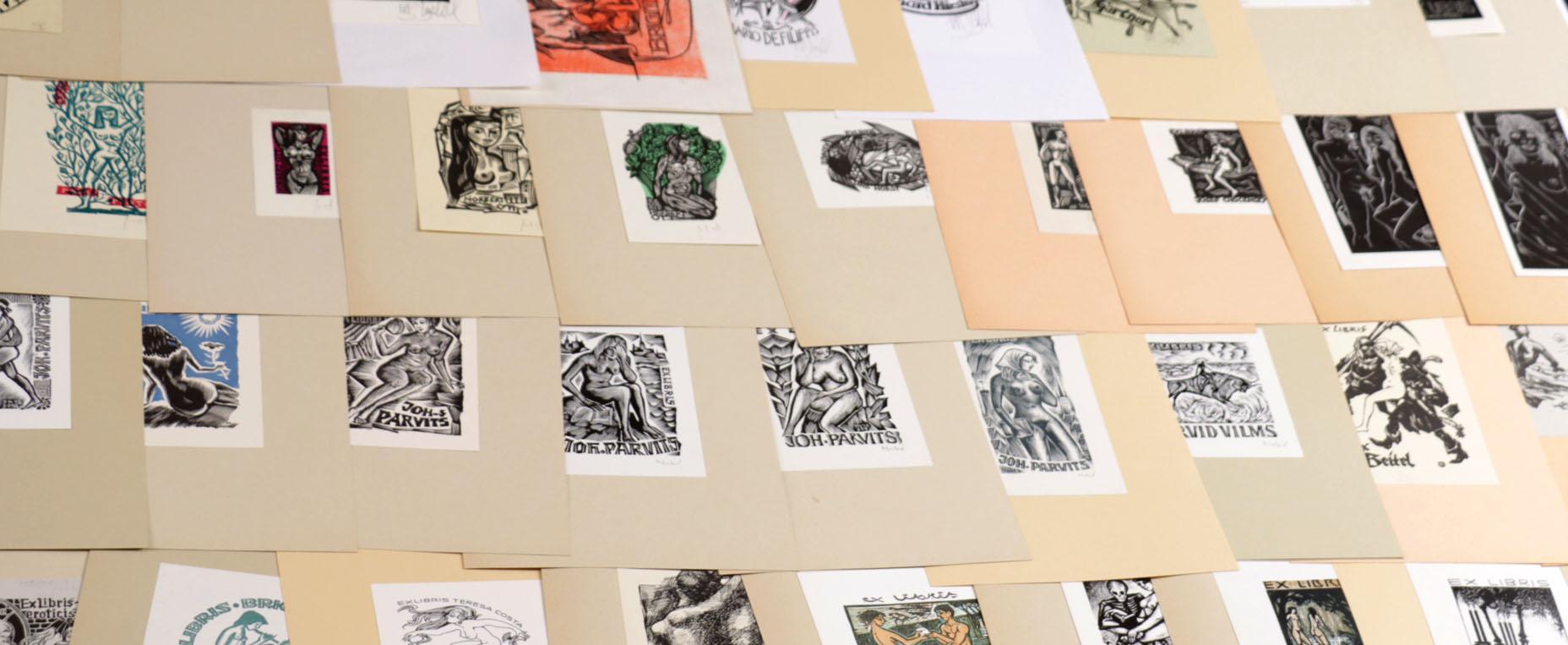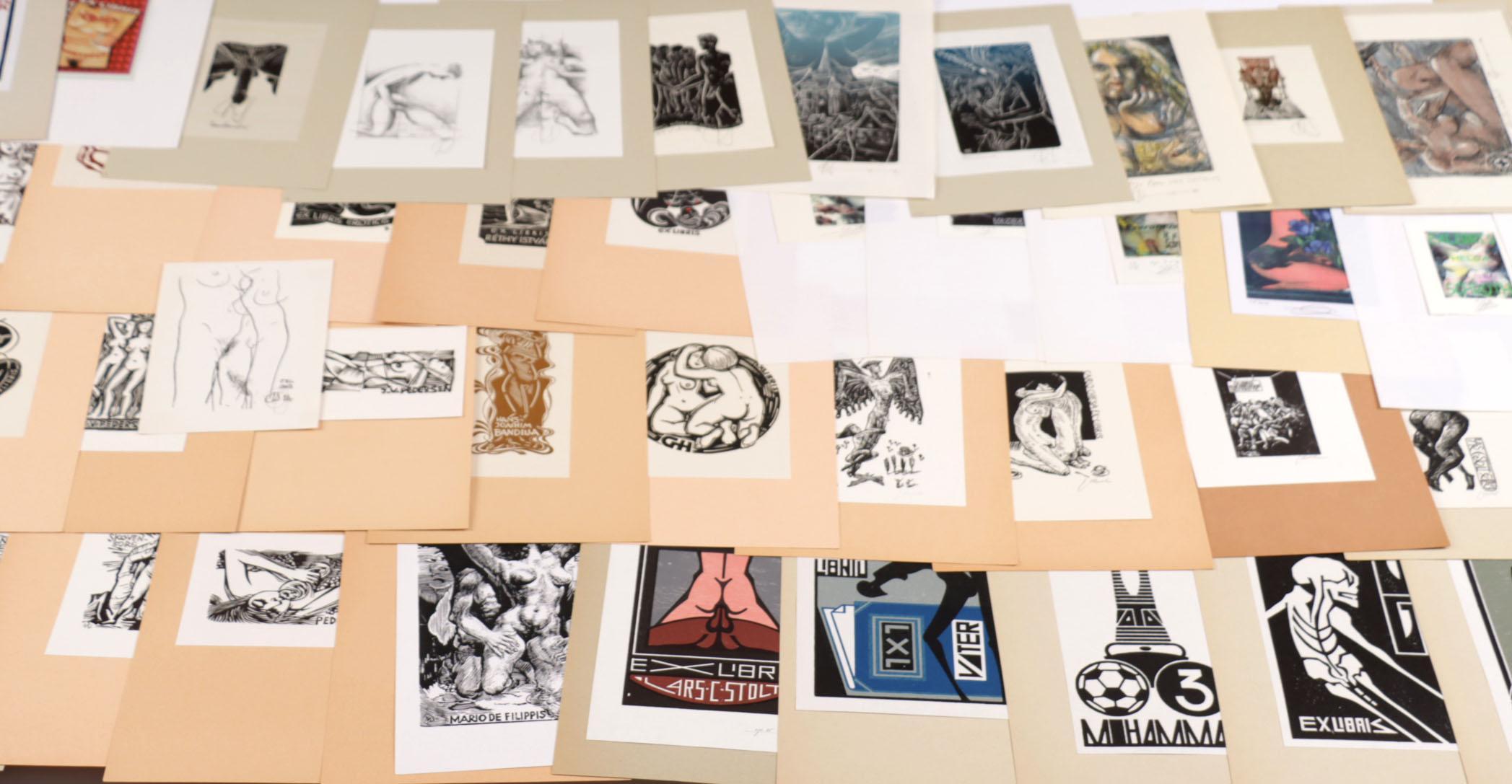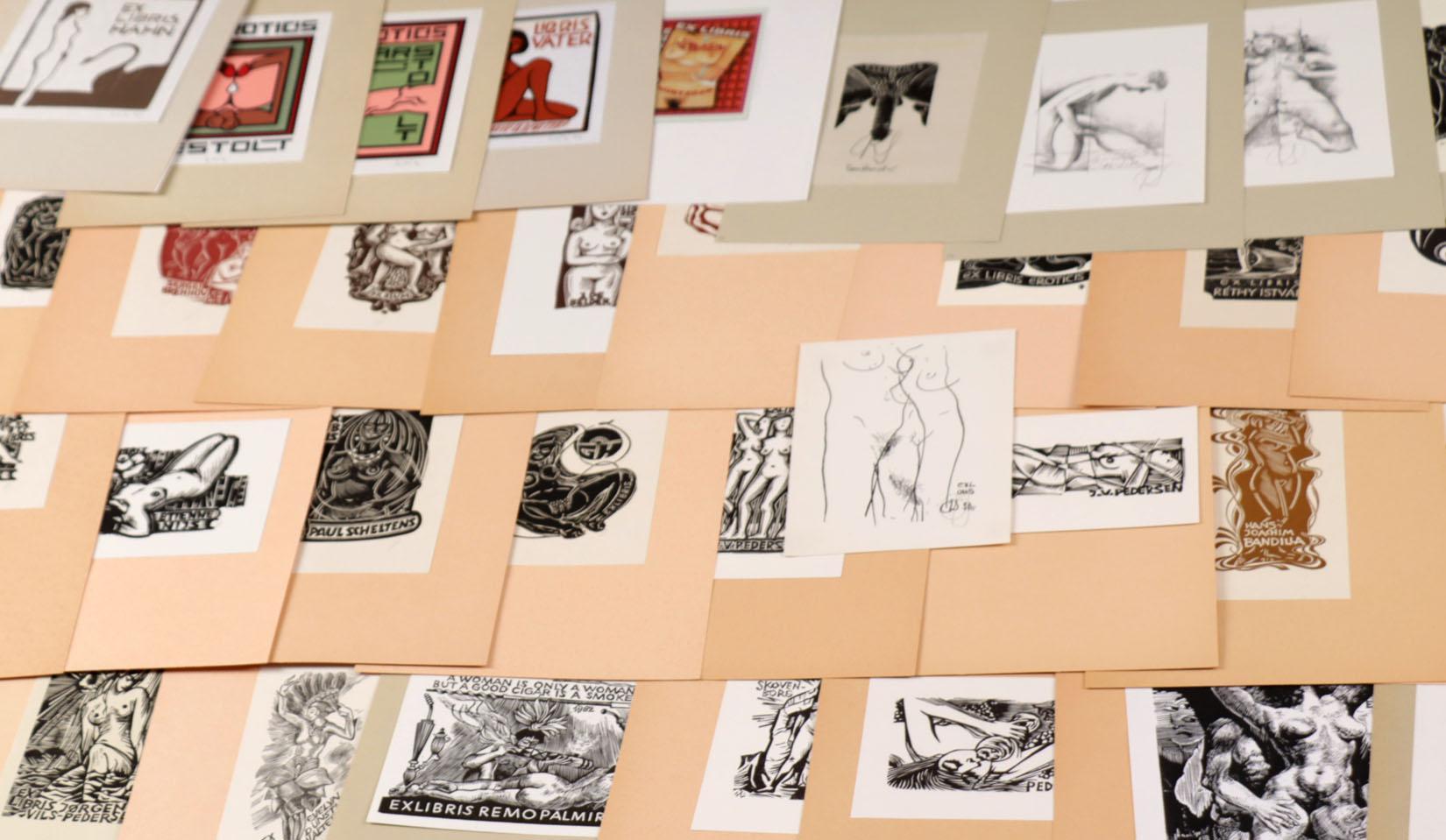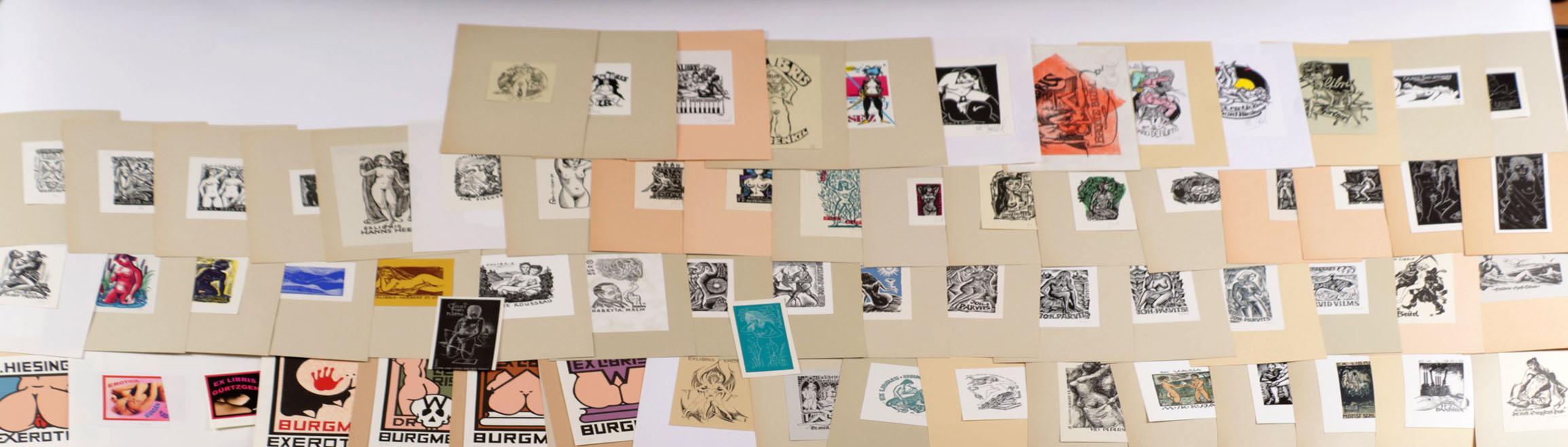 collectie plm. 135 exlibris, thema: naakt / erotiek. Gemaakt door kunstenaars uit Duitsland. Hoogdruk / vlakdruk. Deels gesigneerd, opgeplakt. Werk van o.a. Benkel (11x), Kuhn (56x), Ott (9x), Haha (10x), Rockenberger (6x), Schroth (13x), Zierold (13x).