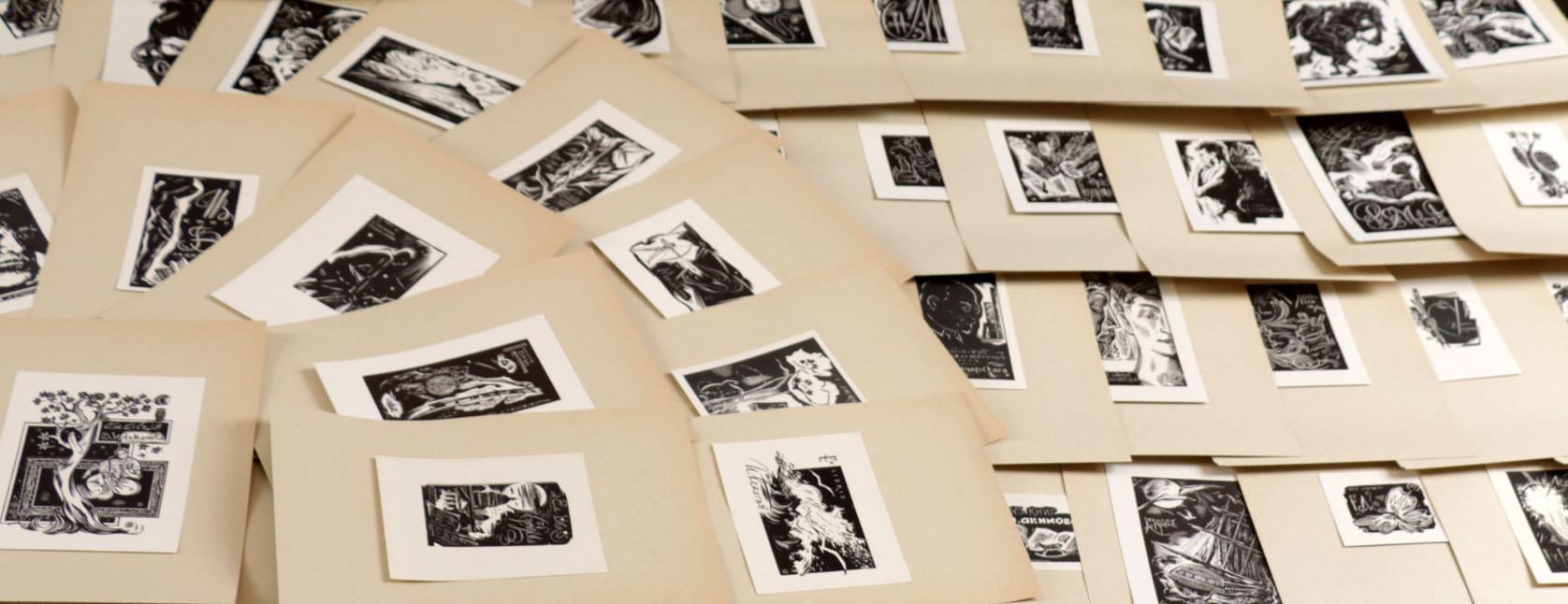 collectie plm. 170 Russische exlibris, hoogdruk / vlakdruk, deels gesigneerd, opgeplakt. Werk van o.a. Kulmesjkenov (75x), Goljachovsky (95x).