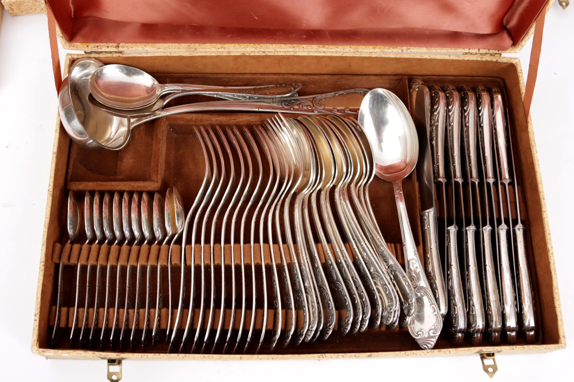 Solingen, verzilverd bestek in Louis XV/Rococo-stijl, in vijf vintage opberg cassettes